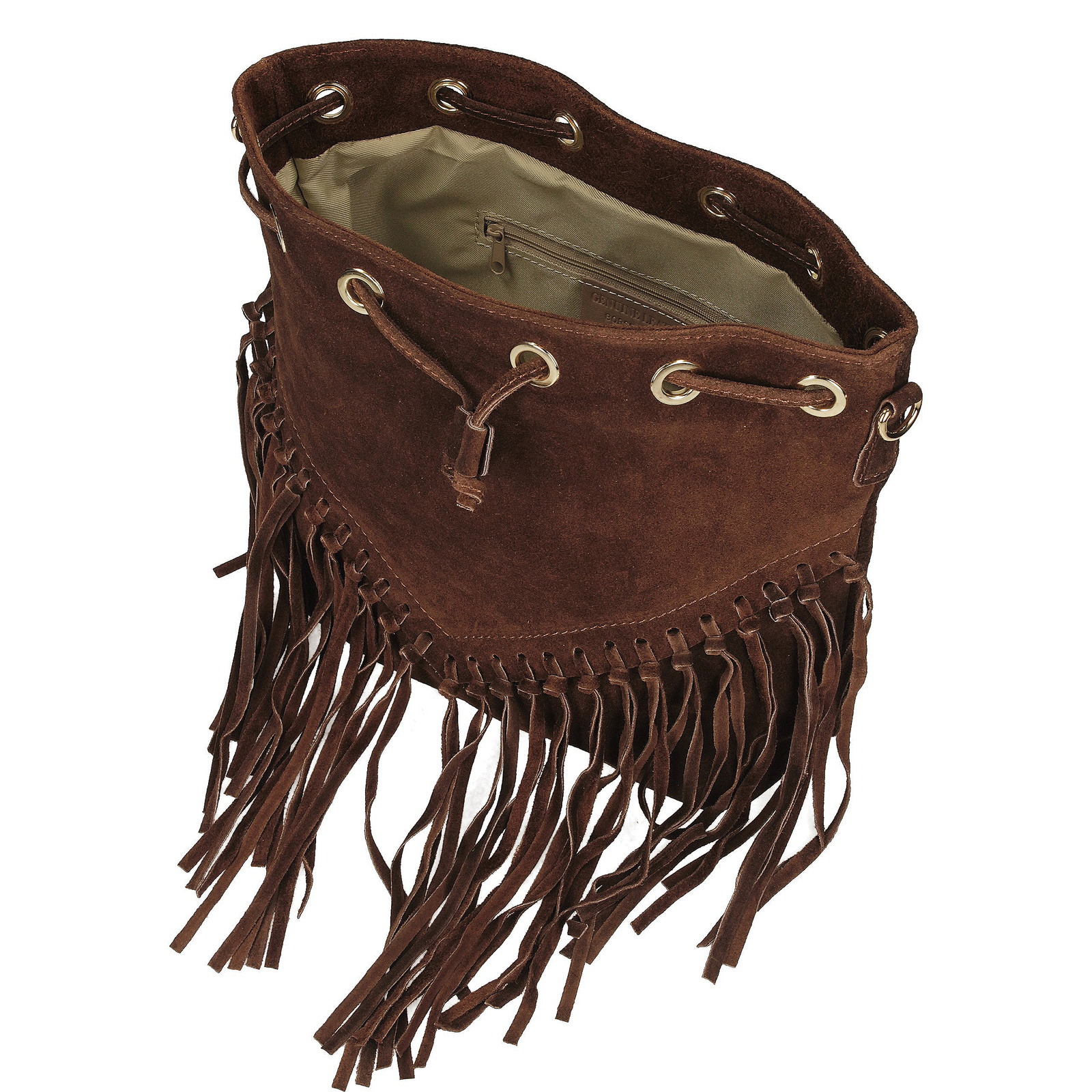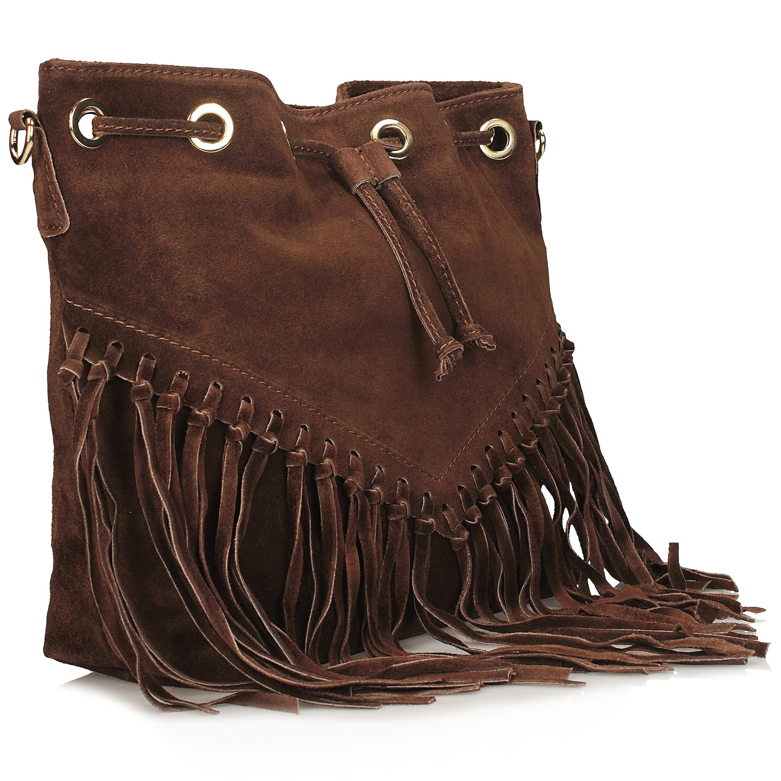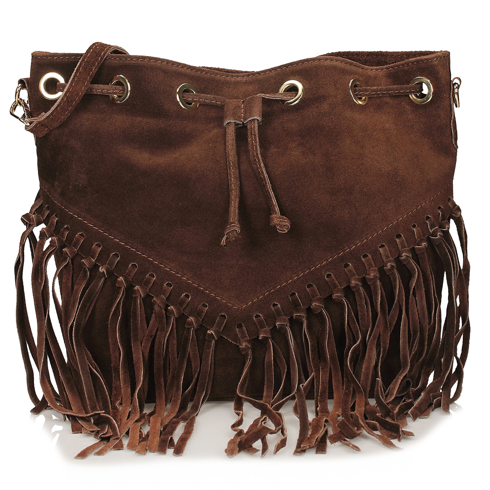 Brązowa listonoszka Toscanio to propozycja dla kobiet ceniących swobodny, miejski styl z nutą boho. W całości wykonana ze skóry naturalnej zamszowej, przyciąga uwagę miękką fakturą i długimi frędzlami, które swobodnie opadają od połowy torebki, nadając jej wyjątkowego charakteru.