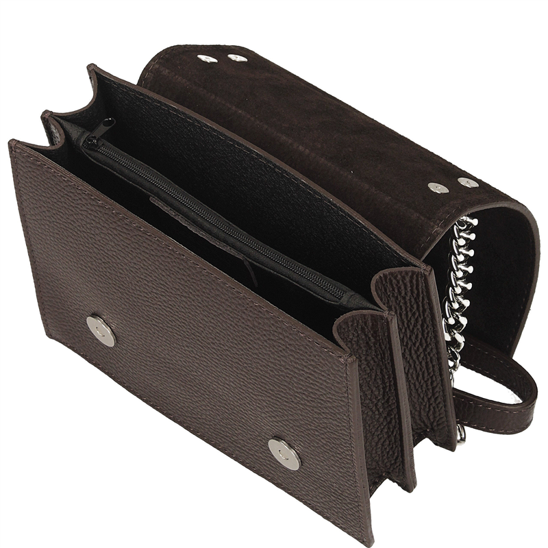 Kompaktowy rozmiar (14 × 20 × 6 cm) sprawia, że torebka idealnie sprawdza się zarówno na co dzień, jak i na wieczorne wyjścia. Wnętrze wykończone miękką tkaniną kryje dwie komory oraz jedną kieszeń wewnętrzną, co pozwala zachować porządek w drobiazgach.
