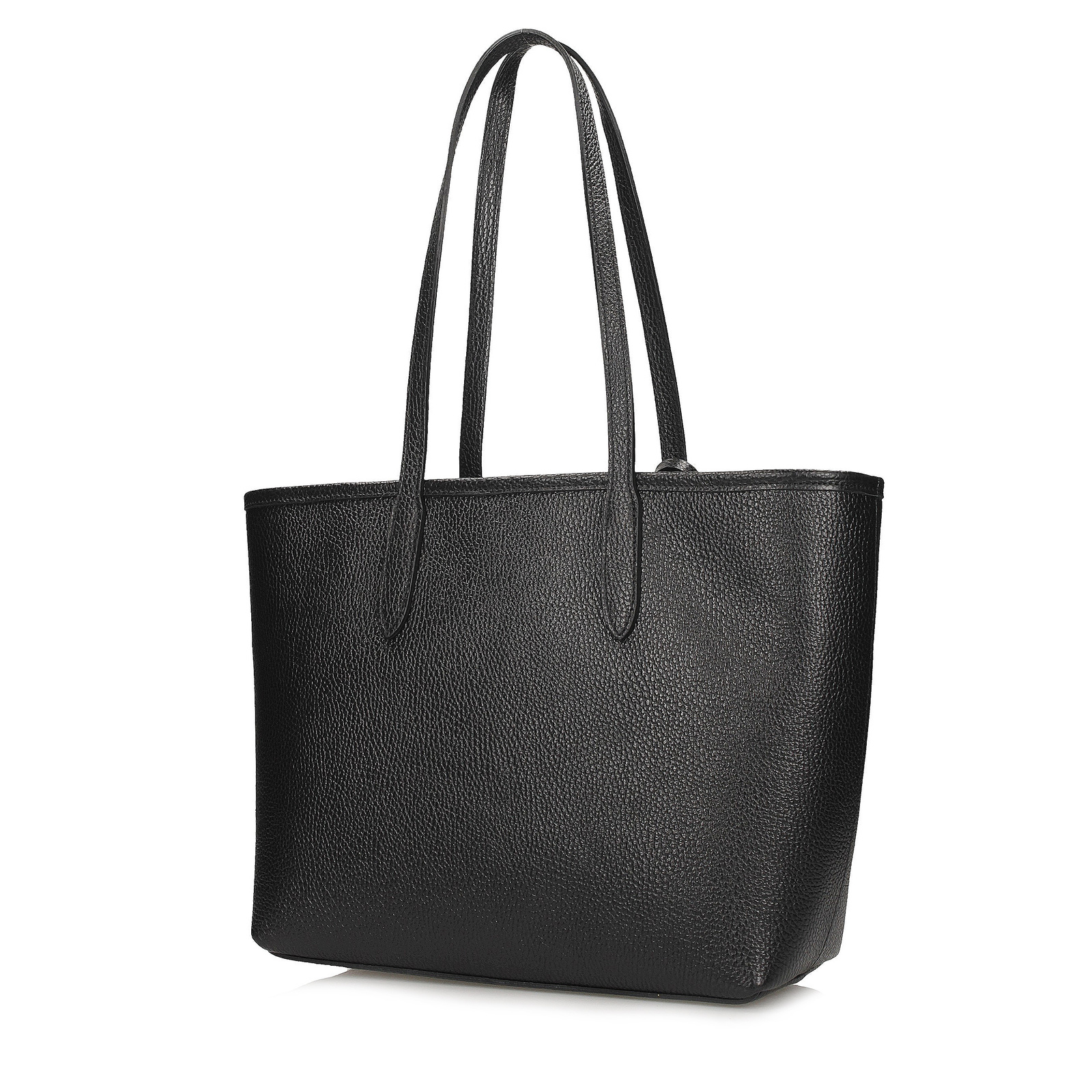 Torebka zamykana jest na metalowy zamek w kolorze srebra, a usztywniona konstrukcja pięknie trzyma formę. Długie, 50-centymetrowe uszy pozwalają wygodnie nosić ją na ramieniu. Klasyczna czerń w połączeniu z delikatnym połyskiem skóry nadaje całości elegancki, uniwersalny charakter – to model, który z powodzeniem dopełni zarówno codzienne, jak i bardziej formalne stylizacje.