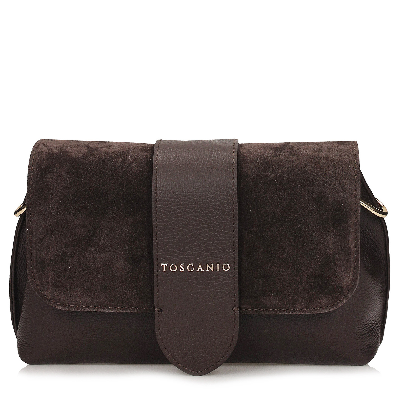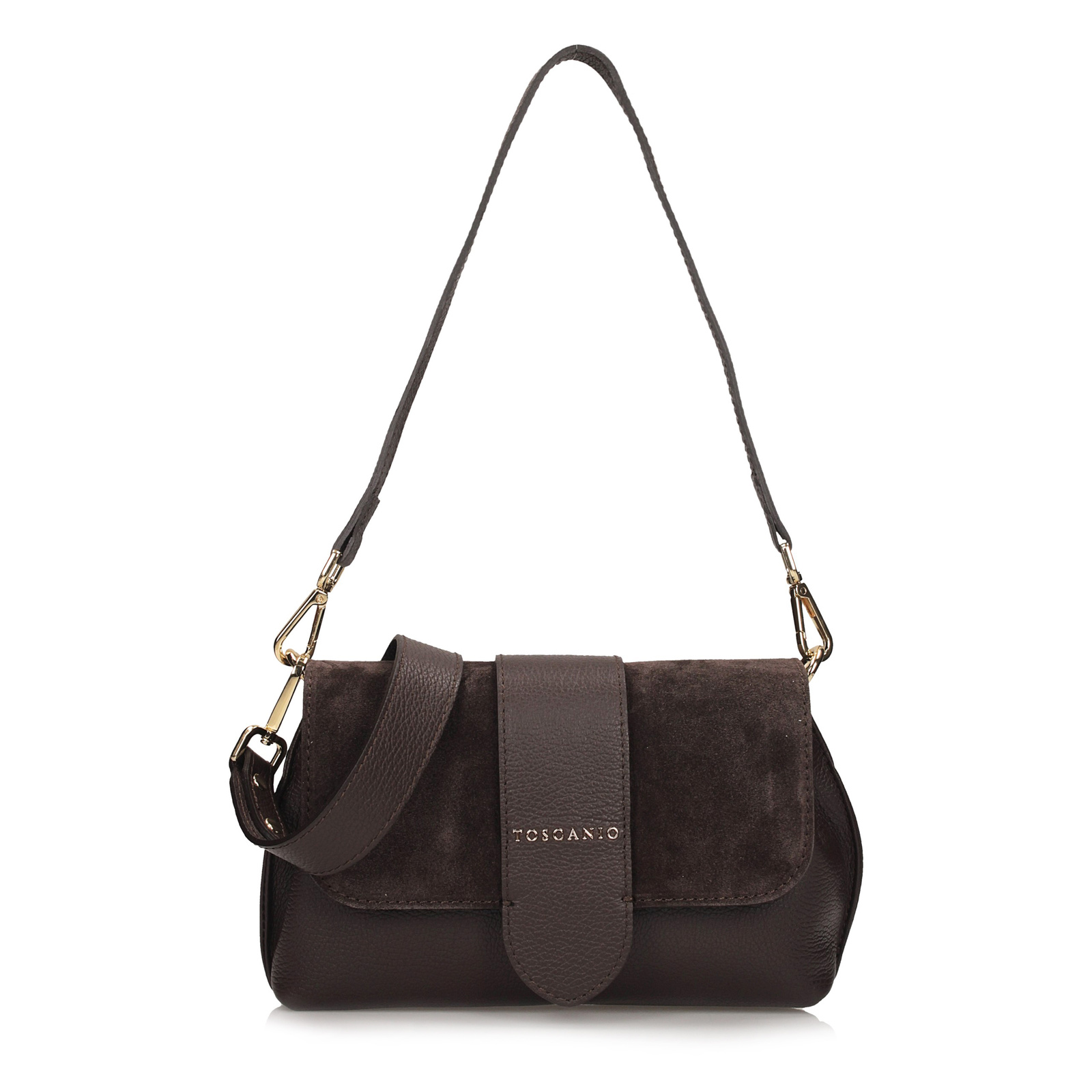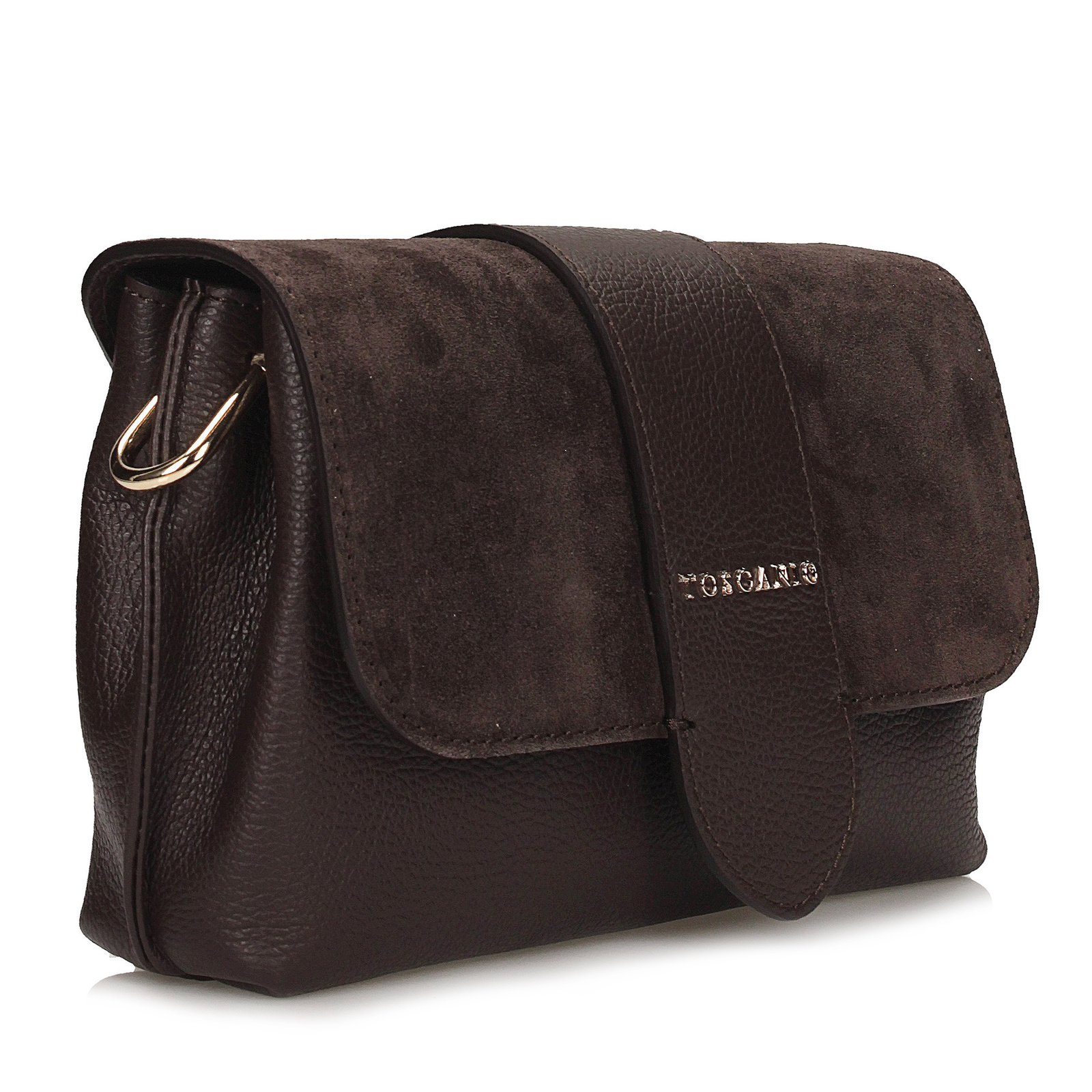 Torebka Toscanio w kolorze brązowym to elegancki model łączący klasyczny styl z subtelnym, nowoczesnym akcentem. Wykonana z wysokiej jakości skóry naturalnej, wyróżnia się klapką wykończoną zamszową wstawką, która dodaje całości wyjątkowego charakteru i głębi.