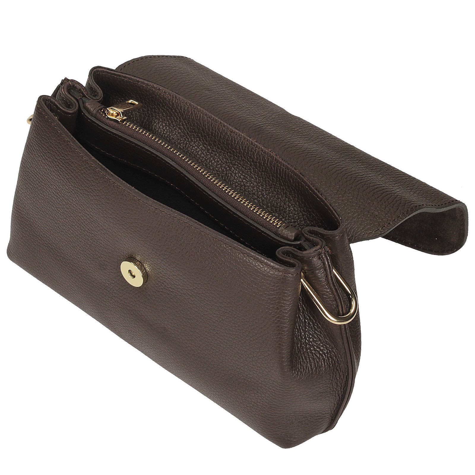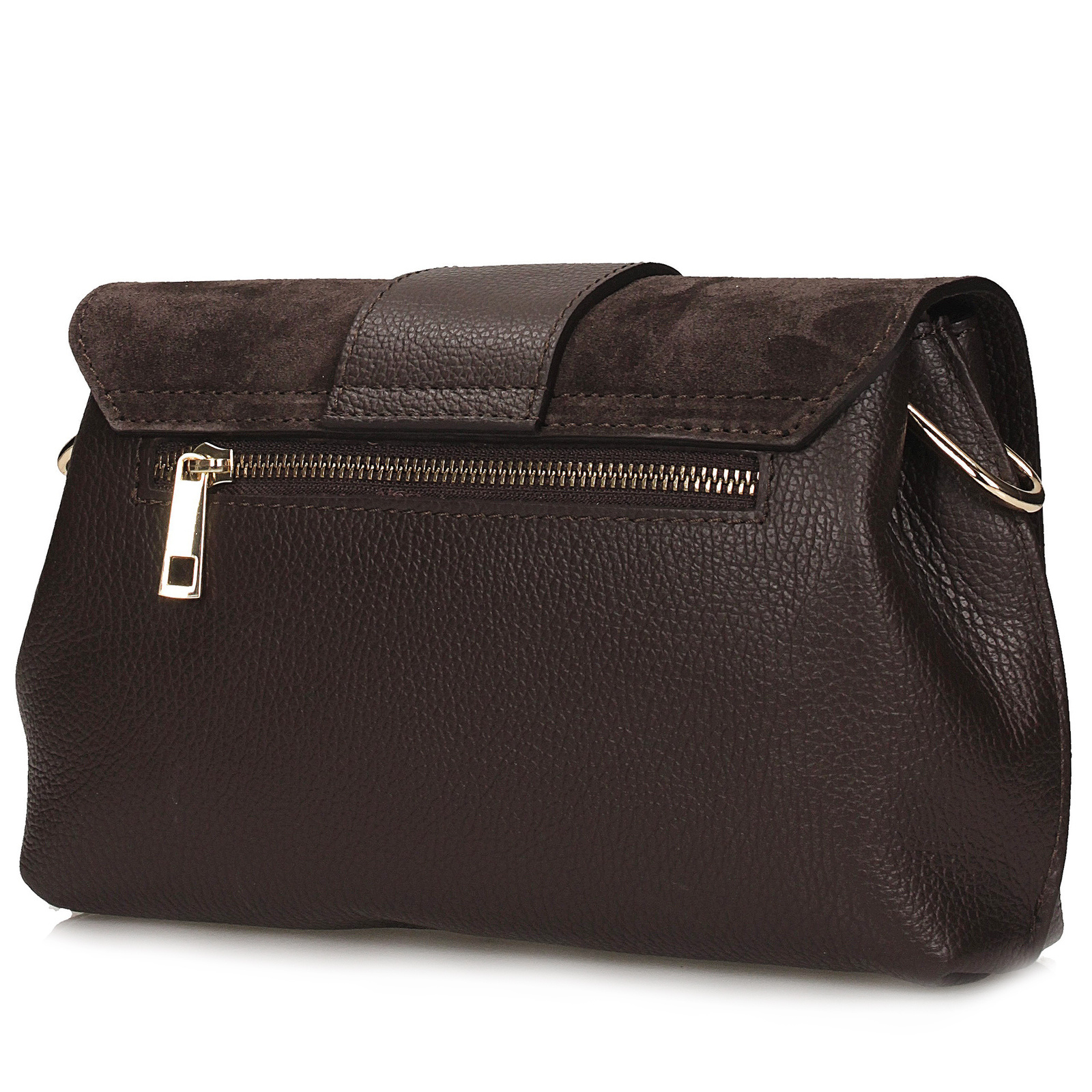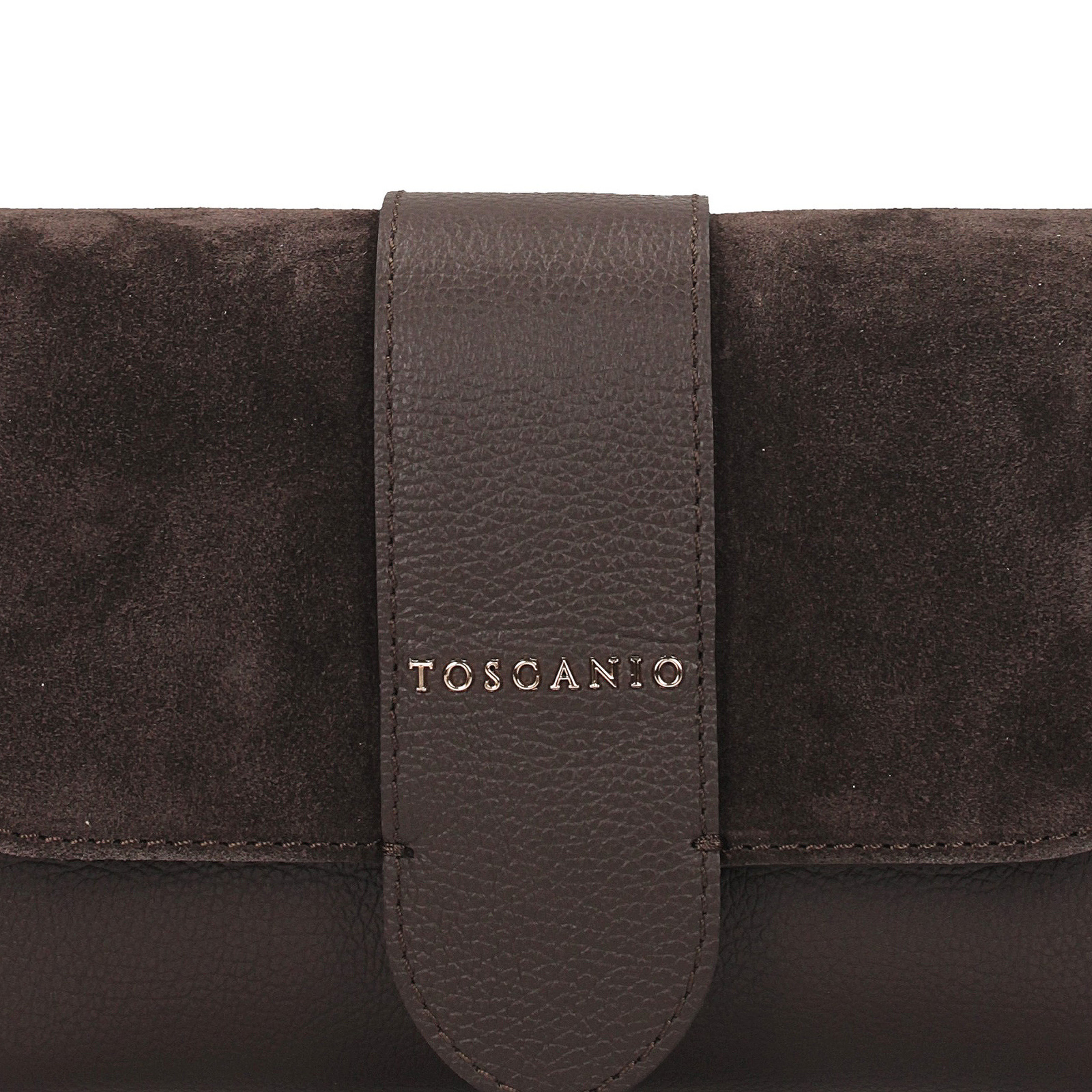 Torebka Toscanio w kolorze brązowym to elegancki model łączący klasyczny styl z subtelnym, nowoczesnym akcentem. Wykonana z wysokiej jakości skóry naturalnej, wyróżnia się klapką wykończoną zamszową wstawką, która dodaje całości wyjątkowego charakteru i głębi.