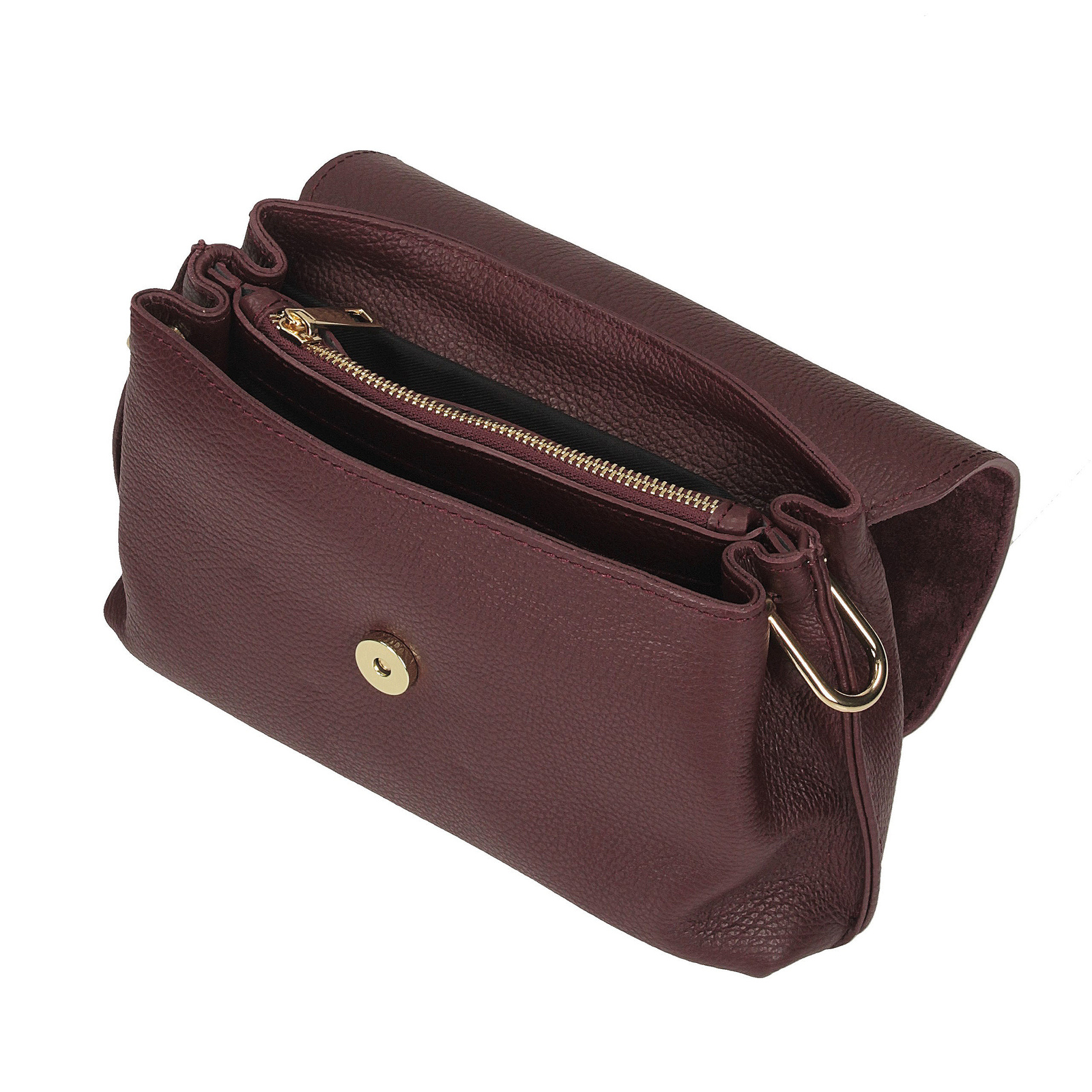 Torebka zapinana jest na złoty zamek, który doskonale komponuje się z eleganckim odcieniem bordo. Wyposażona w regulowany pasek ze skóry naturalnej (120 cm) oraz krótsze uszy (60 cm), daje możliwość wygodnego noszenia zarówno na ramieniu, jak i w dłoni.