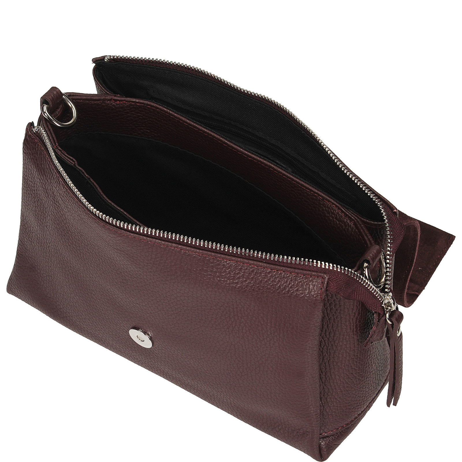 Torebka zamykana jest na metalowy zamek w kolorze srebra, a skórzany, regulowany pasek o długości 130 cm zapewnia wygodę noszenia – na ramieniu lub na skos. Bordowy odcień dodaje całości elegancji i wyrazistości, sprawiając, że model ten świetnie sprawdzi się zarówno na co dzień, jak i do bardziej dopracowanych stylizacji.