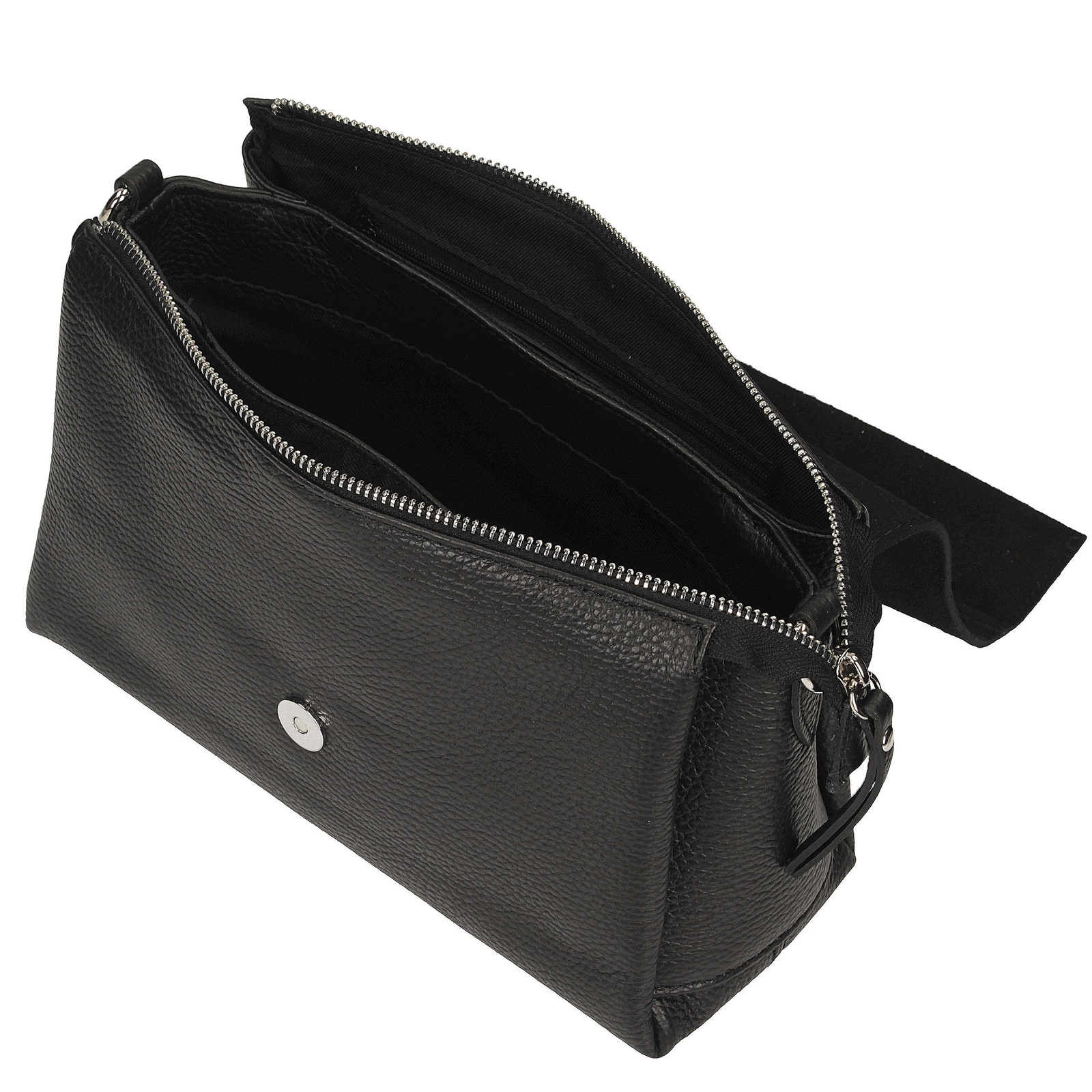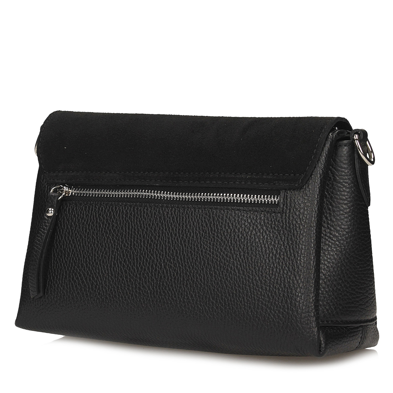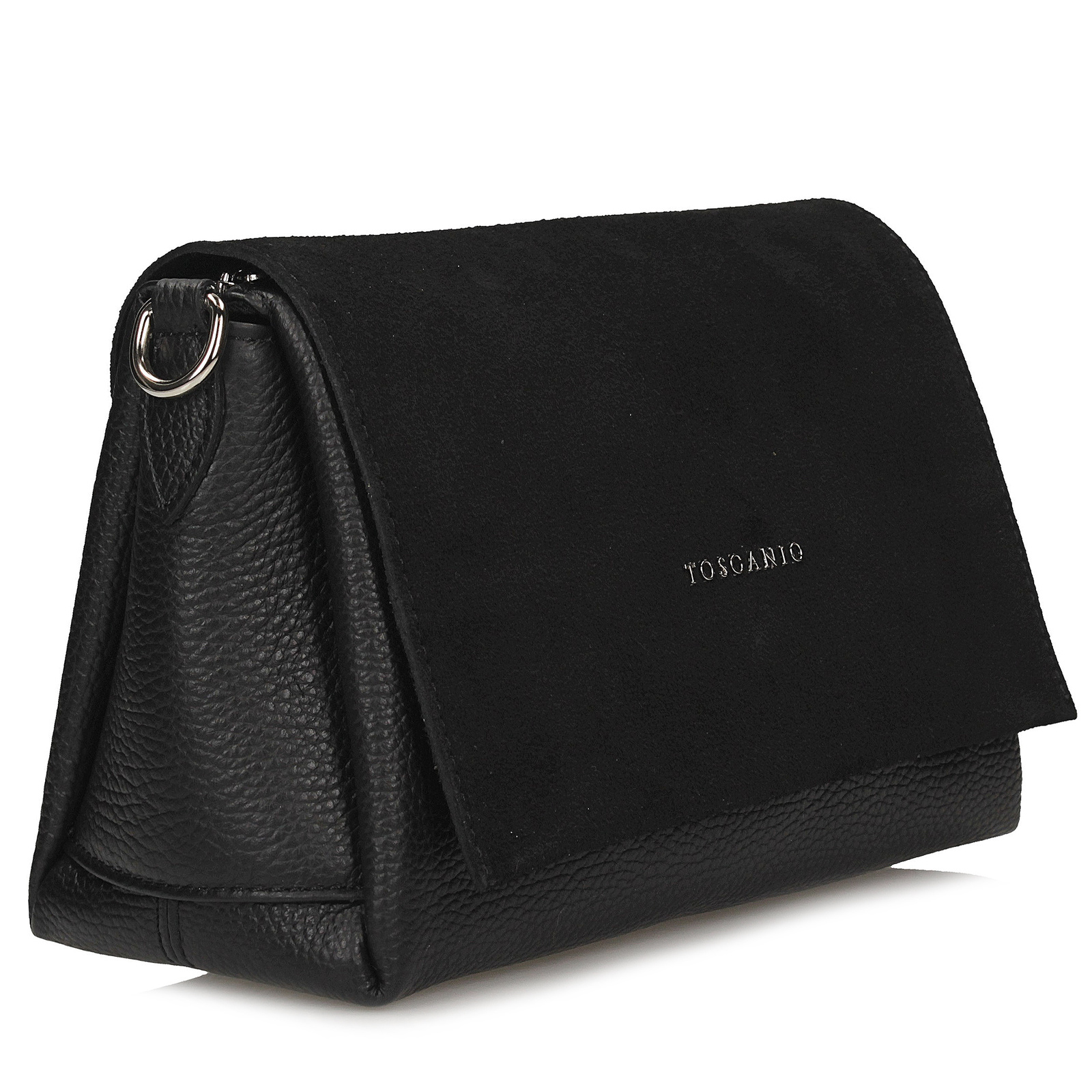 Ta listonoszka Toscanio w eleganckim czarnym kolorze to stylowy i ponadczasowy dodatek, który doskonale sprawdzi się na co dzień. Wykonana ze skóry naturalnej, łączy trwałość z klasycznym designem, a jej wyjątkowym akcentem jest zamszowa klapa, nadająca torebce głębi, miękkości i luksusowego wykończenia.