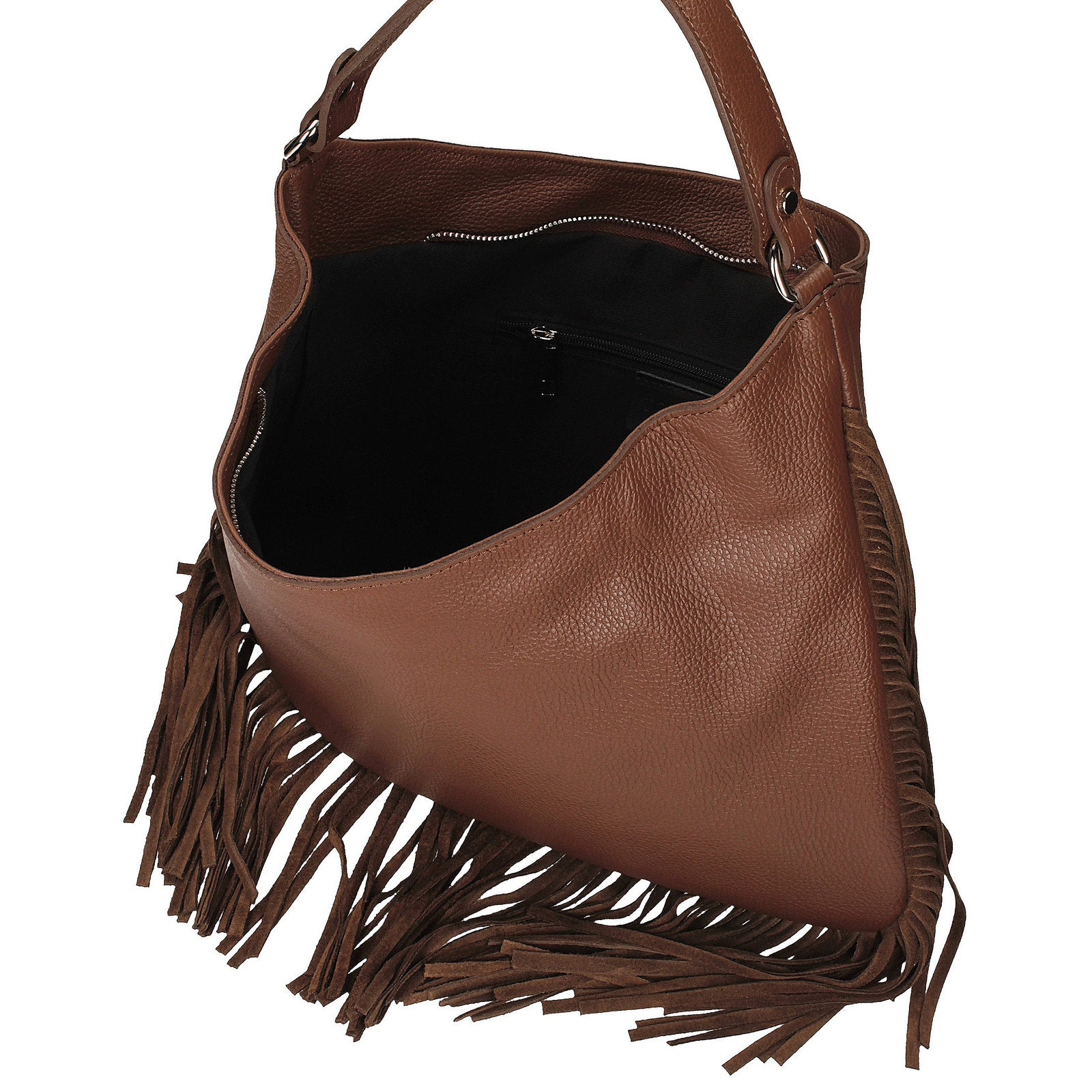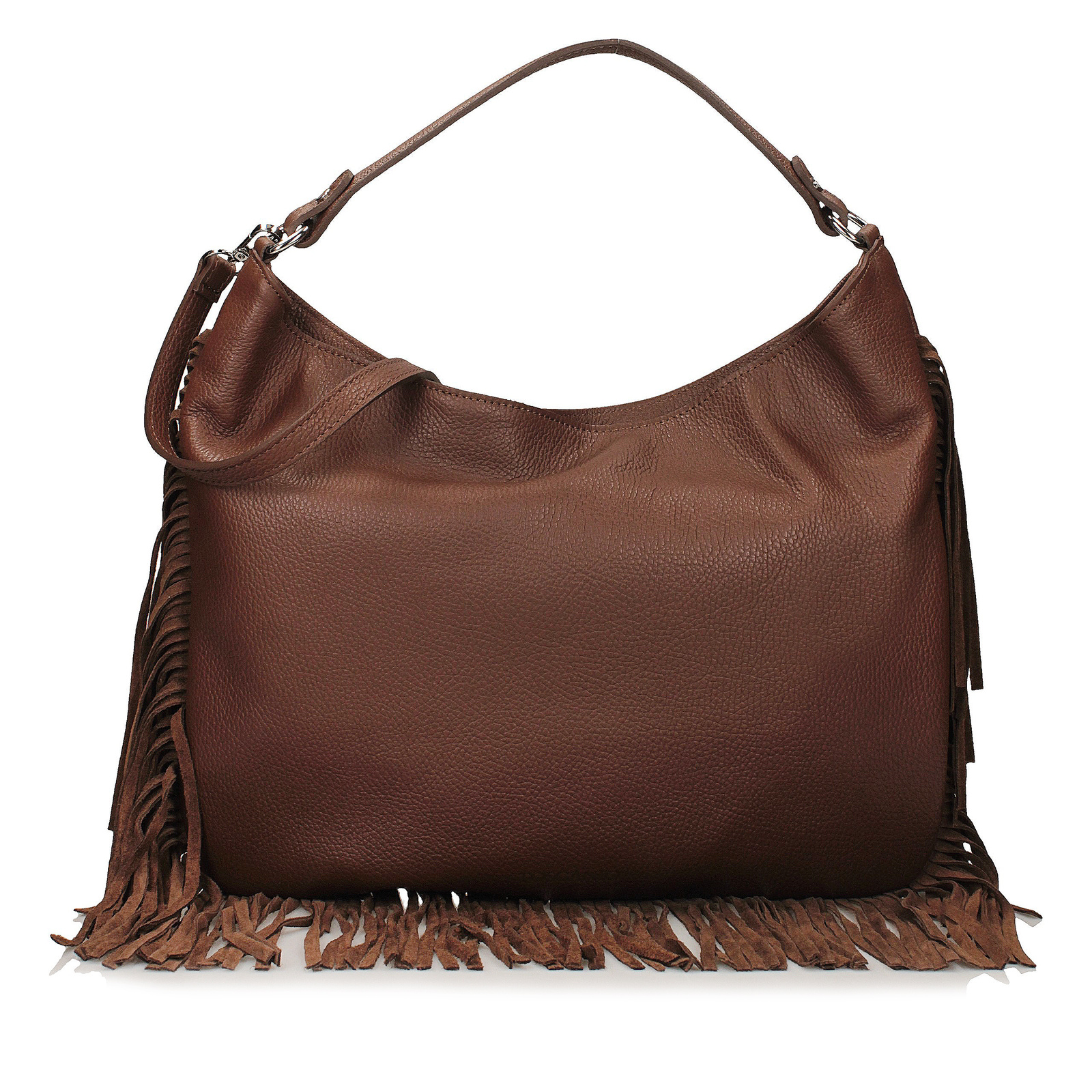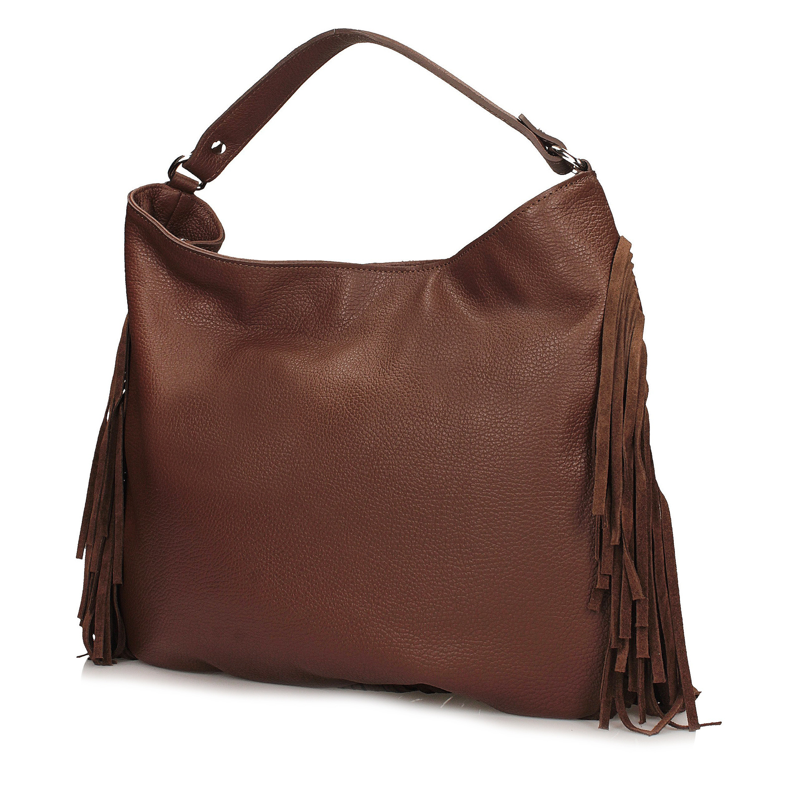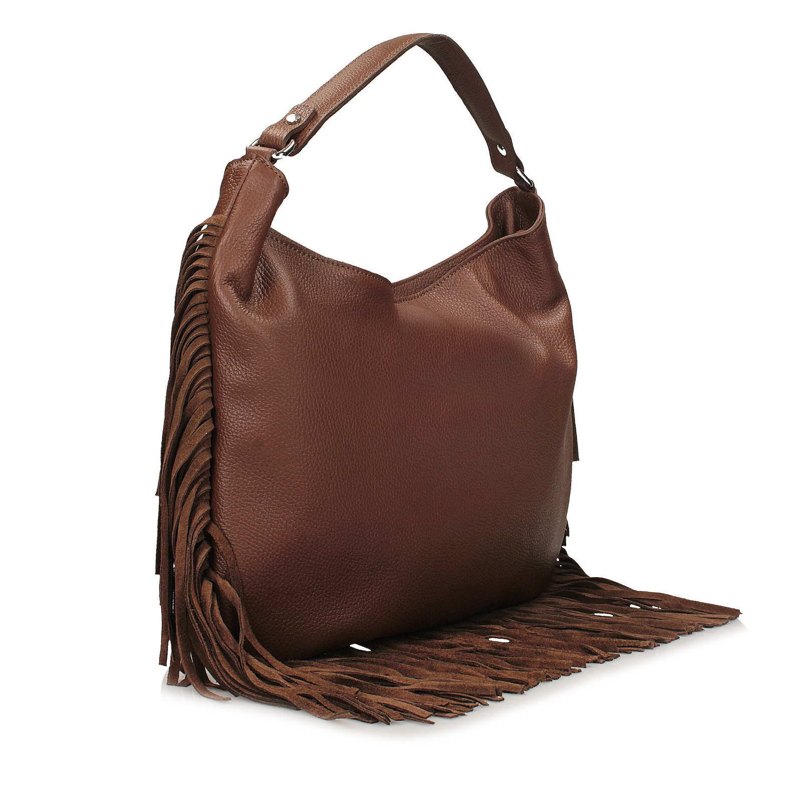 Brązowa torebka typu worek Toscanio to stylowy i pojemny model stworzony z wysokiej jakości skóry naturalnej, która zachwyca miękkością, trwałością i eleganckim wykończeniem. Jej charakterystycznym elementem są długie frędzle po bokach, nadające całości lekko boho-modowego charakteru i podkreślające swobodny, miejski styl.