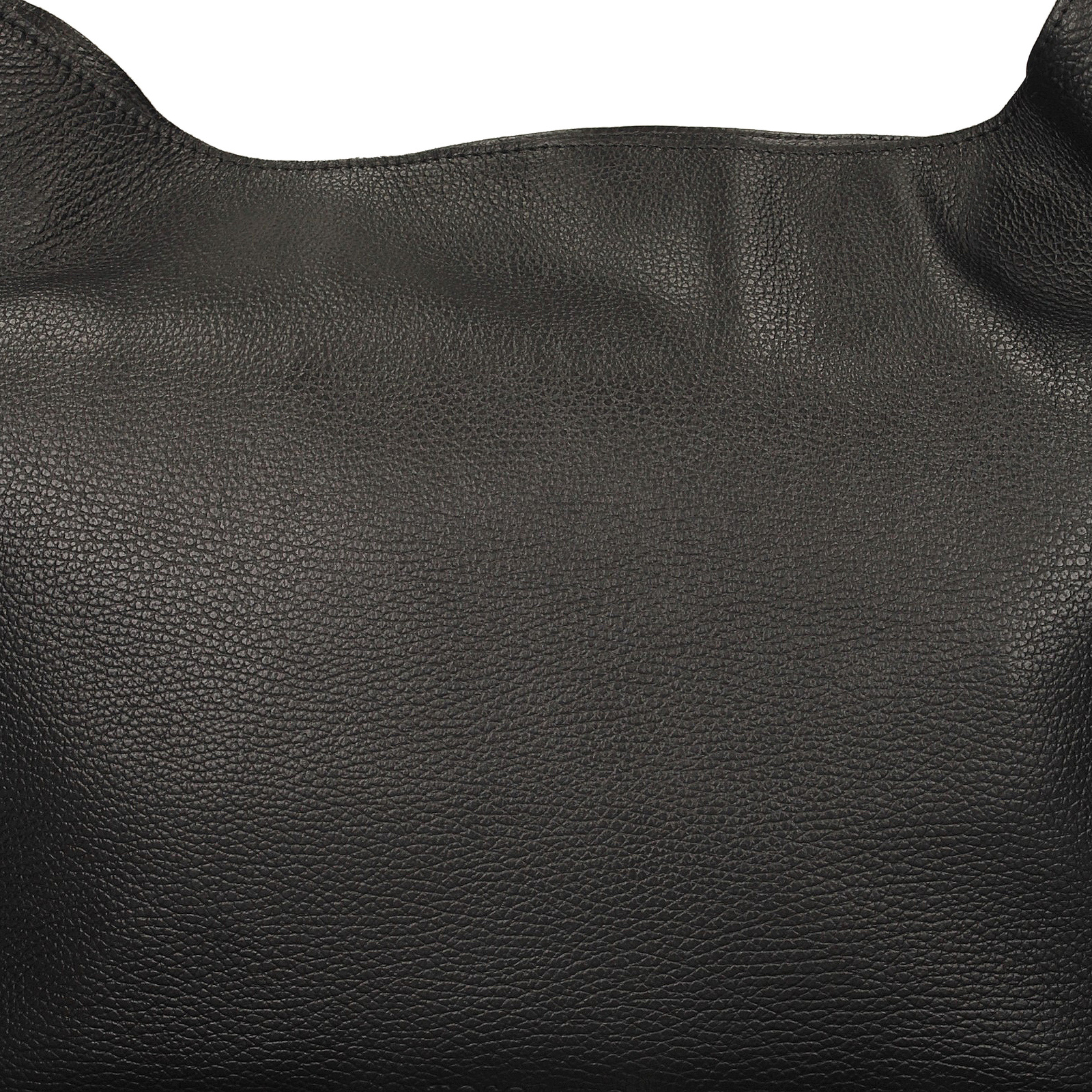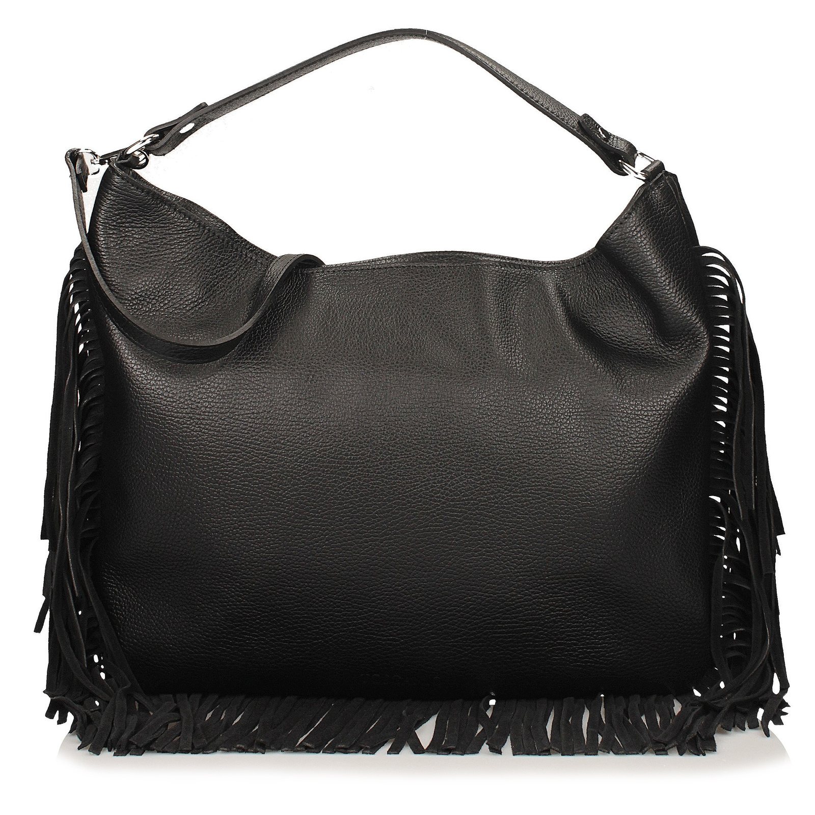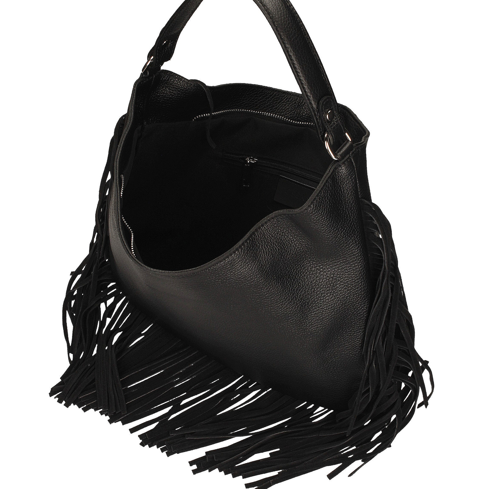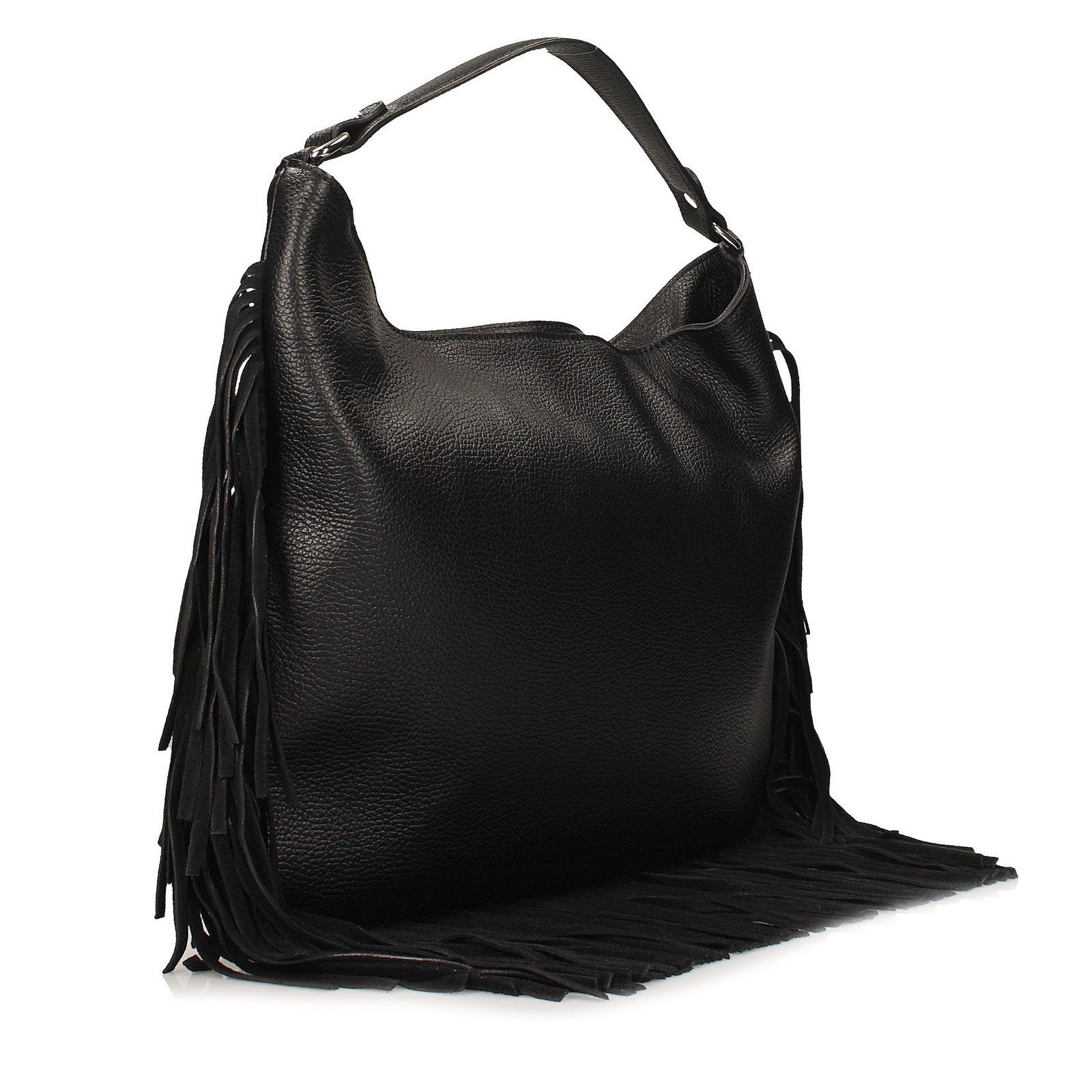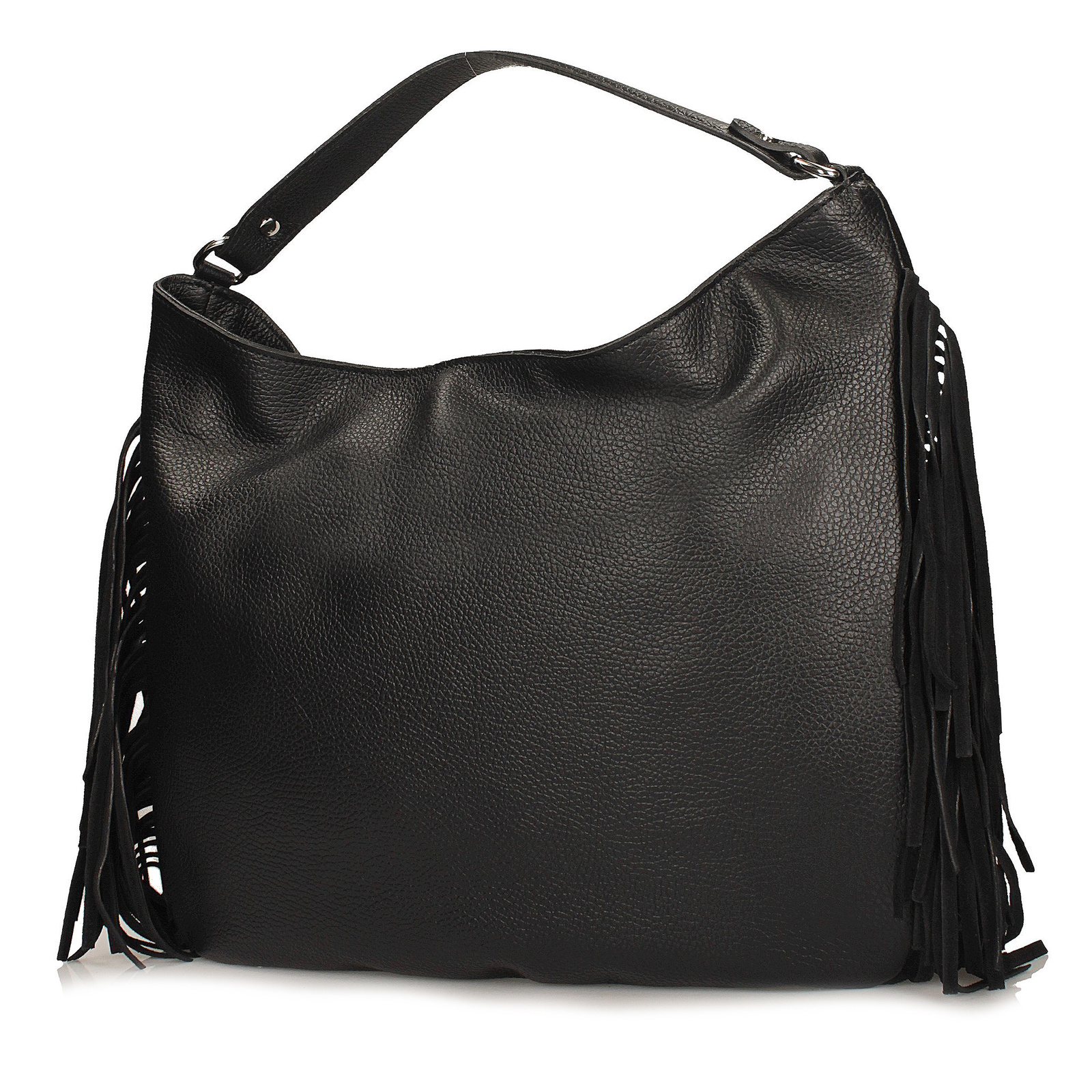 Czarna torebka typu worek Toscanio to stylowy i funkcjonalny model stworzony z wysokiej jakości skóry naturalnej, która zachwyca trwałością, miękkością i eleganckim wykończeniem. Jej charakterystycznym akcentem są długie frędzle po bokach, nadające całości modowego, lekko boho charakteru, a jednocześnie utrzymane w eleganckim, ponadczasowym tonie.