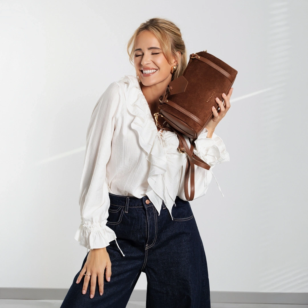Brązowy kuferek Toscanio to wyjątkowy model o oryginalnym, cylindrycznym kształcie, który przyciąga uwagę swoim nietuzinkowym designem. W całości wykonany z miękkiego, przyjemnego w dotyku zamszu, łączy w sobie elegancję, modowy charakter i wyraźnie kobiecy styl.
