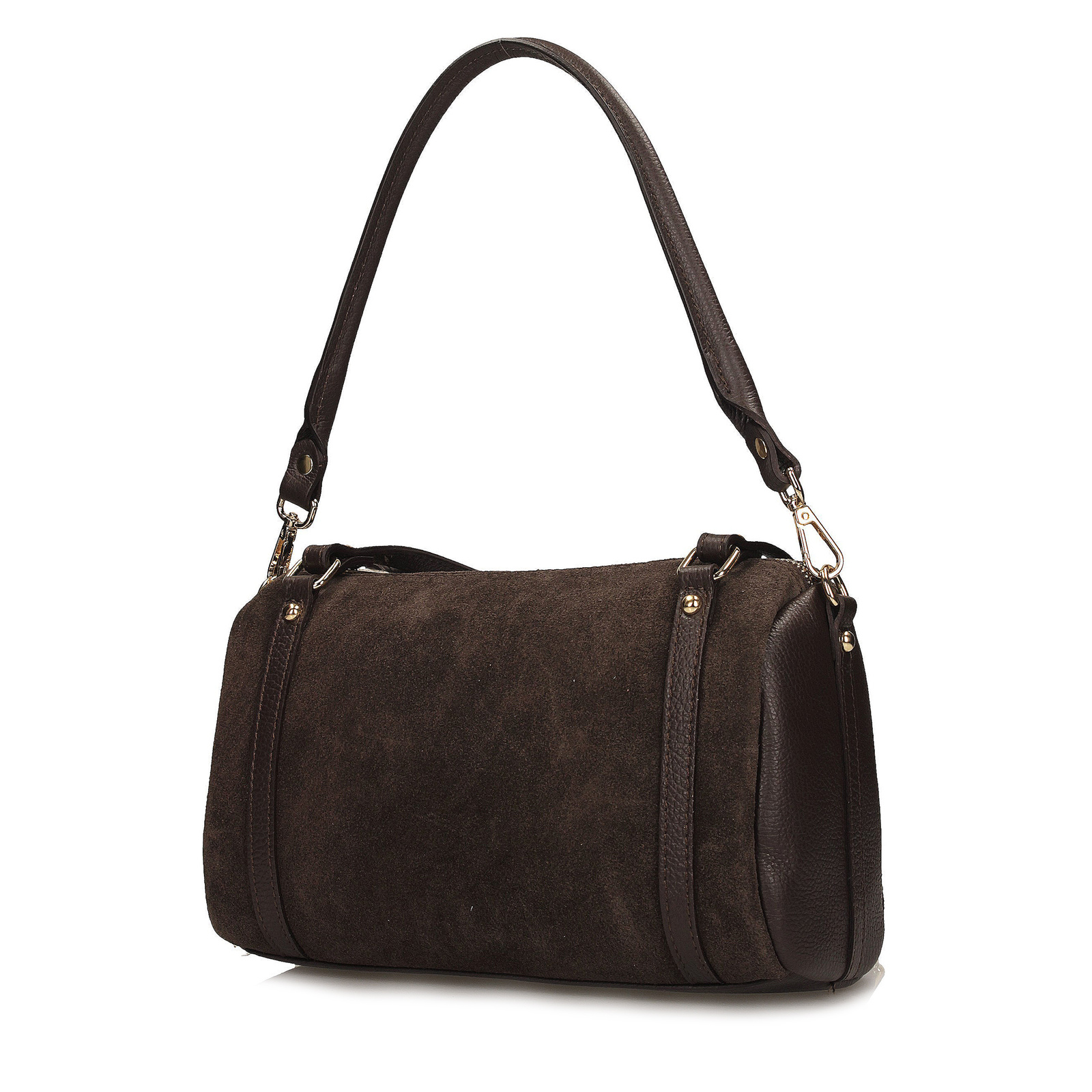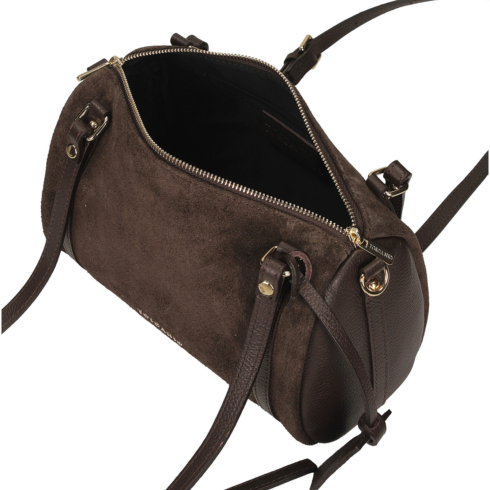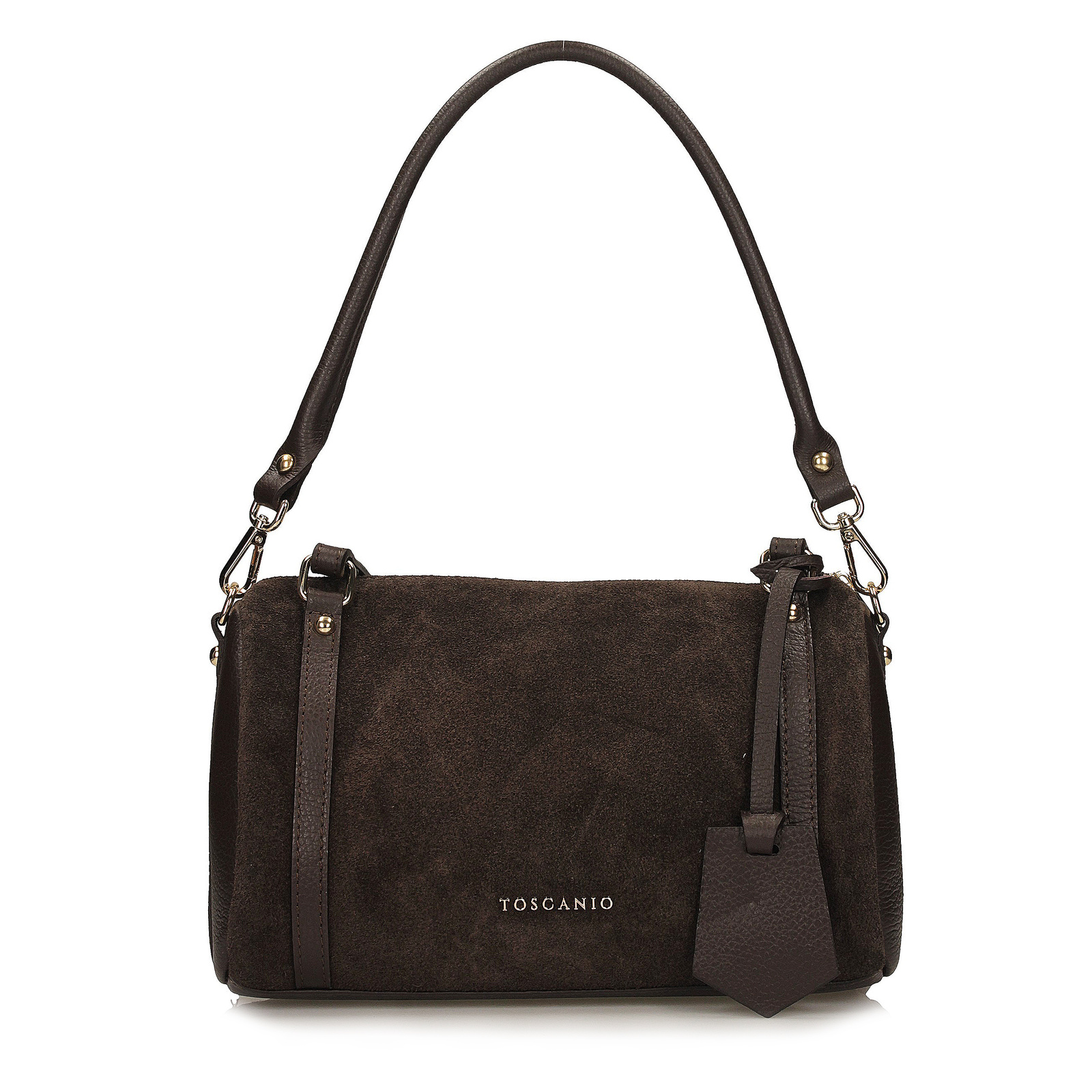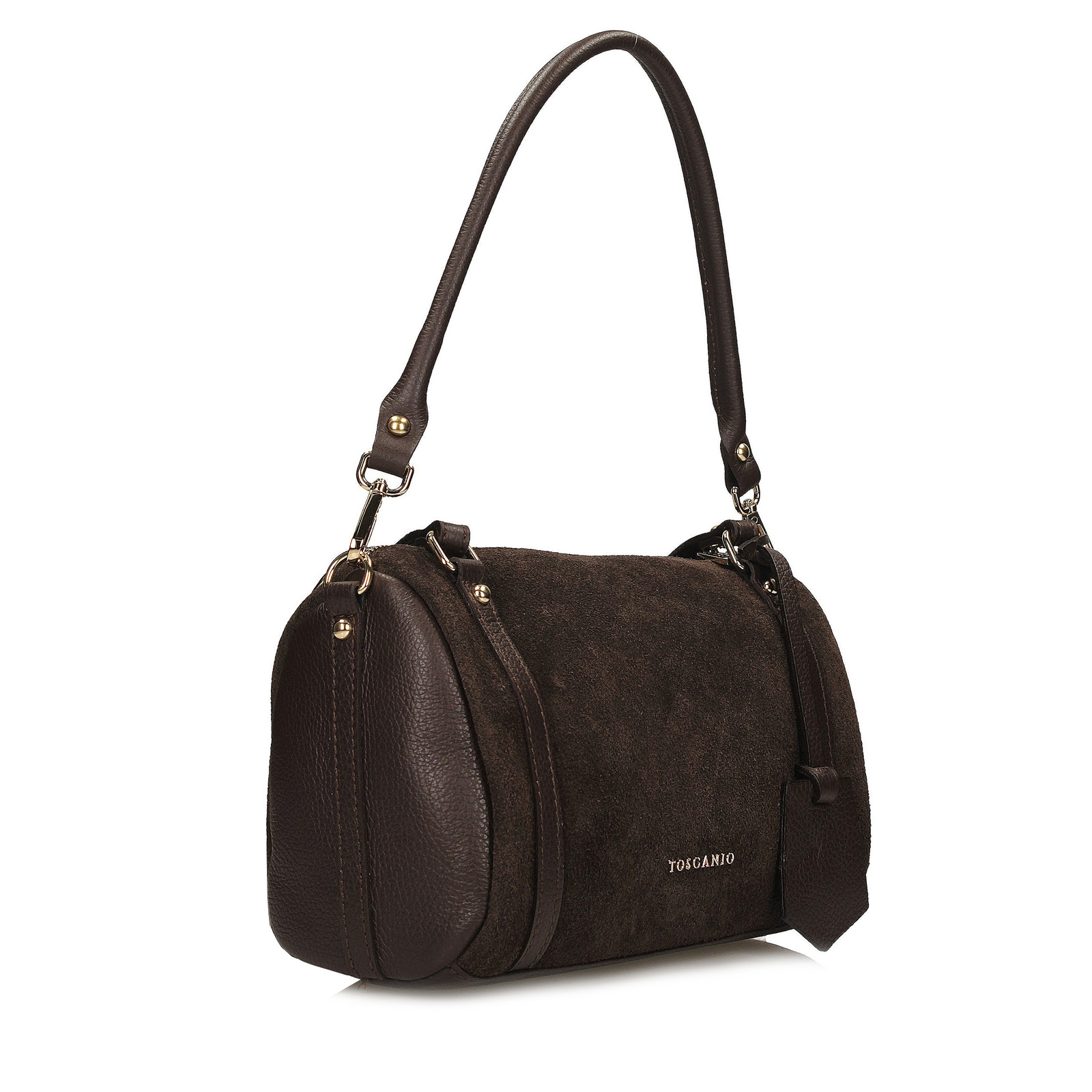 Brązowy kuferek Toscanio to wyjątkowy model o oryginalnym, cylindrycznym kształcie, który przyciąga uwagę swoim nietuzinkowym designem. W całości wykonany z miękkiego, przyjemnego w dotyku zamszu, łączy w sobie elegancję, modowy charakter i wyraźnie kobiecy styl.