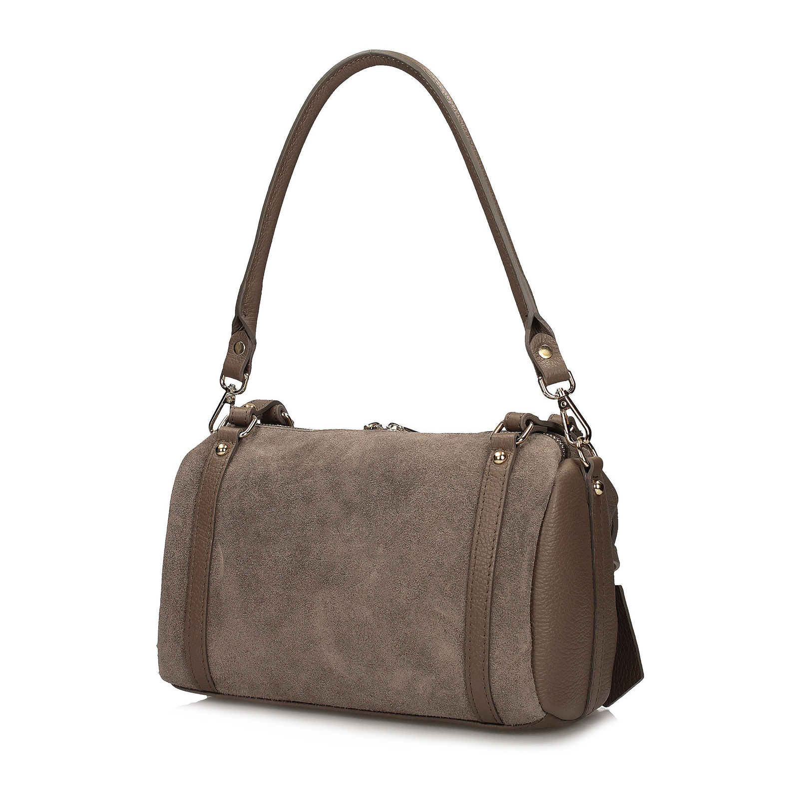 Torebka ma subtelną formę walca, która nadaje jej nowoczesności i niepowtarzalnego stylu. Dzięki kompaktowym wymiarom (26 × 15 × 12 cm) pomieści wszystkie niezbędne drobiazgi, a wnętrze wyłożone tkaniną kryje jedną praktyczną komorę oraz dodatkową kieszeń ułatwiającą organizację.