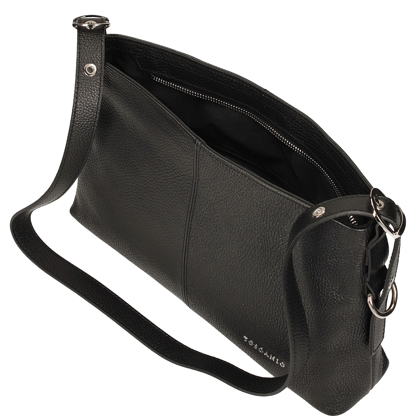 Długi, skórzany pasek o długości 100 cm umożliwia wygodne noszenie torebki na ramieniu lub na ukos. Torebka zamykana jest na metalowy zamek w kolorze srebrnym, co dodaje jej eleganckiego charakteru.
