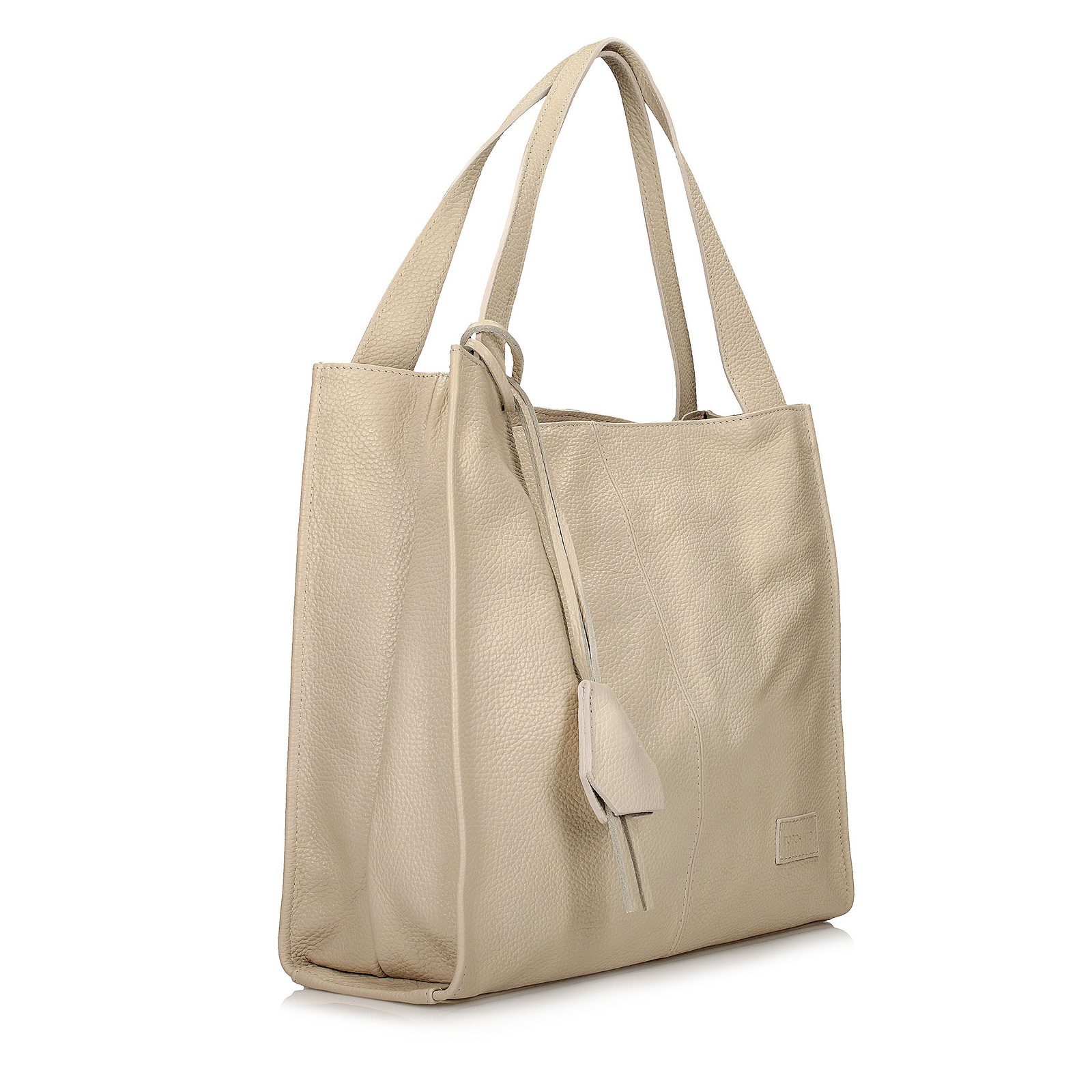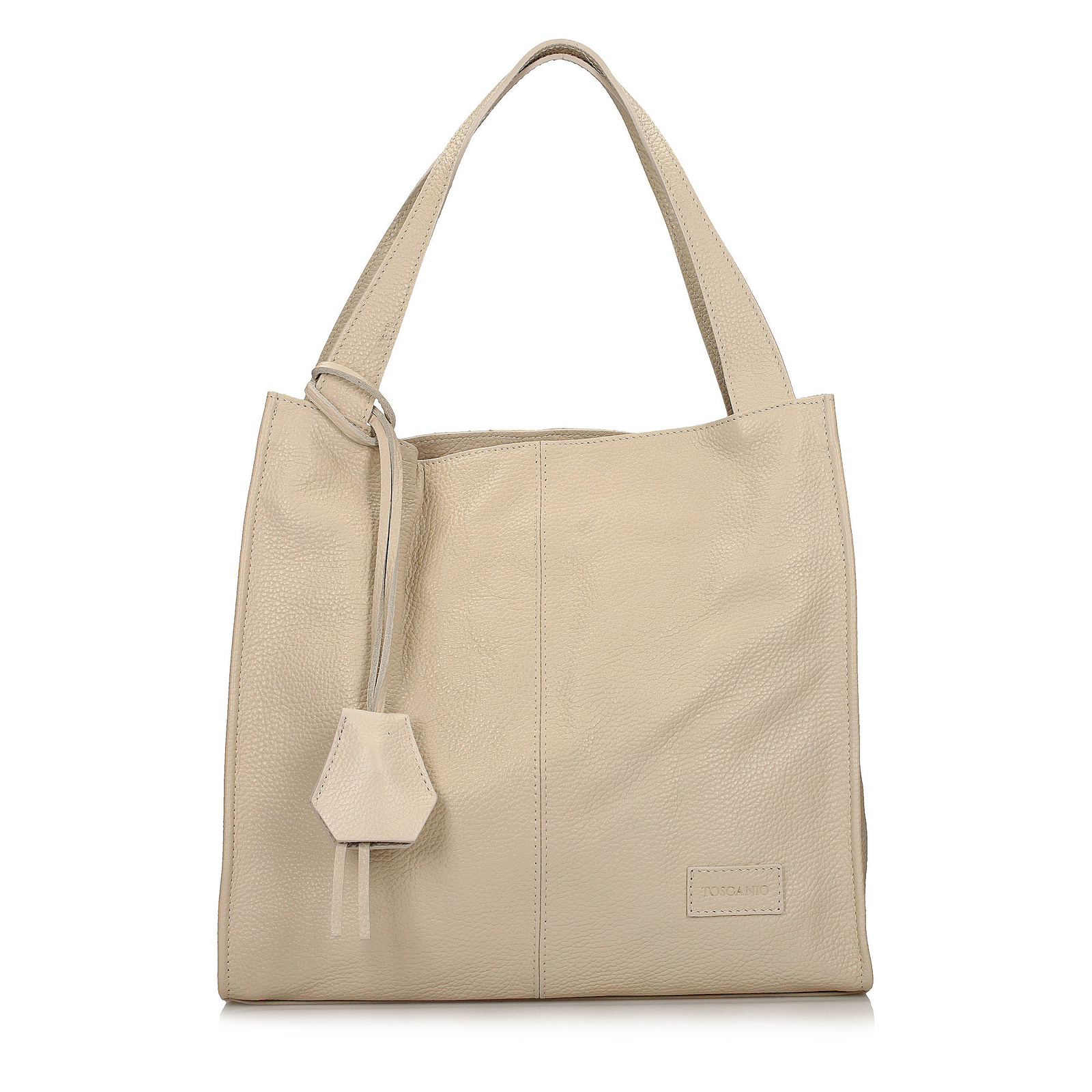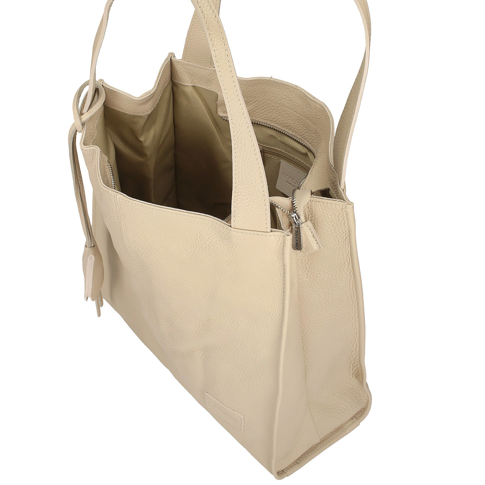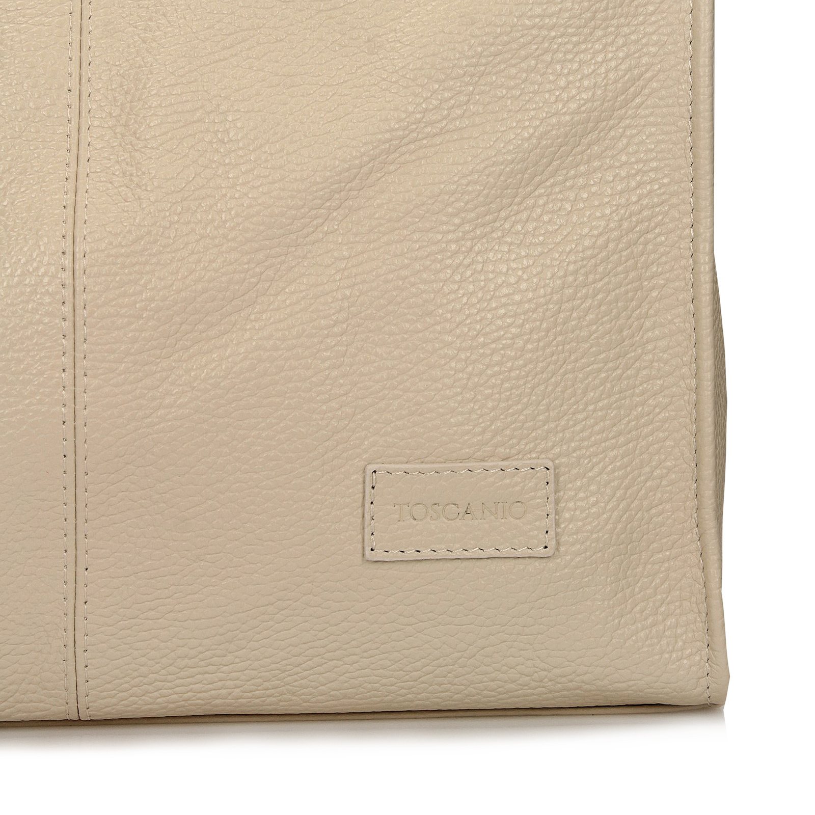 Kremowa shopperka od TOSCANIO zachwyca subtelnym odcieniem i ponadczasowym designem. Starannie uszyta z naturalnej skóry, oferuje funkcjonalność dzięki pojemnej komorze, dodatkowym kieszeniom oraz długim, wygodnym uchwytom. Zapięcie na suwak i srebrne detale podkreślają jej elegancki charakter. Idealna do miejskich stylizacji.