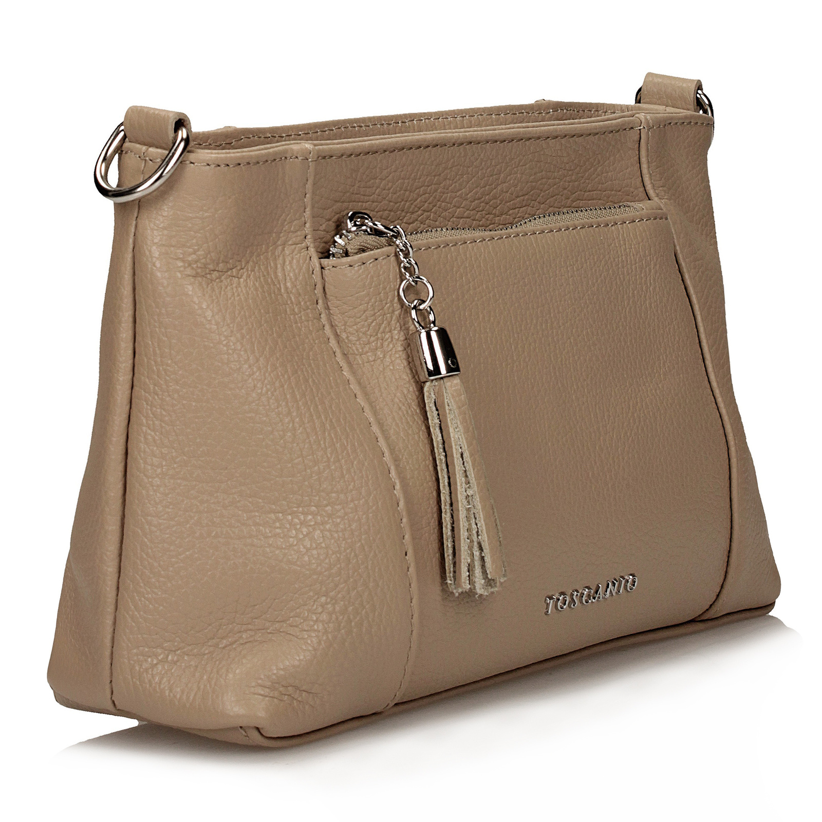 Torebka Toscanio G65 to doskonały wybór dla kobiet, które szukają eleganckiego i funkcjonalnego dodatku. Wykonana z naturalnej skóry, jest trwała i wyjątkowo stylowa. Dzięki swojej kompaktowej wielkości (16 cm wysokości, 25 cm szerokości, 7 cm głębokości), torebka jest idealna na co dzień – pomieści wszystkie najpotrzebniejsze rzeczy. Prosty, ale efektowny zamek metalowy w kolorze srebrnym dodaje jej luksusowego charakteru.