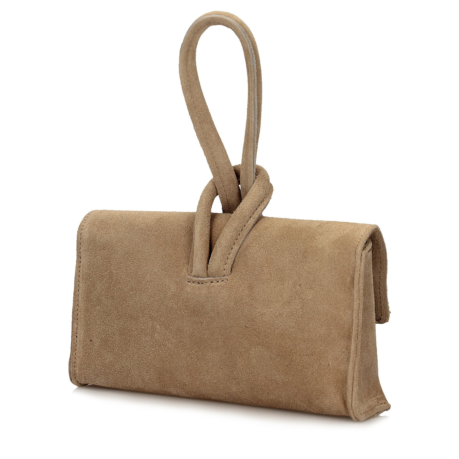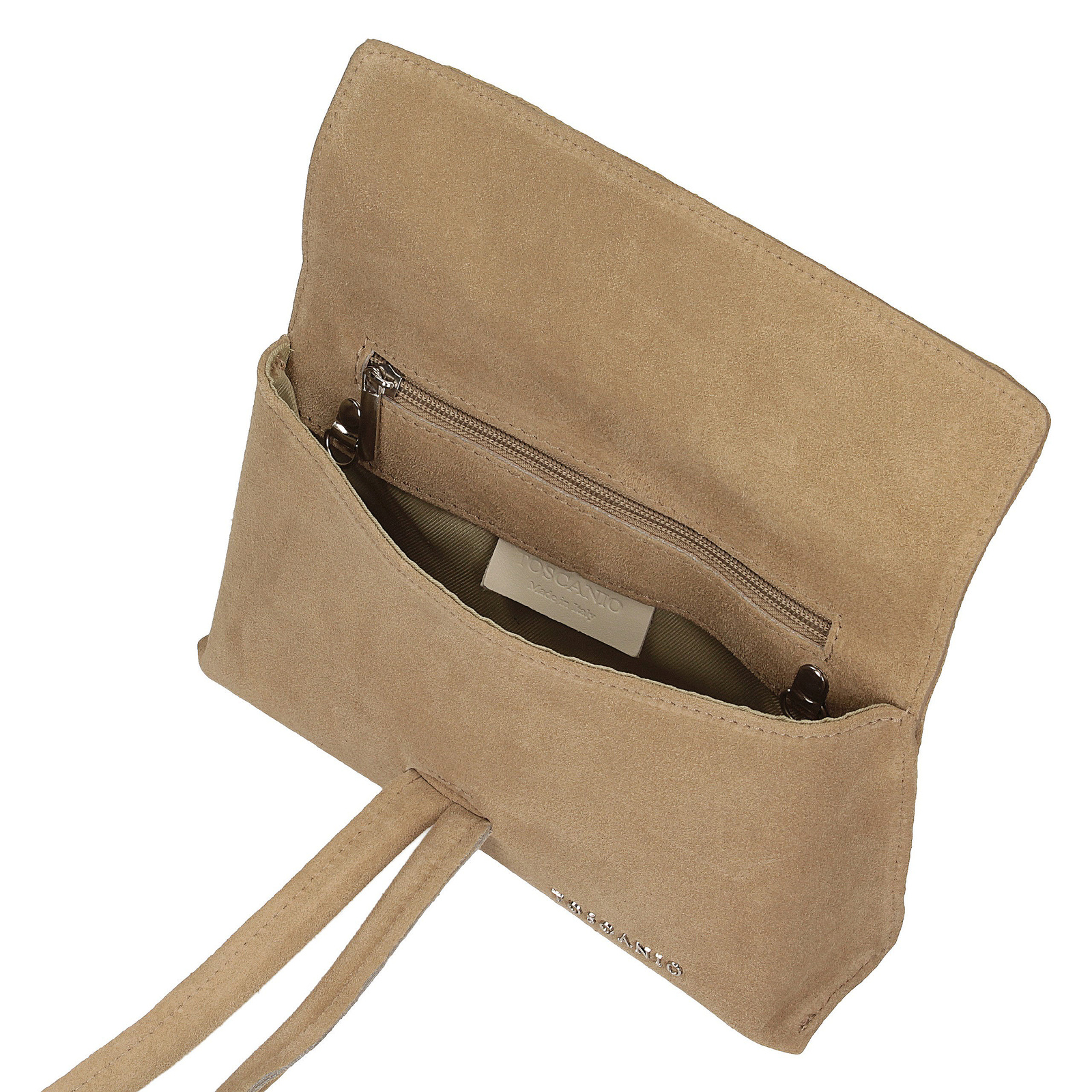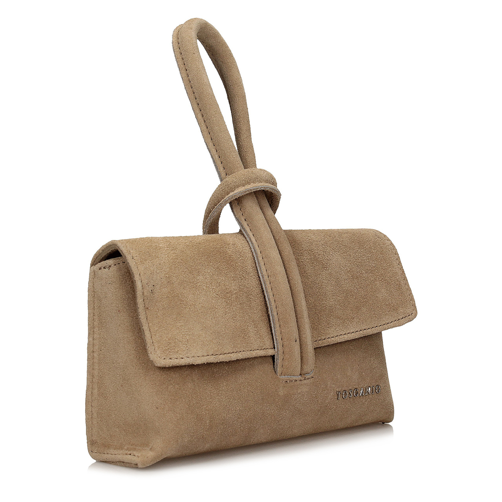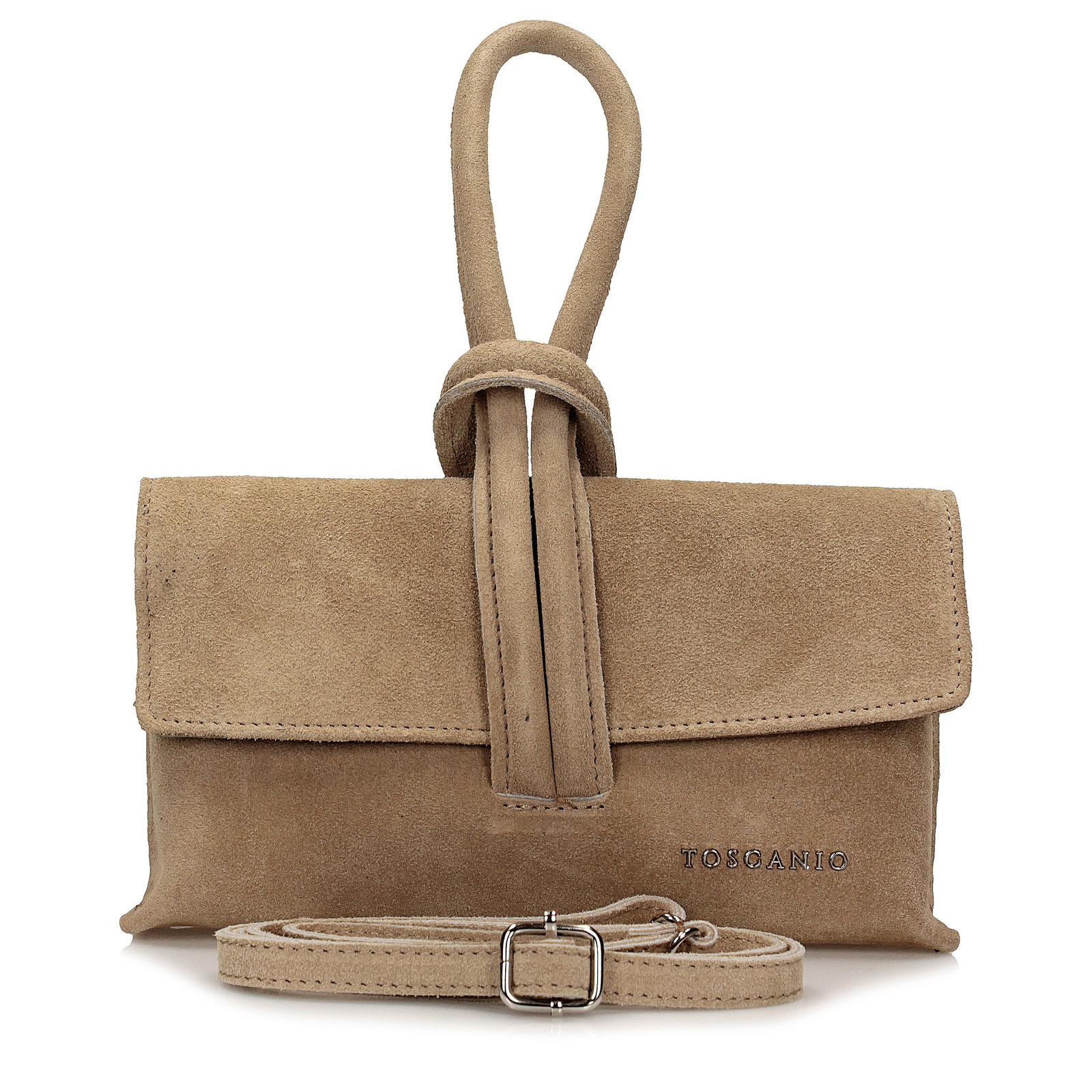 Delikatna i stylowa kopertówka damska marki Toscanio, wykonana w całości z naturalnej skóry zamszowej w eleganckim odcieniu beżu. Jej klasyczny fason z subtelnym biglem nadaje całości wyjątkowego charakteru, idealnego zarówno na co dzień, jak i na specjalne okazje. Wnętrze torebki wykończone jest trwałą tkaniną, a dołączony pasek ze skóry naturalnej o długości 120 cm pozwala na wygodne noszenie na ramieniu lub przez ciało. Kompaktowy rozmiar zapewnia miejsce na najpotrzebniejsze drobiazgi, nie tracąc przy tym na szyku.