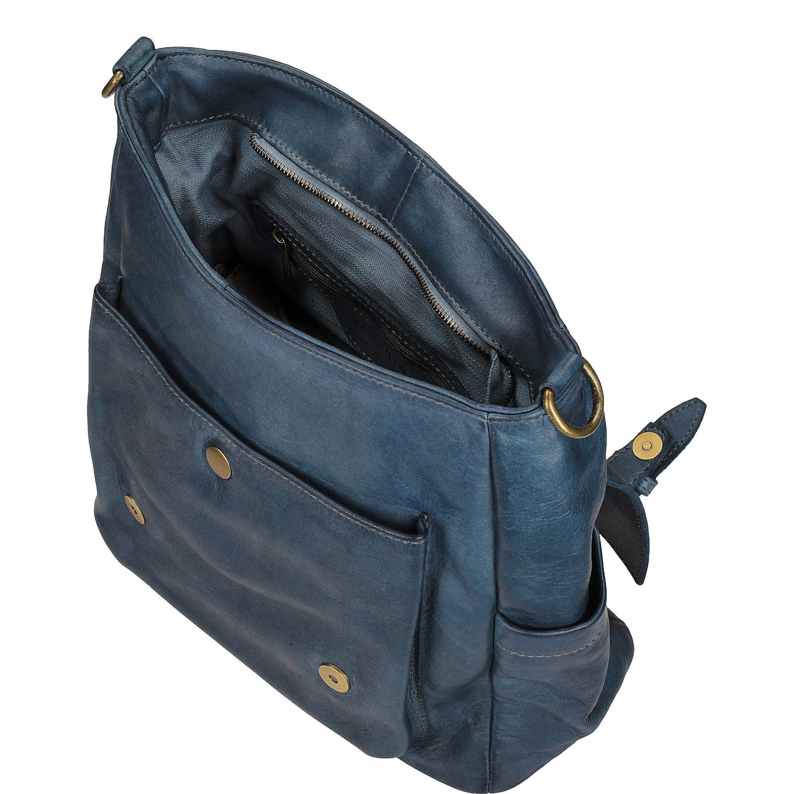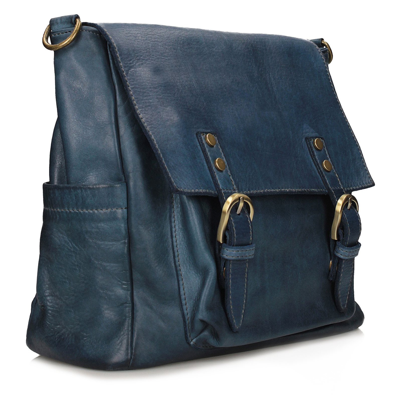 Stylowa torebka damska Toscanio wykonana z naturalnej skóry pranej w odcieniu niebieskiego. Charakterystyczna faktura vintage nadaje jej oryginalnego charakteru i sprawia, że każdy egzemplarz jest nieco inny. Model łączy w sobie elegancję i funkcjonalność – wewnątrz znajduje się jedna komora i dwie kieszenie, a z zewnątrz aż trzy dodatkowe kieszenie, co zapewnia doskonałą organizację. Złoty zamek i klasyczny krój z długim paskiem (120 cm) sprawiają, że torebka doskonale sprawdzi się zarówno na co dzień, jak i do pracy. Z łatwością zmieści format A4.