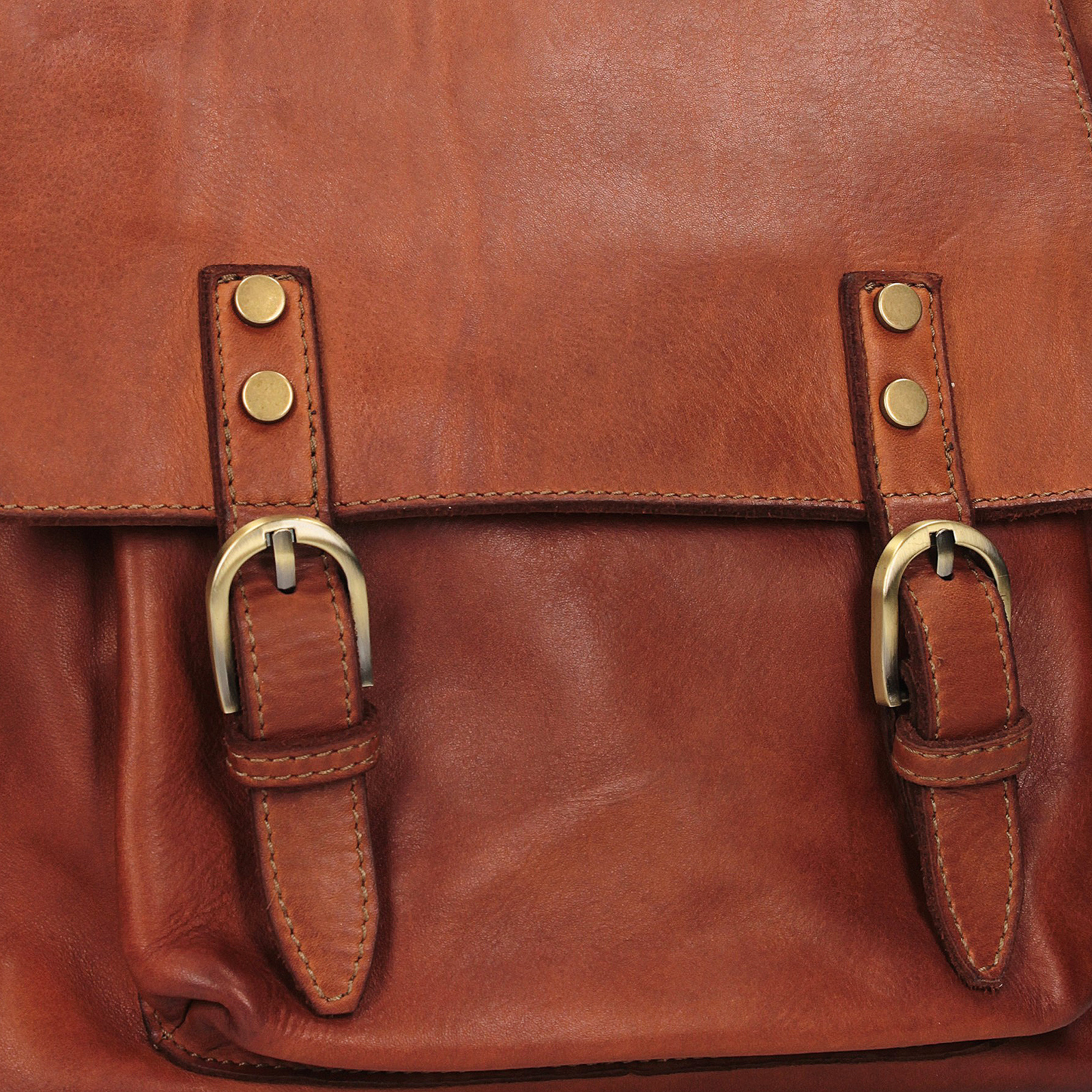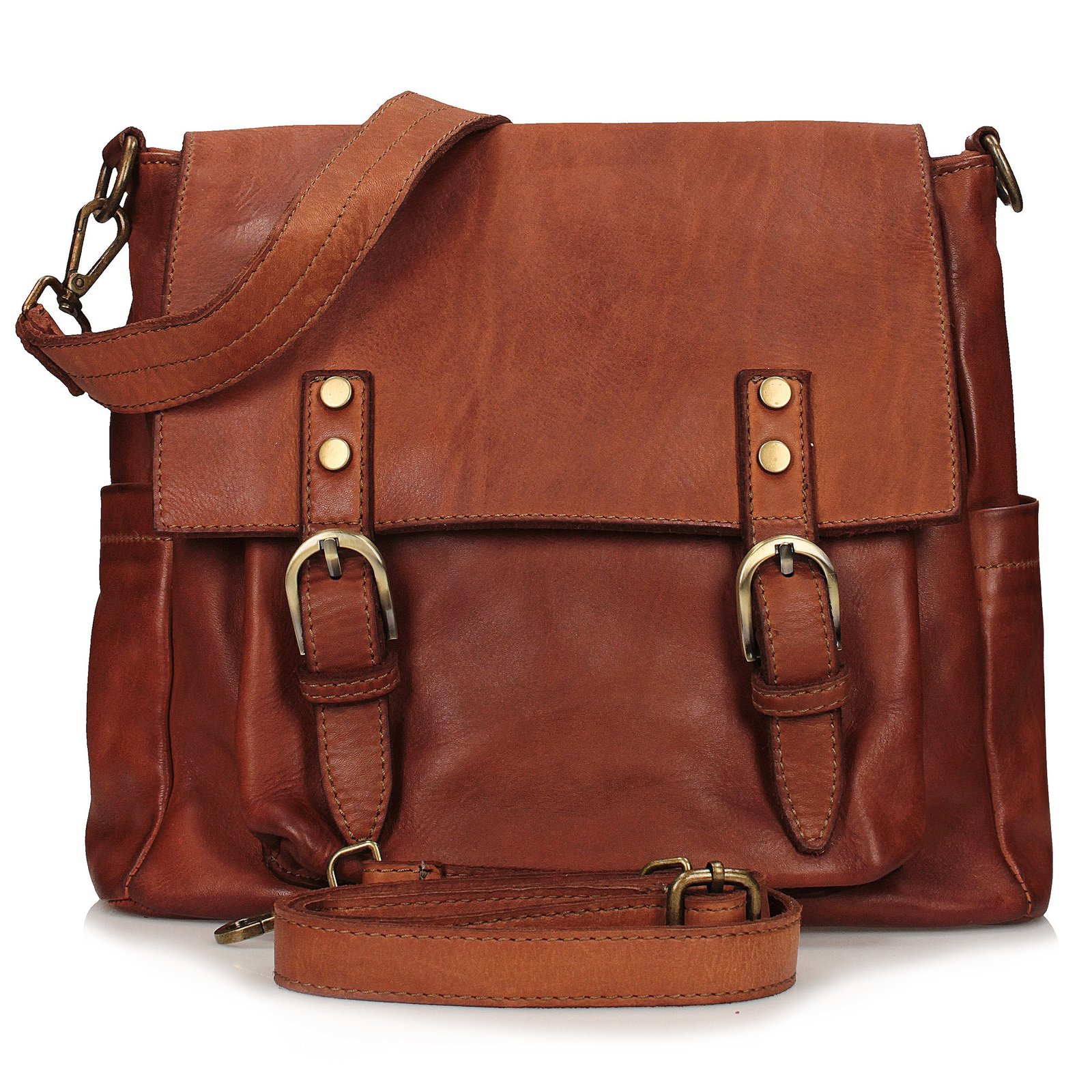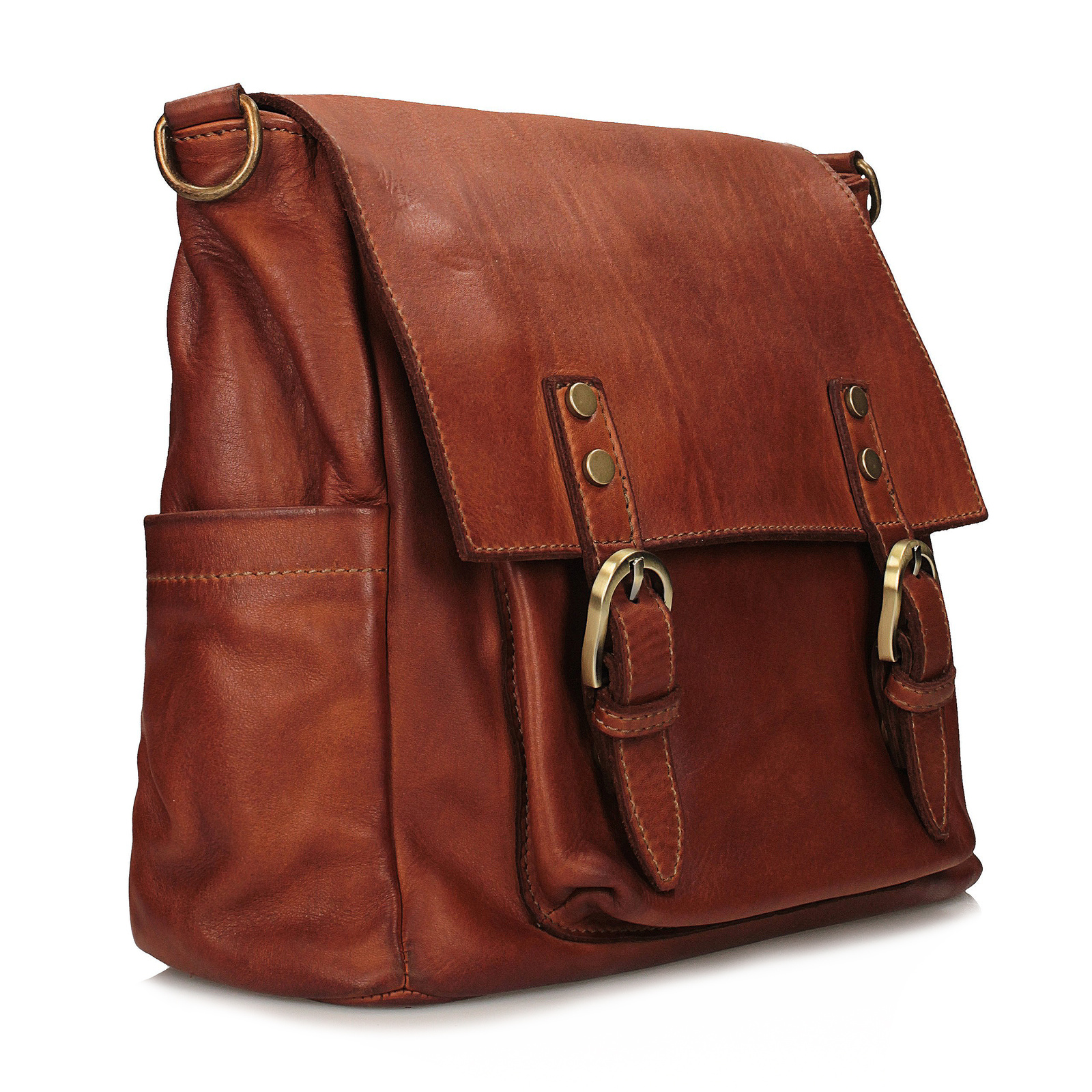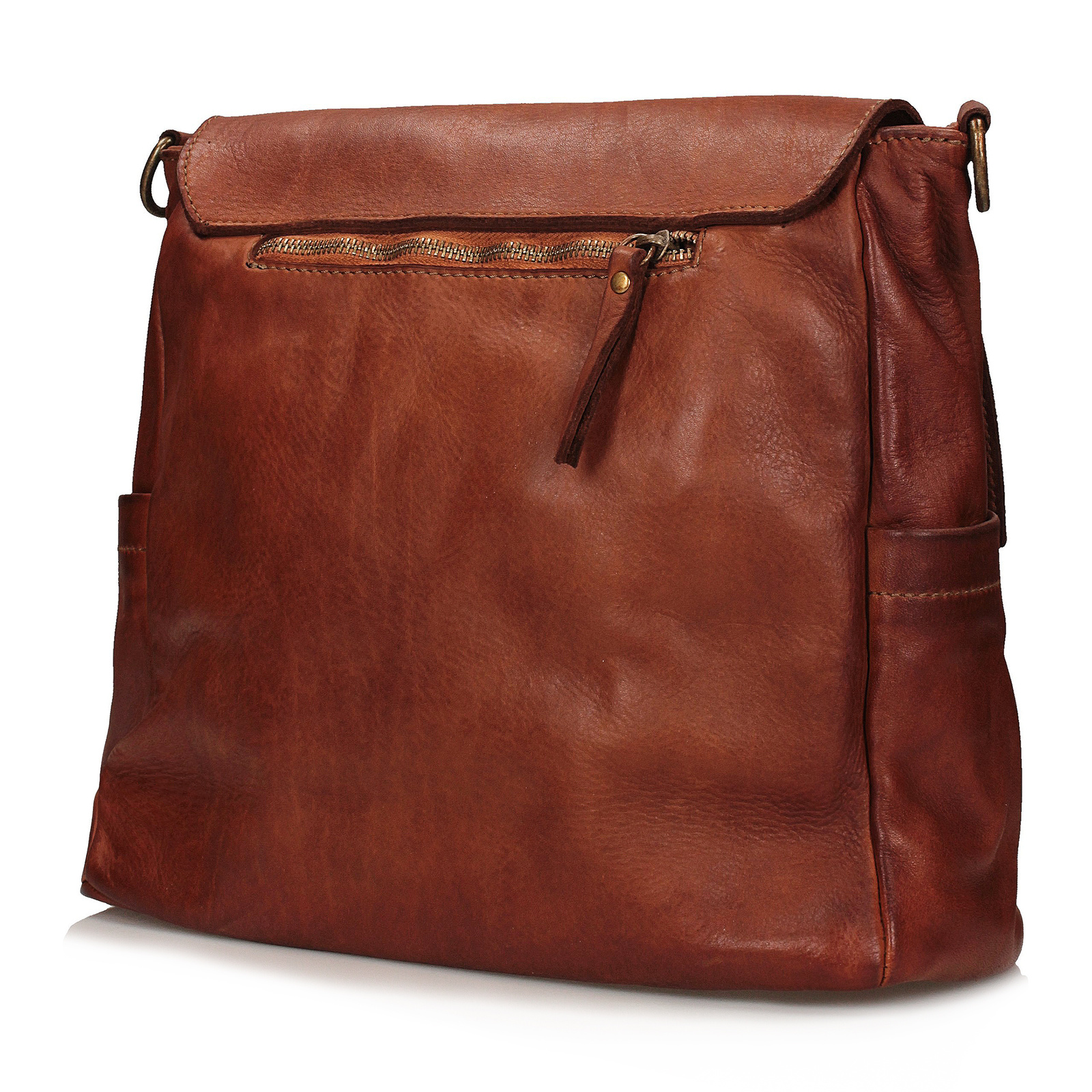 Torebka listonoszka Toscanio w ciepłym, rudym odcieniu to propozycja dla kobiet ceniących połączenie mody i wygody. Wykonana ze skóry naturalnej pranej o wyraźnej strukturze vintage. Jej praktyczne wnętrze kryje jedną dużą komorę oraz dwie kieszenie, natomiast na zewnątrz znajdziesz trzy dodatkowe kieszenie zapinane na zamek. Złote detale dodają jej elegancji, a długi pasek (120 cm) zapewnia komfortowe noszenie. Mieści dokumenty A4, dzięki czemu sprawdzi się również jako torebka do pracy.