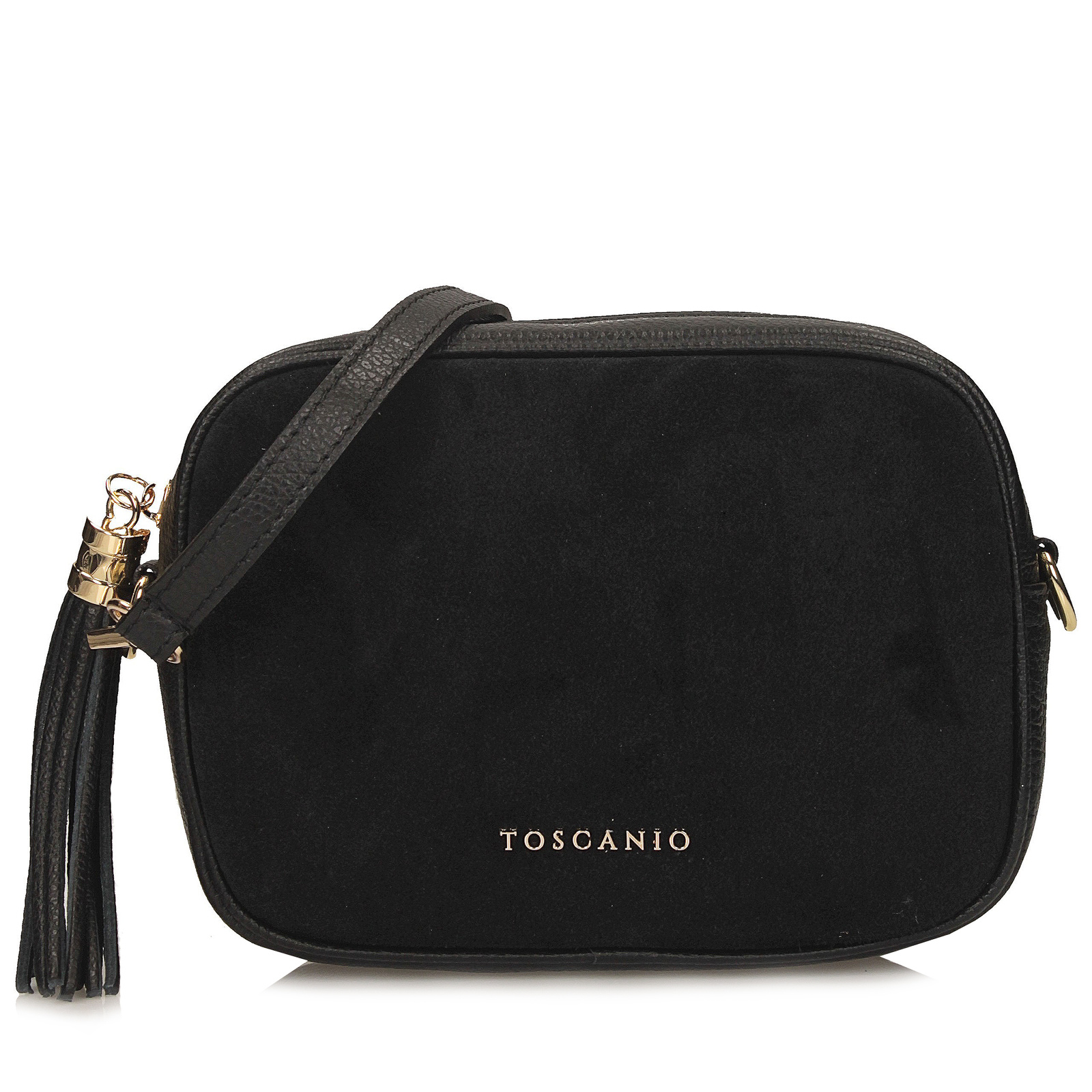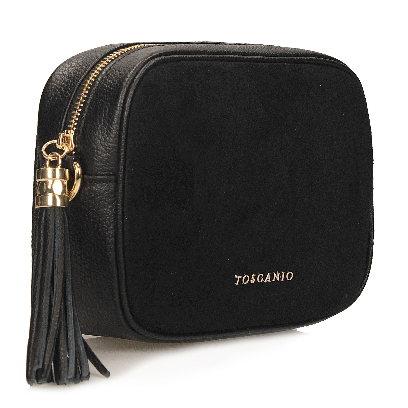 Czarna listonoszka marki Toscanio to elegancki model łączący klasyczną prostotę z nutą nowoczesnego charakteru. Przód torebki został wykonany z miękkiej skóry zamszowej w głębokim, czarnym odcieniu, natomiast boki i tył z groszkowanej skóry naturalnej, która dodaje całości struktury i trwałości. Złoty zamek w górnej części pełni funkcję praktyczną, a jednocześnie stanowi stylowy, ozdobny detal podkreślający szyk torebki. Wnętrze wykończone tkaniną kryje jedną komorę, zapewniając wystarczająco dużo miejsca na najważniejsze drobiazgi. Regulowany pasek ze skóry naturalnej (110 cm) pozwala wygodnie nosić model zarówno na ramieniu, jak i na skos. To klasyczna, a jednocześnie wyrazista propozycja, która doskonale sprawdzi się zarówno w codziennych, jak i eleganckich stylizacjach.