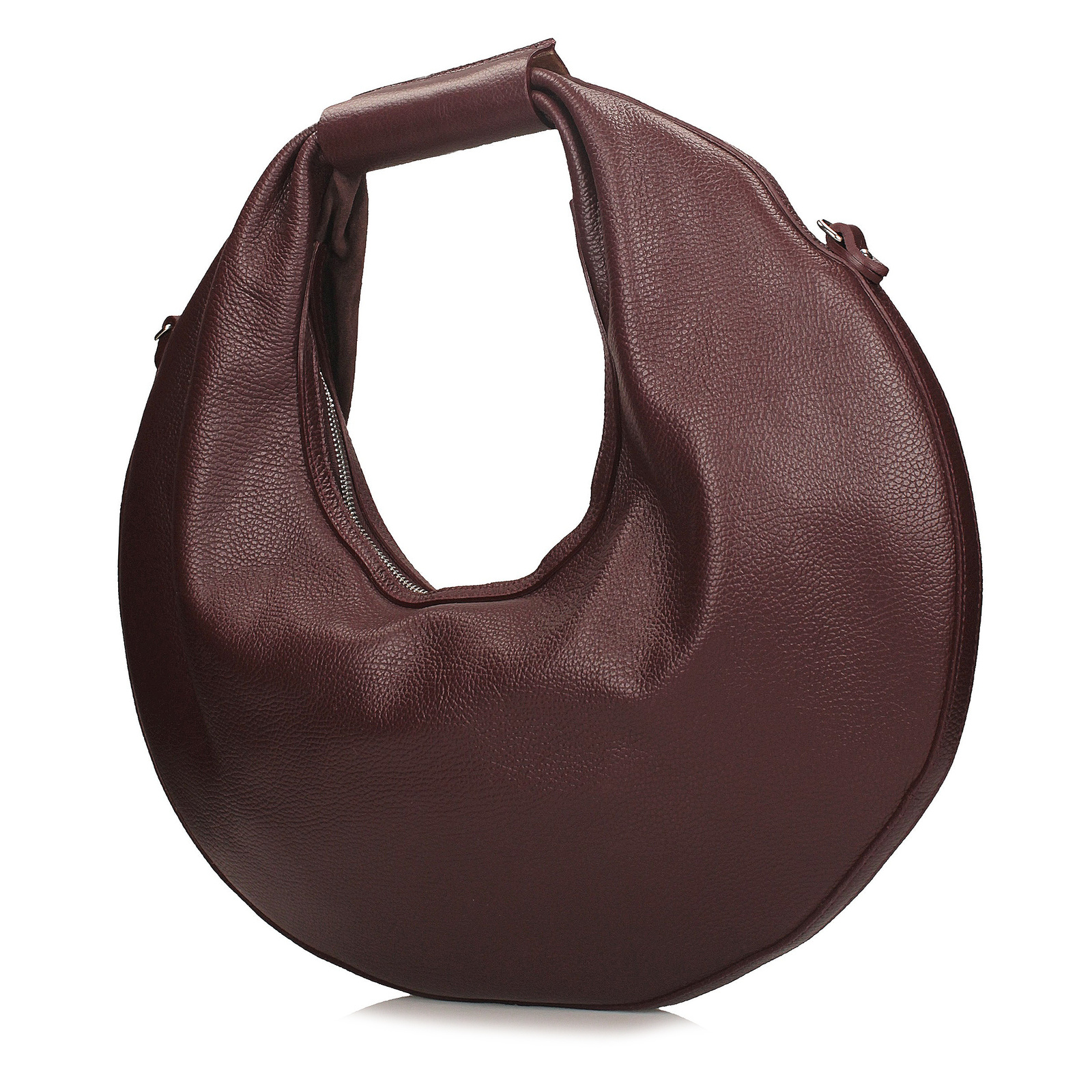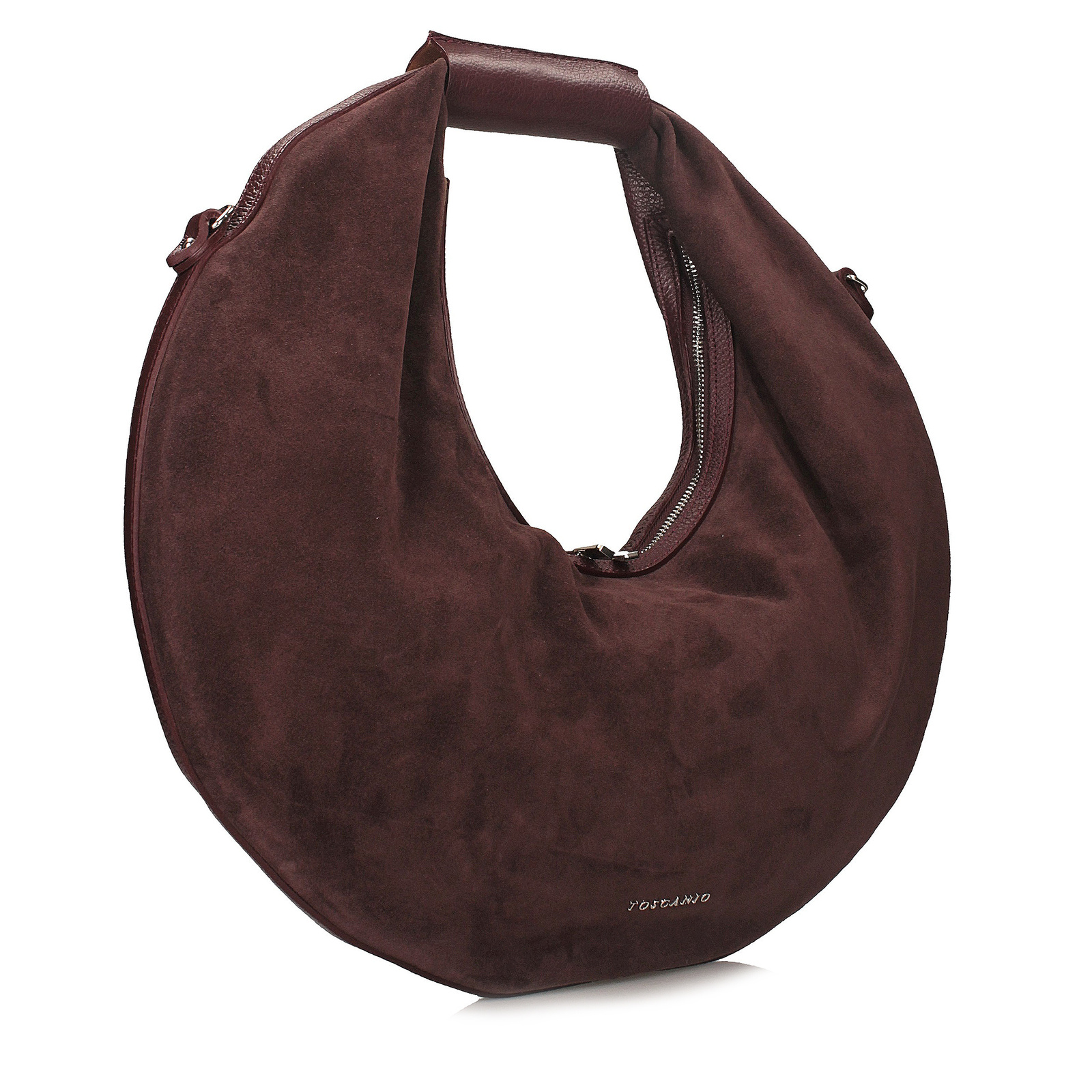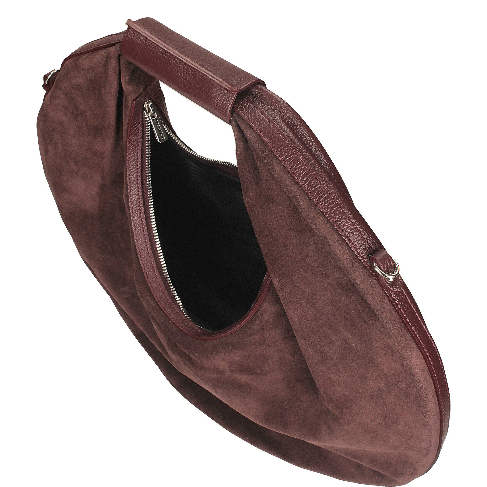Bordowa torebka typu worek marki Toscanio to wyjątkowy model w kształcie koła, który przyciąga uwagę swoim niebanalnym designem. Przód wykonany jest z miękkiej skóry zamszowej, natomiast tył z gładkiej skóry licowej, co nadaje całości elegancki kontrast. Torebka zamykana jest na zamek błyskawiczny w srebrnym kolorze, a jej wnętrze wyściełane jest trwałą tkaniną, mieszczącą jedną komorę oraz praktyczną kieszeń na drobiazgi. Model wyposażono w skórzany pasek o długości 110 cm, który umożliwia wygodne noszenie na ramieniu lub w formie crossbody. Górny uchwyt z wycięciem o wysokości około 20 cm pozwala swobodnie przewiesić torebkę przez ramię. Głęboki odcień bordo dodaje jej wyrazistości i elegancji, czyniąc z niej stylowy dodatek zarówno na co dzień, jak i na specjalne okazje.