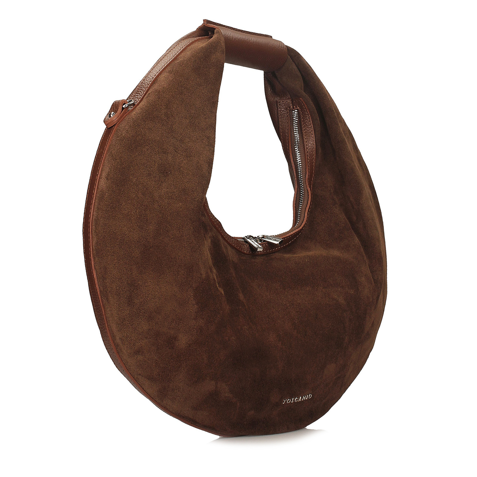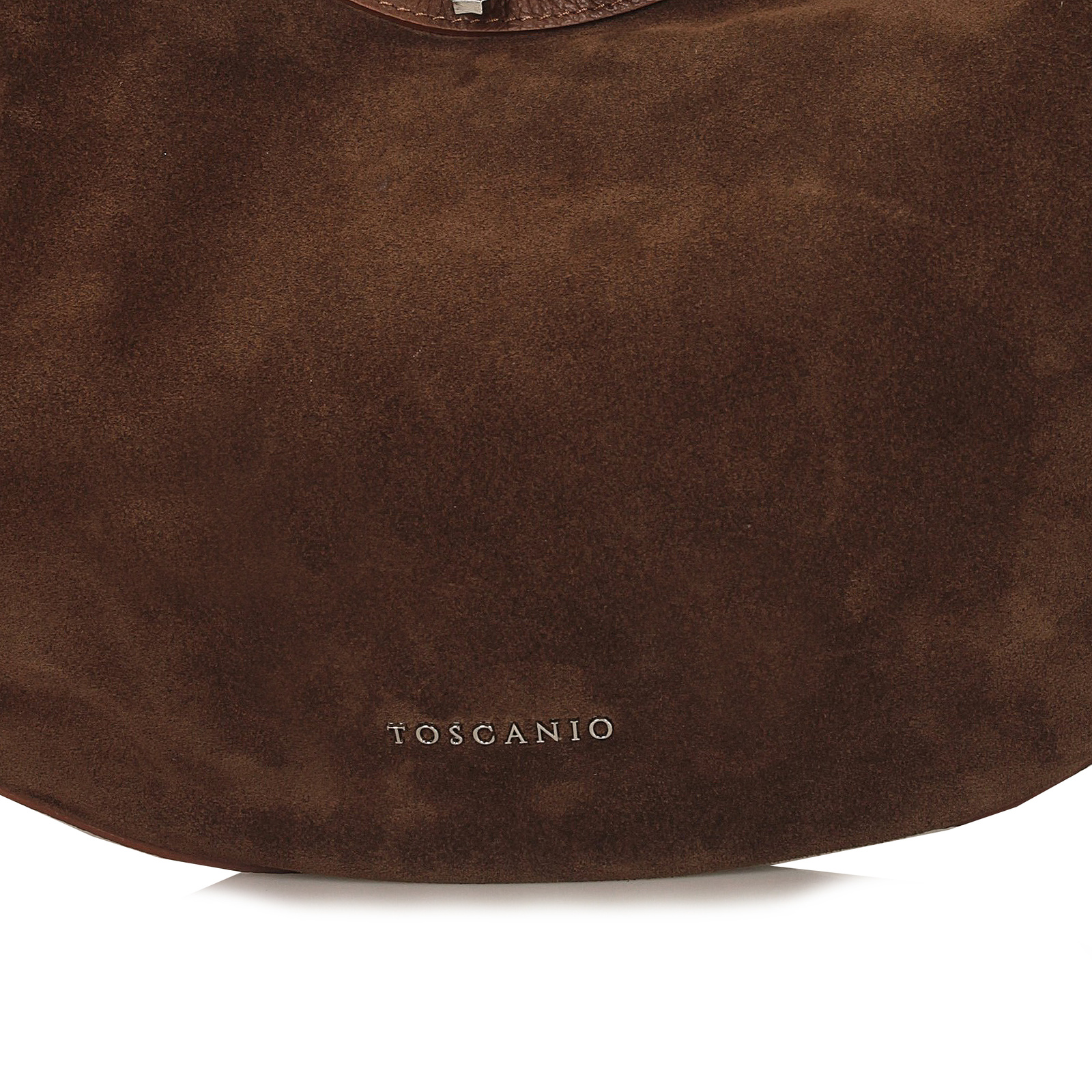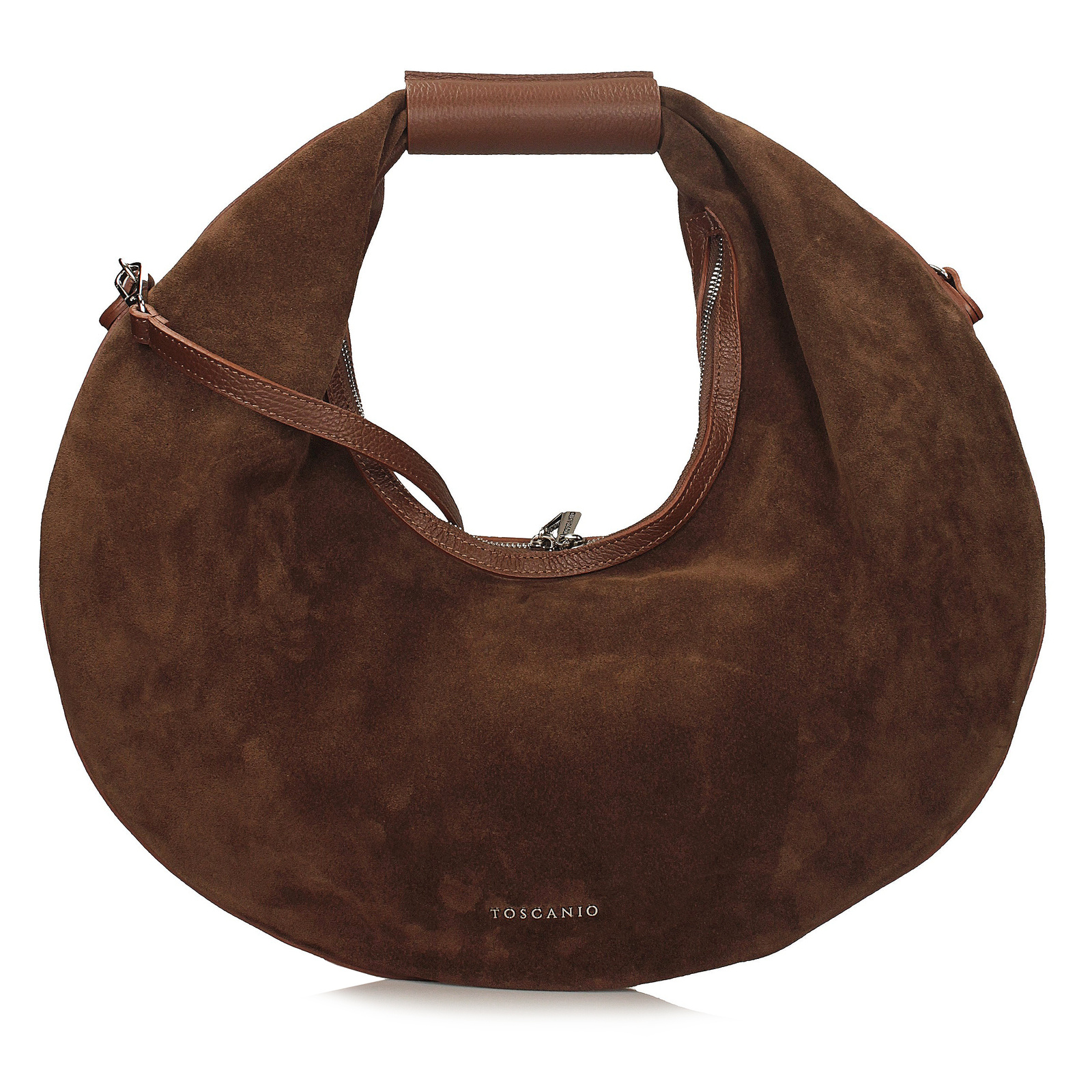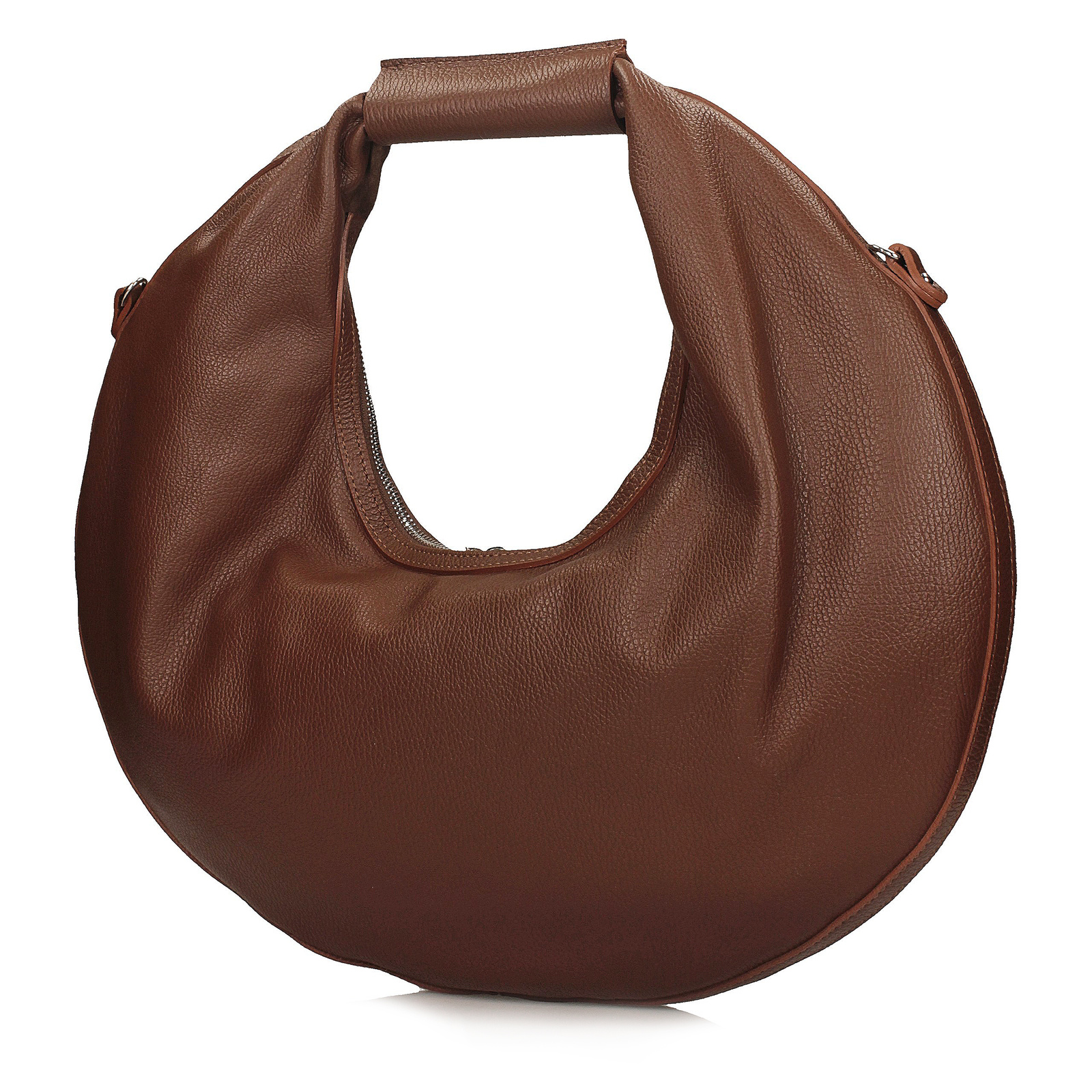 Brązowa torebka typu worek marki Toscanio to oryginalny model w kształcie koła, wyróżniający się ciekawym połączeniem materiałów. Przód wykonany został z miękkiej skóry zamszowej, natomiast tył z gładkiej skóry licowej, co nadaje torebce elegancki i nieco nieformalny charakter. Całość zamykana jest na zamek błyskawiczny w srebrnym kolorze, a wnętrze wyściełane trwałą tkaniną kryje jedną komorę oraz praktyczną kieszeń na drobiazgi. Model posiada skórzany pasek o długości 110 cm, umożliwiający noszenie torebki na ramieniu lub w formie crossbody, a także górny uchwyt z wycięciem o wysokości około 20 cm, który pozwala wygodnie przewiesić ją przez ramię. Ciepły, klasyczny odcień brązu sprawia, że torebka będzie pasować zarówno do codziennych stylizacji, jak i bardziej eleganckich zestawów.