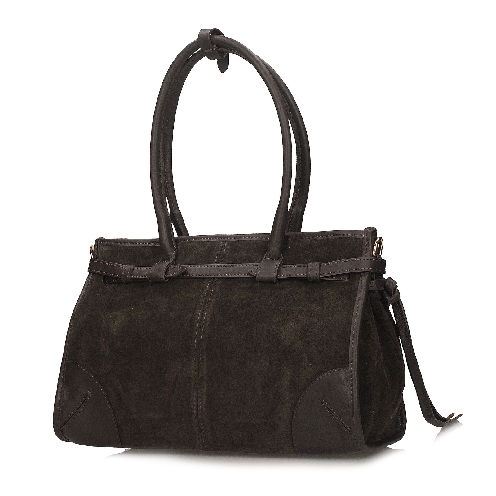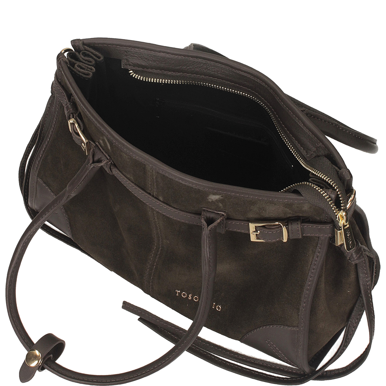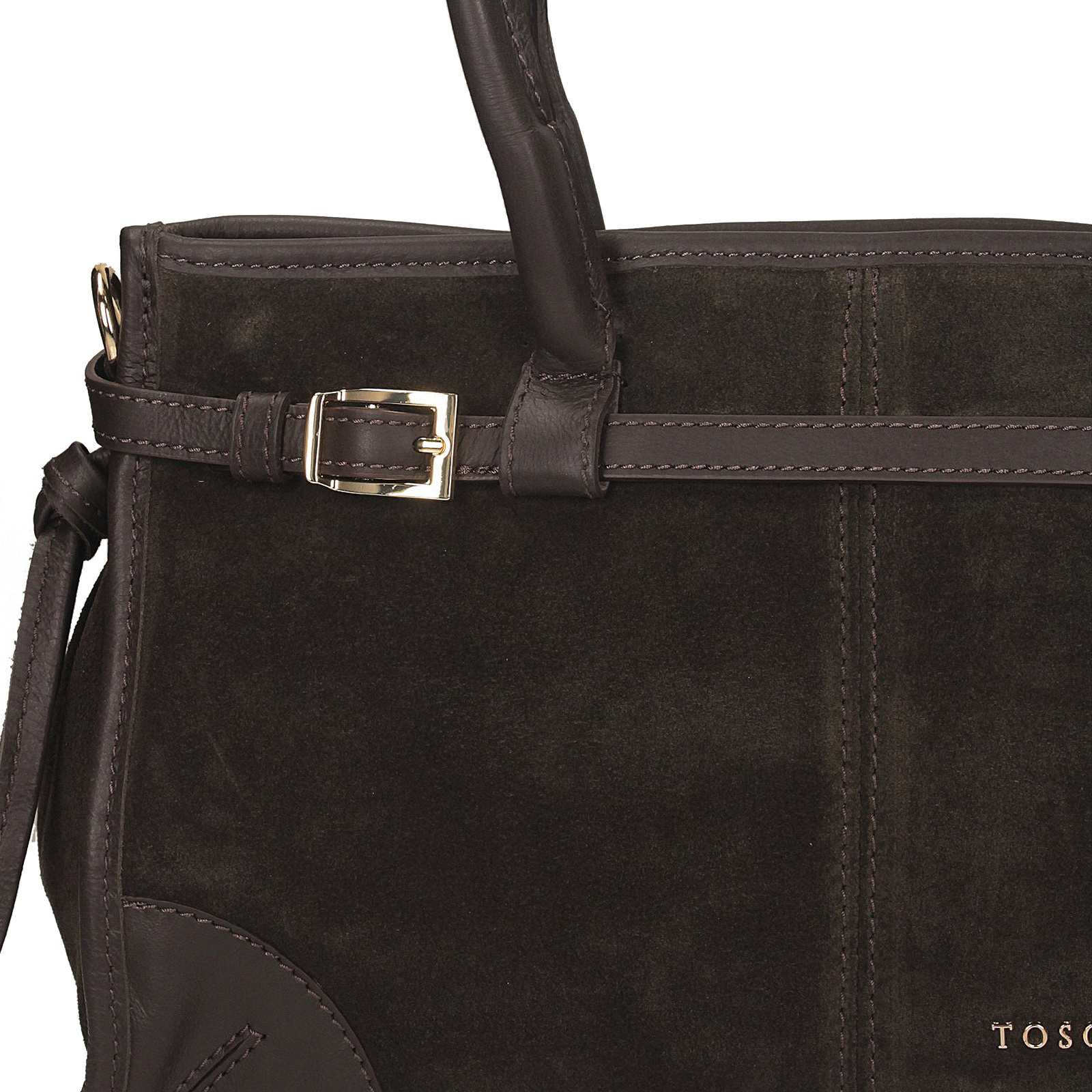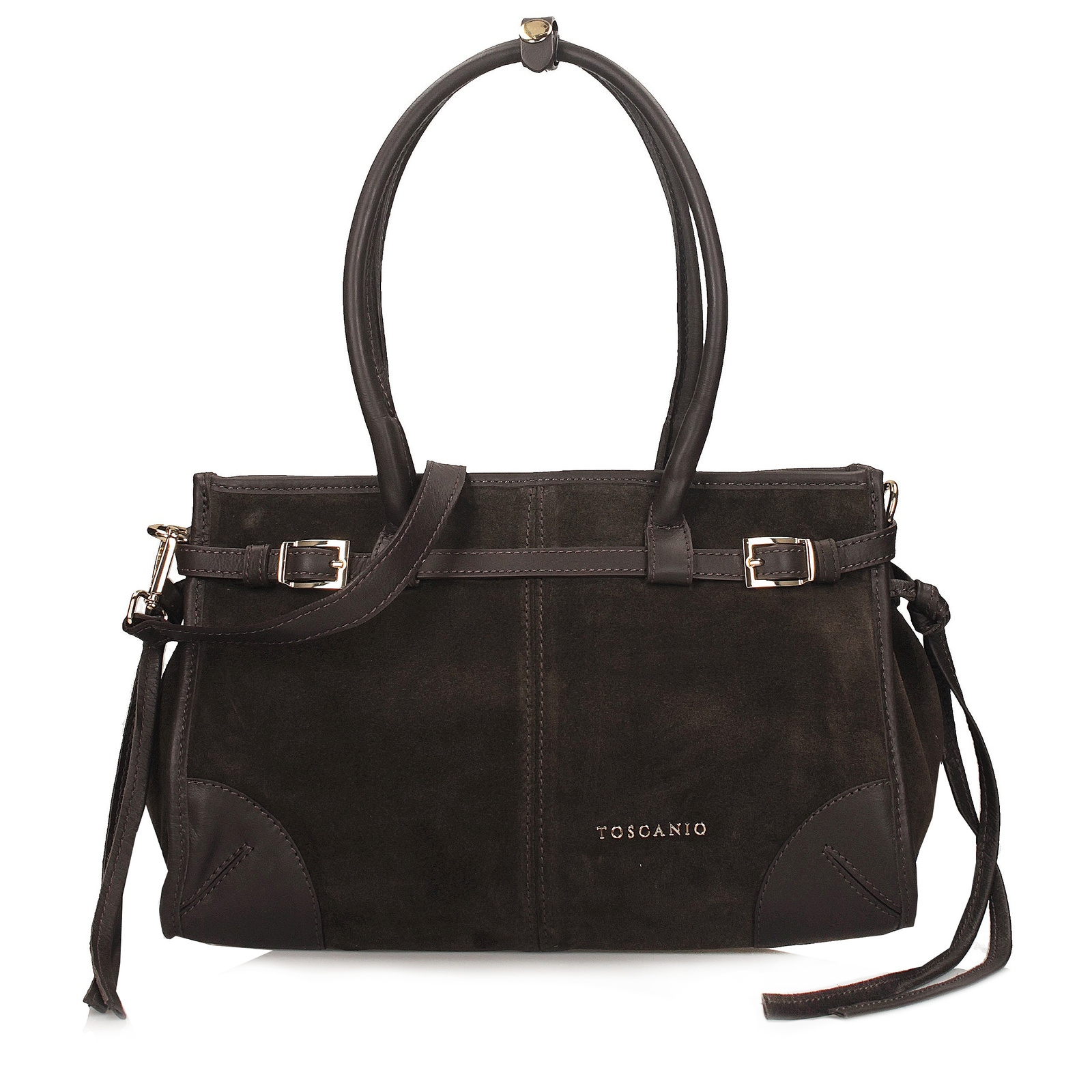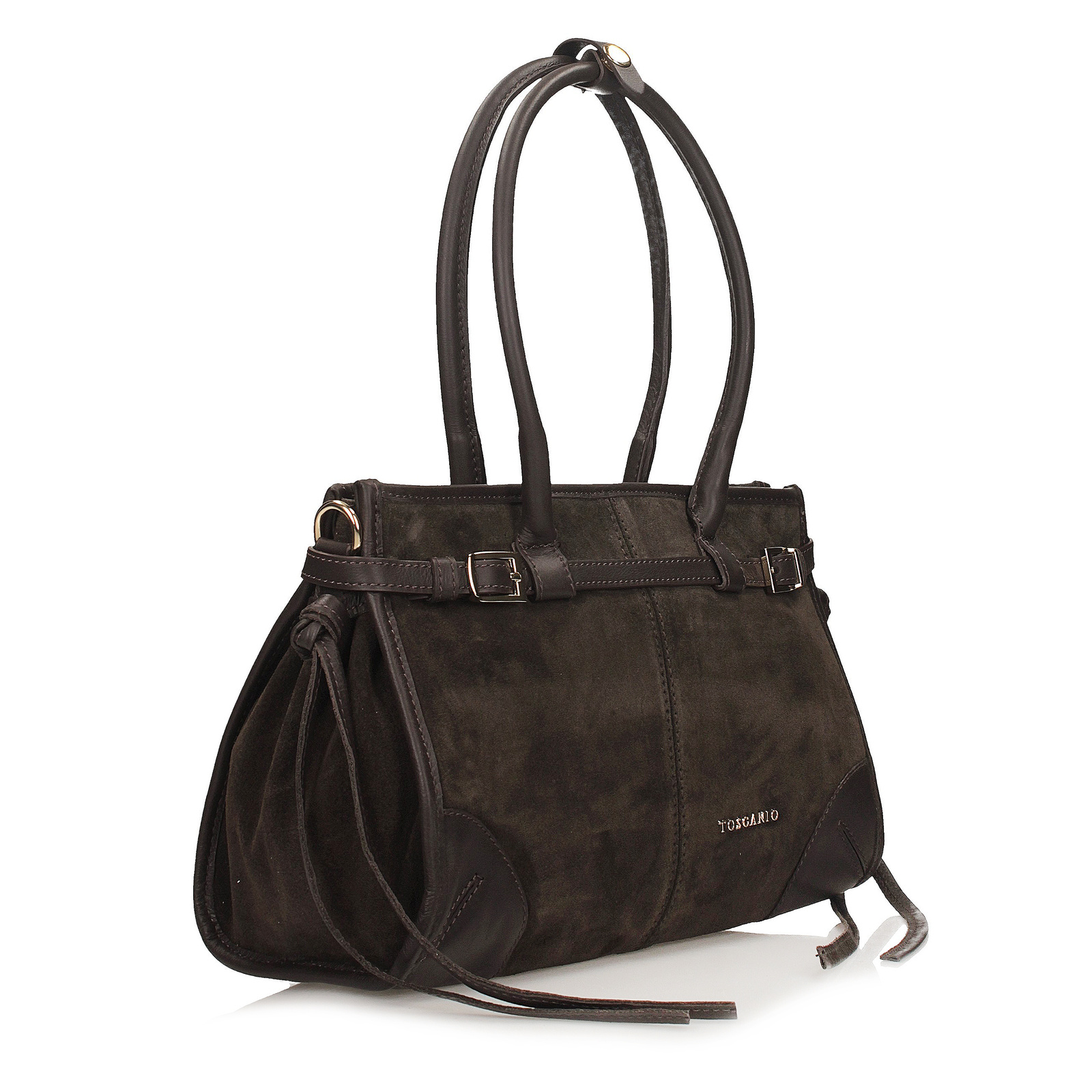 Brązowa torebka klasyczna Toscanio to model, który wyróżnia się eleganckim stylem i dopracowanymi detalami. Wykonana z wysokiej jakości skóry naturalnej zamszowej w ciepłym odcieniu brązu, zachwyca niebanalnym wykończeniem. Po bokach umieszczono skórzane sznureczki, które pozwalają regulować szerokość torebki, dodając jej funkcjonalności i lekkości formy. Charakterystycznym akcentem jest poziomy pasek ze skóry gładkiej, ozdobiony dekoracyjną klamrą, który podkreśla unikatowy charakter modelu. Torebka posiada jedną przestronną komorę zamykaną na zamek błyskawiczny w złotym kolorze, a wewnątrz znajduje się praktyczna kieszeń na drobiazgi. Uszy o długości 45 cm pozwalają nosić ją wygodnie na ramieniu, a dołączony regulowany pasek (110 cm) umożliwia stylowe noszenie crossbody. To idealny wybór dla kobiet ceniących klasykę z odrobiną oryginalności.