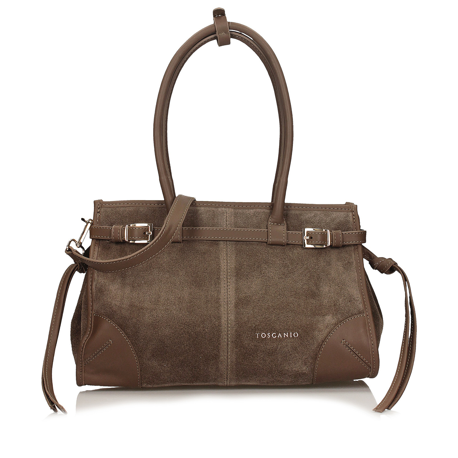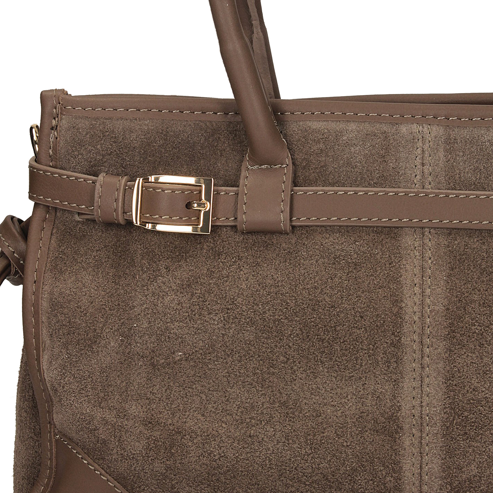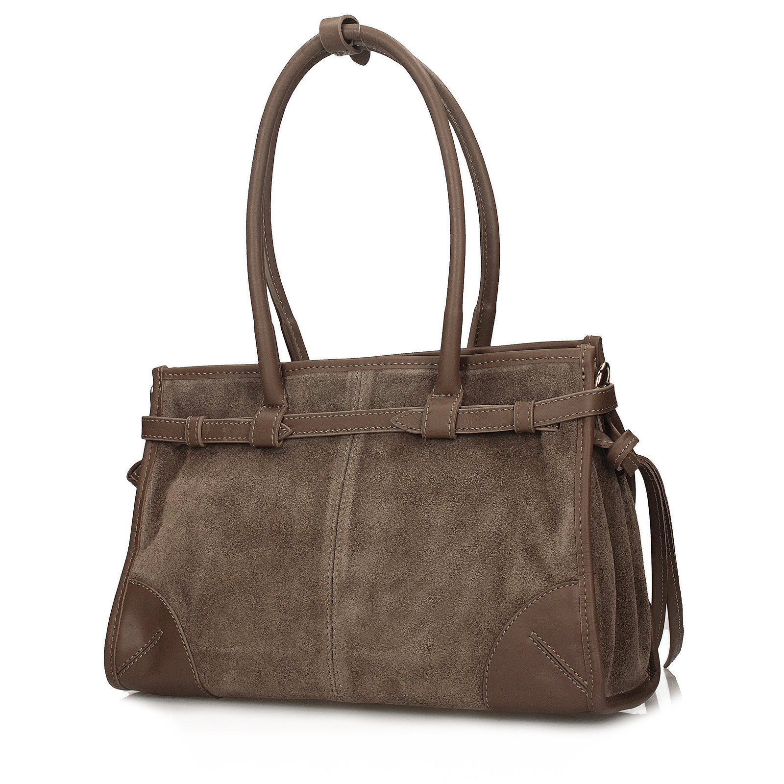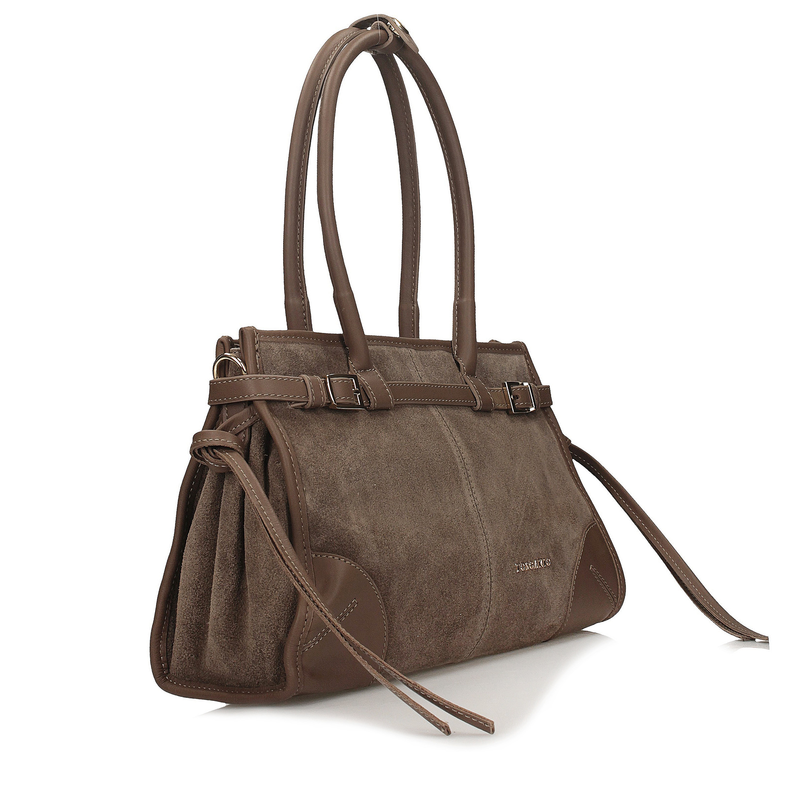 Beżowa torebka klasyczna Toscanio to elegancki model wykonany z wysokiej jakości skóry naturalnej zamszowej w subtelnym, jasnym odcieniu beżu. Jej wyjątkowy design urozmaicają skórzane sznureczki po bokach, które pozwalają regulować szerokość torebki, nadając jej lekkości i nieco swobodnego charakteru. Na froncie umieszczono poziomy pasek z gładkiej skóry, ozdobiony dekoracyjną klamrą, co dodaje całości modowego akcentu. Torebka posiada jedną przestronną komorę zamykaną na zamek błyskawiczny w złotym kolorze, a w środku znajduje się praktyczna kieszeń na drobiazgi. Uszy o długości 45 cm umożliwiają wygodne noszenie na ramieniu, a dodatkowy regulowany pasek (110 cm) pozwala nosić ją także w formie crossbody. To model łączący klasyczną elegancję z oryginalnymi detalami.