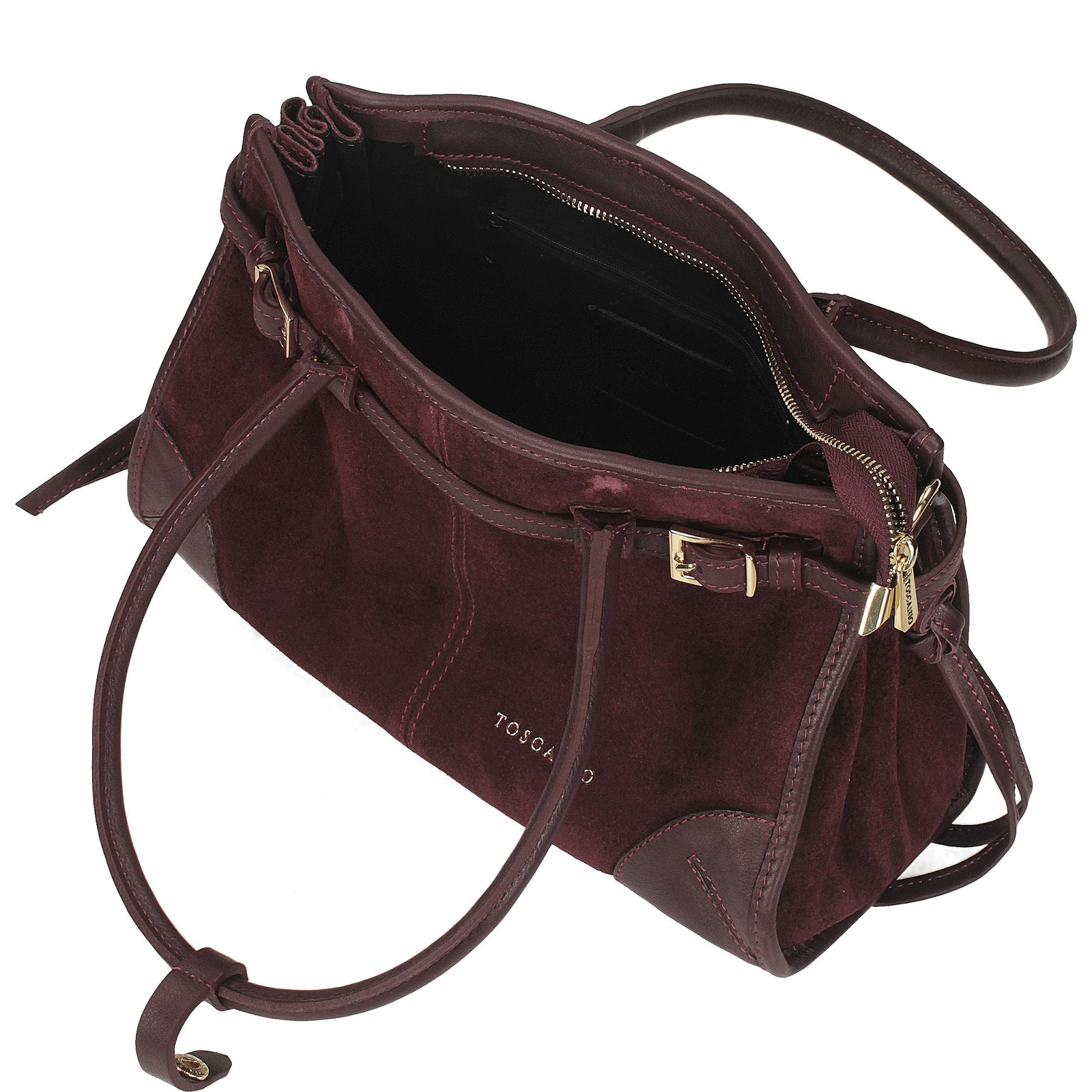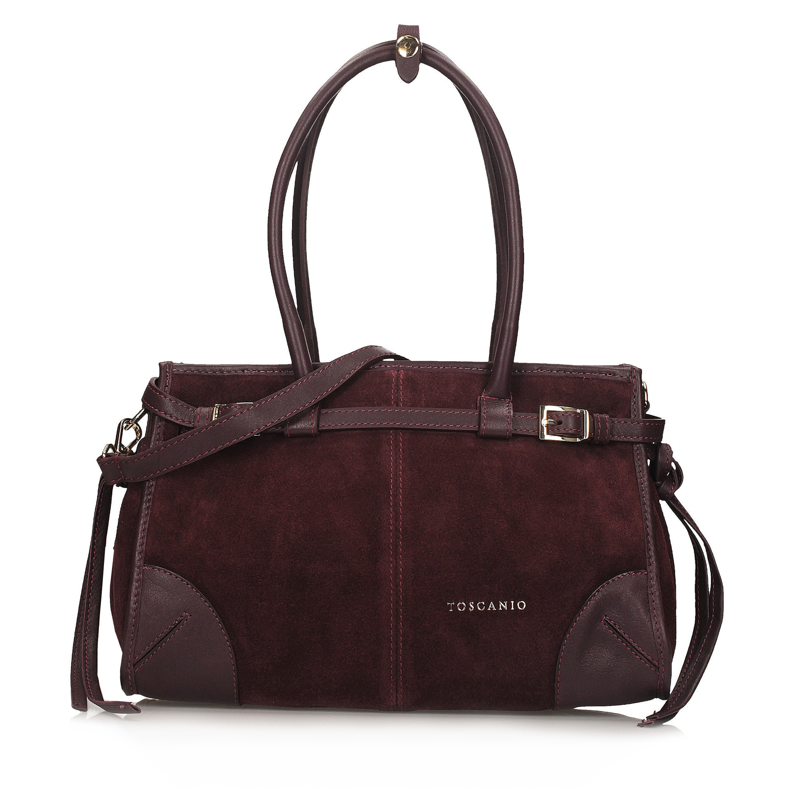Bordowa torebka klasyczna Toscanio to elegancki model wykonany z wysokiej jakości skóry naturalnej zamszowej w głębokim, nasyconym odcieniu bordo. Po bokach zdobią ją skórzane sznureczki, dzięki którym można regulować szerokość torebki, nadając jej nieco swobodny, ale wciąż wyrafinowany charakter. Na froncie znajduje się poziomy pasek z gładkiej skóry, ozdobiony dekoracyjną klamrą, która dodaje całości modowego akcentu. Torebka wyposażona jest w jedną przestronną komorę zapinaną na zamek błyskawiczny w złotym kolorze oraz wewnętrzną kieszeń na drobiazgi. Uszy o długości 45 cm umożliwiają wygodne noszenie w dłoni lub na ramieniu, a regulowany pasek o długości 110 cm pozwala nosić ją także w formie crossbody. Model łączy klasyczną formę z oryginalnymi detalami, tworząc idealną propozycję na co dzień i na specjalne okazje.