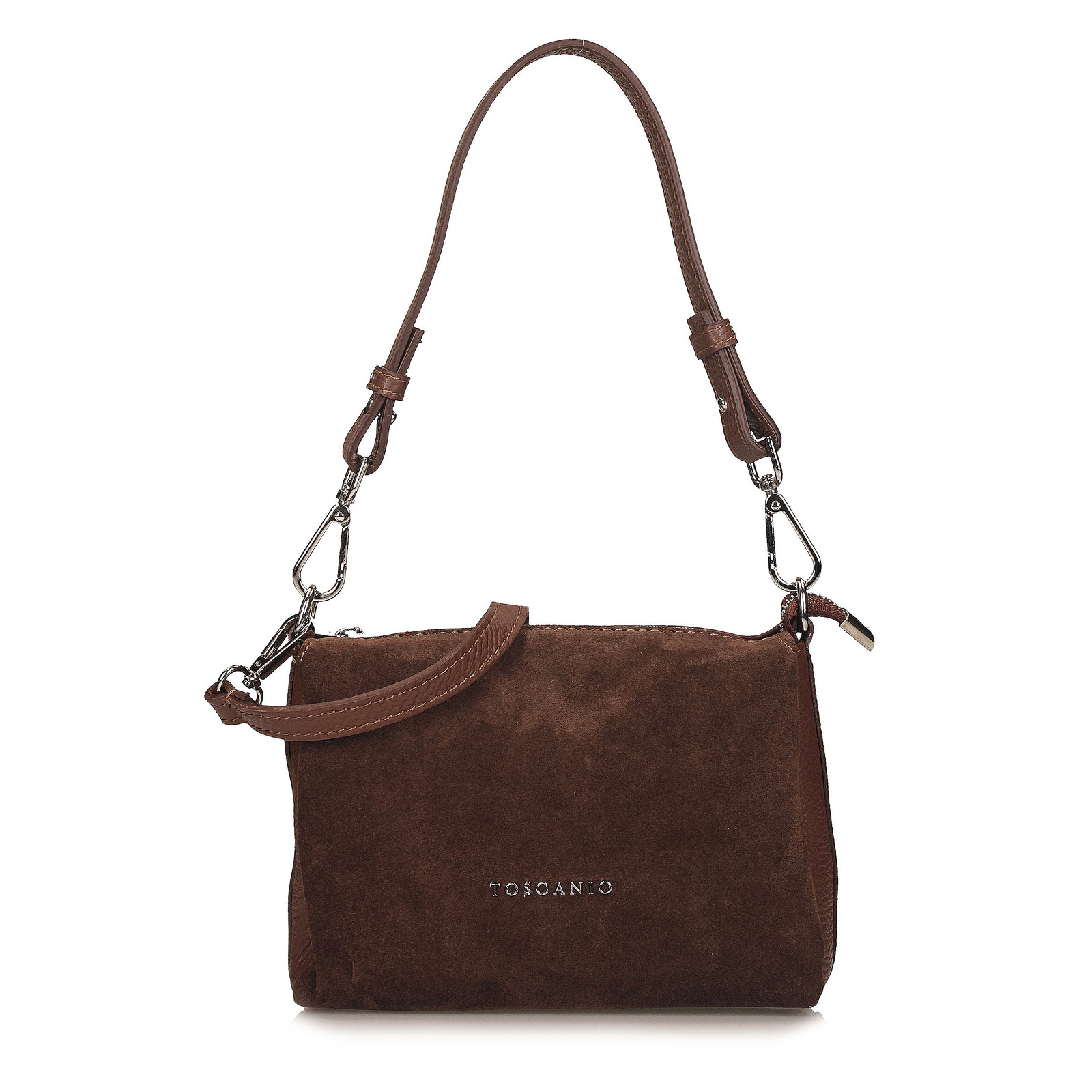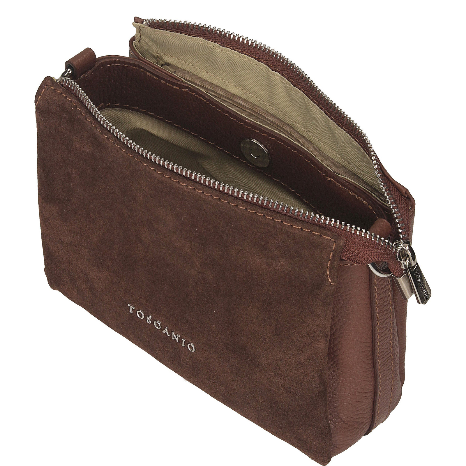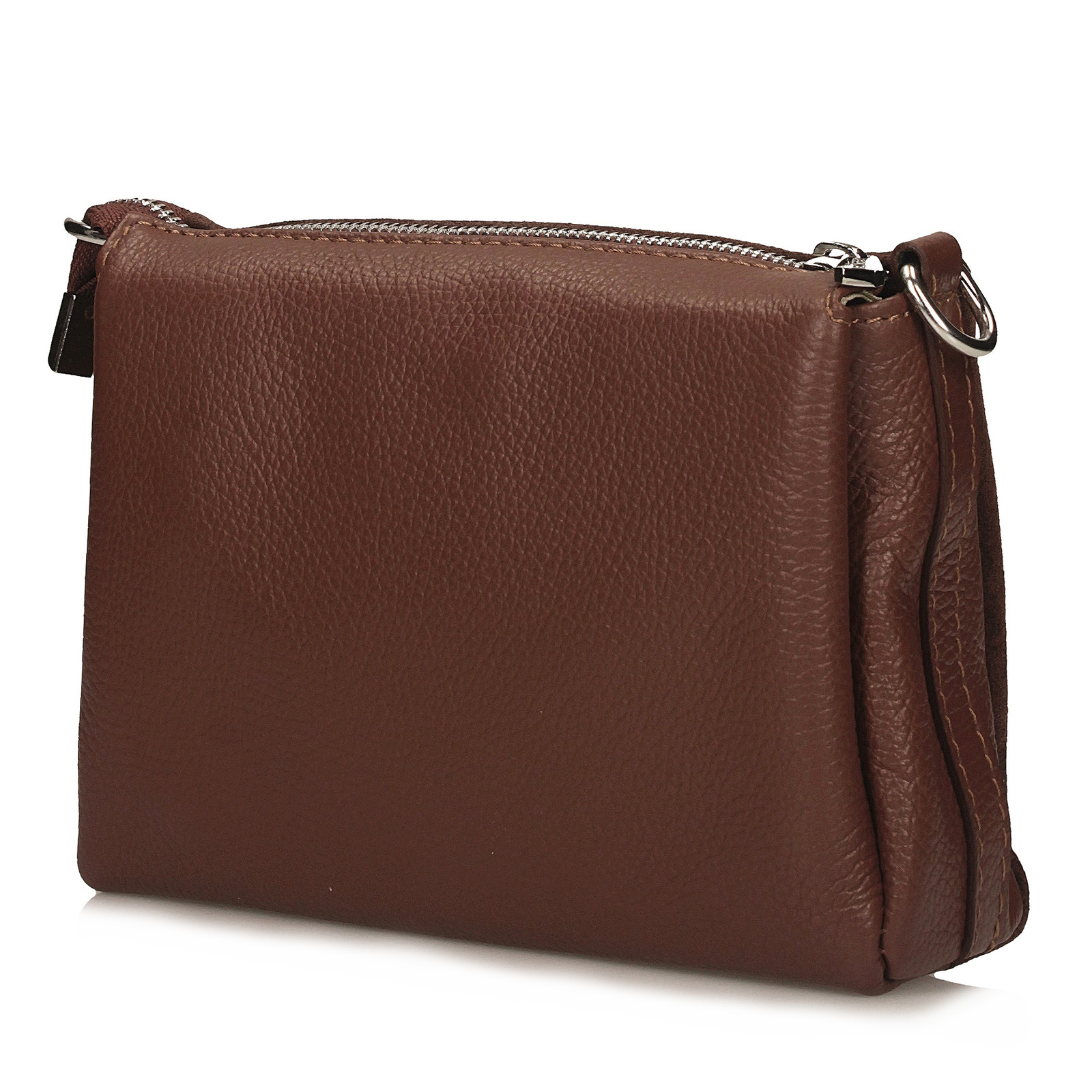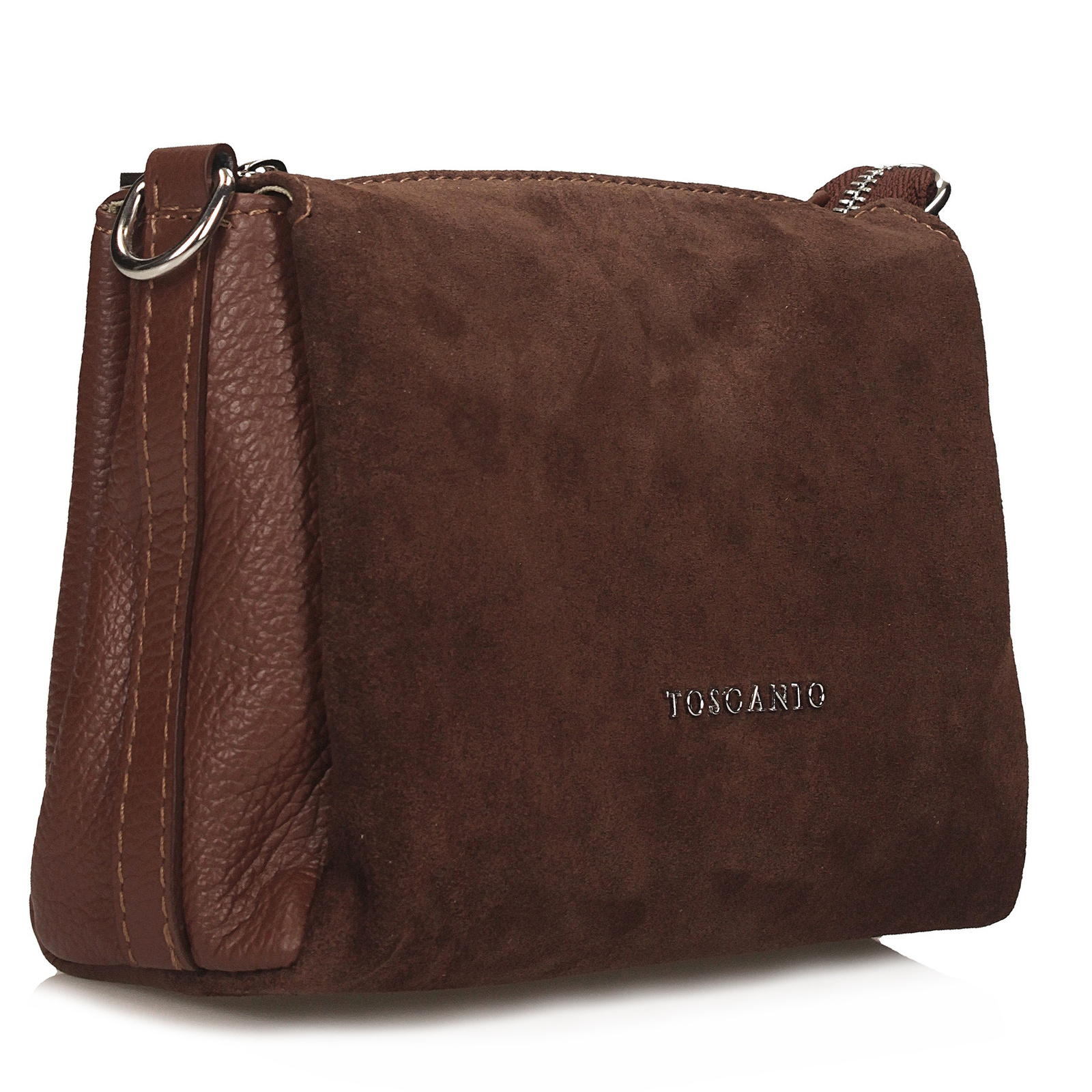 Brązowa listonoszka Toscanio to stylowy i funkcjonalny model wykonany z wysokiej jakości skóry naturalnej. Front torebki zdobi klapka ze skóry zamszowej, która nadaje jej elegancji i wyjątkowego charakteru. Wnętrze zostało podzielone na trzy oddzielne sekcje, zamykane jednocześnie jednym zamkiem błyskawicznym w srebrnym kolorze, co zapewnia wygodę i bezpieczeństwo przechowywania. Całość wyściełana jest trwałą tkaniną, a wewnątrz znajduje się dodatkowa kieszeń na drobiazgi. Regulowany pasek ze skóry naturalnej o długości 120 cm umożliwia wygodne noszenie torebki na ramieniu lub w formie crossbody. Ciepły, klasyczny odcień brązu sprawia, że model ten doskonale uzupełni zarówno codzienne, jak i bardziej eleganckie stylizacje.