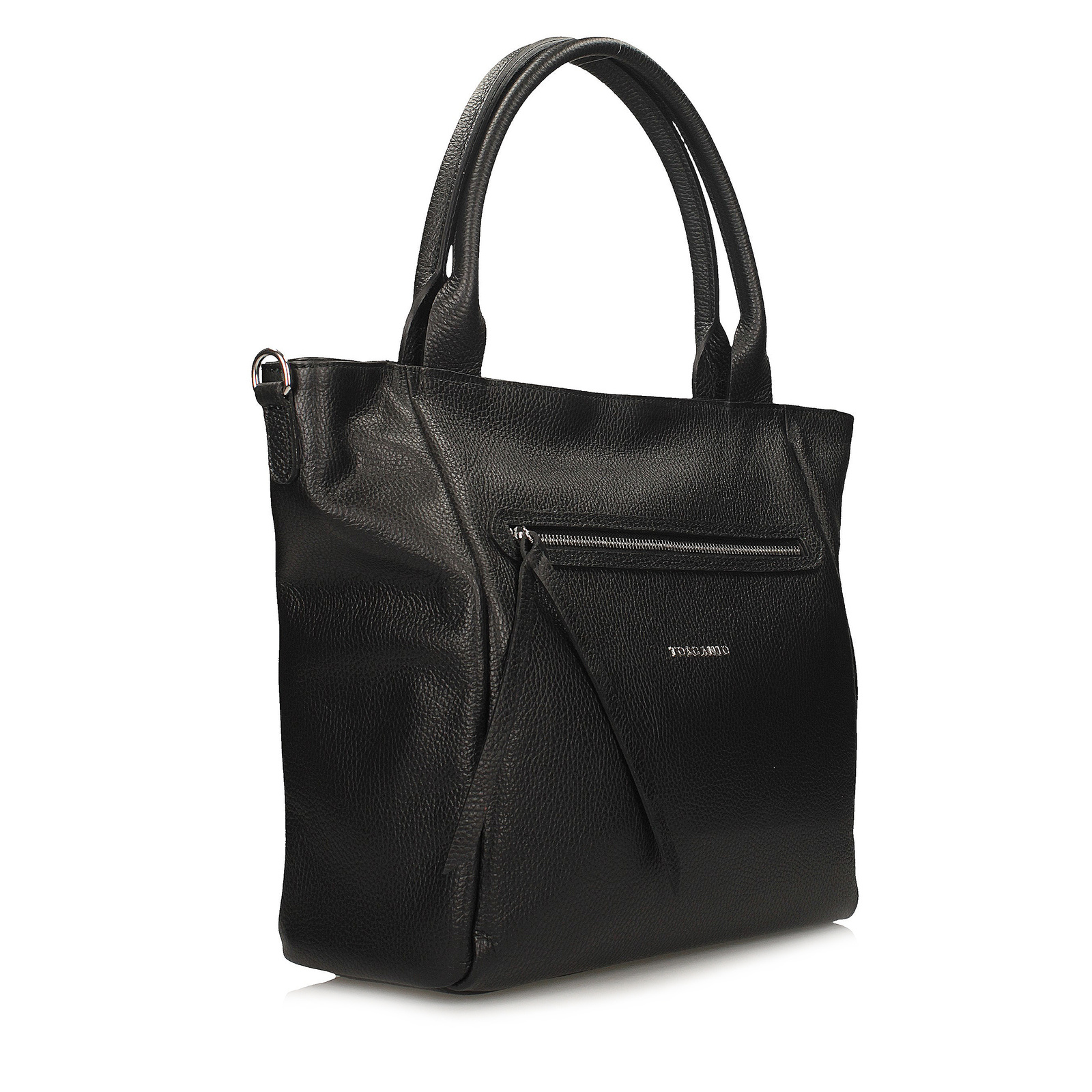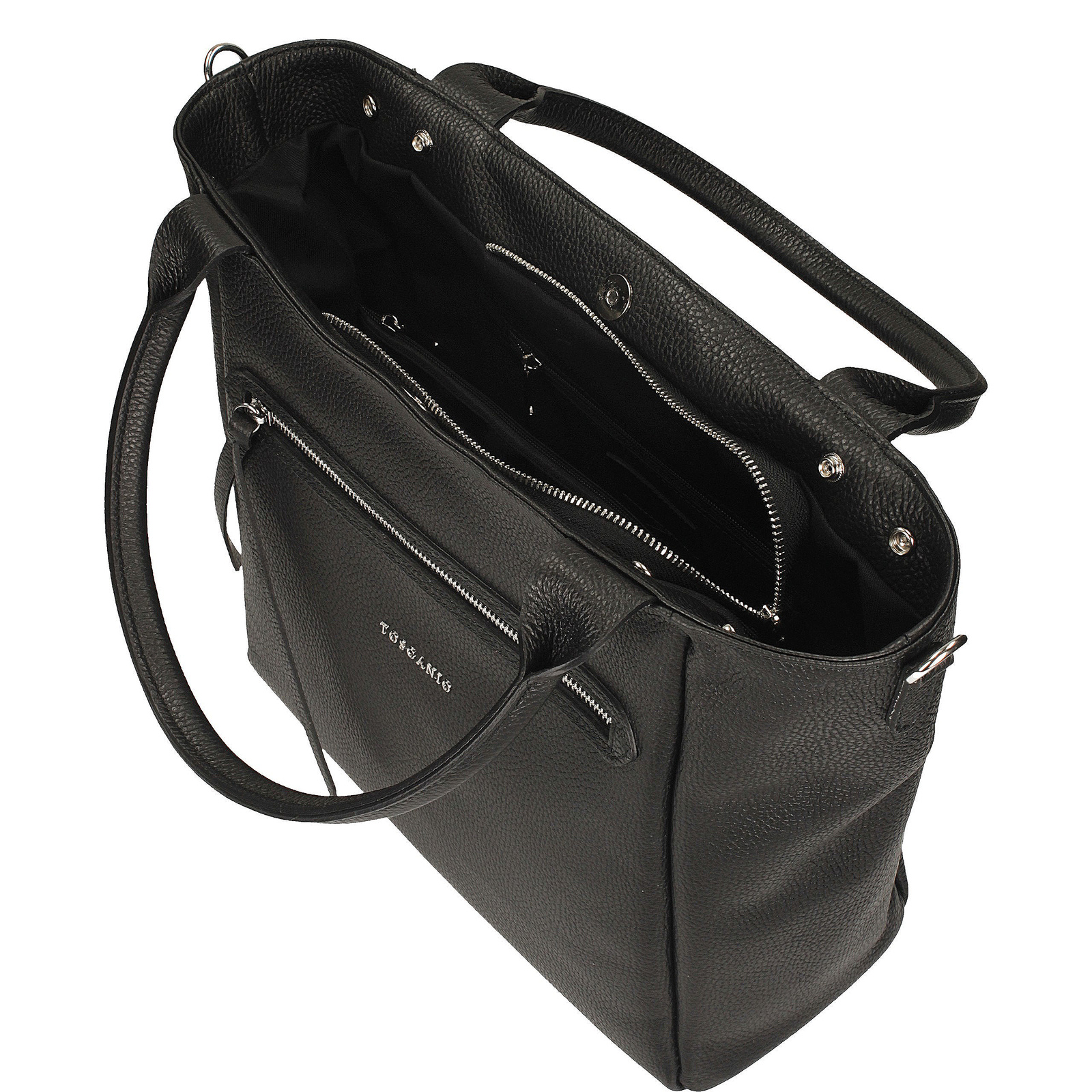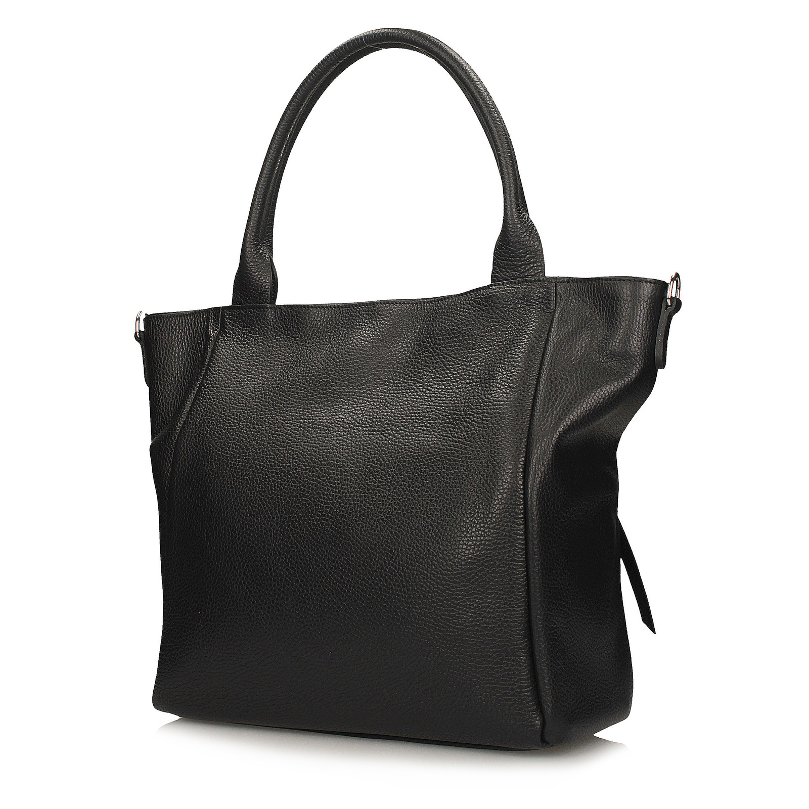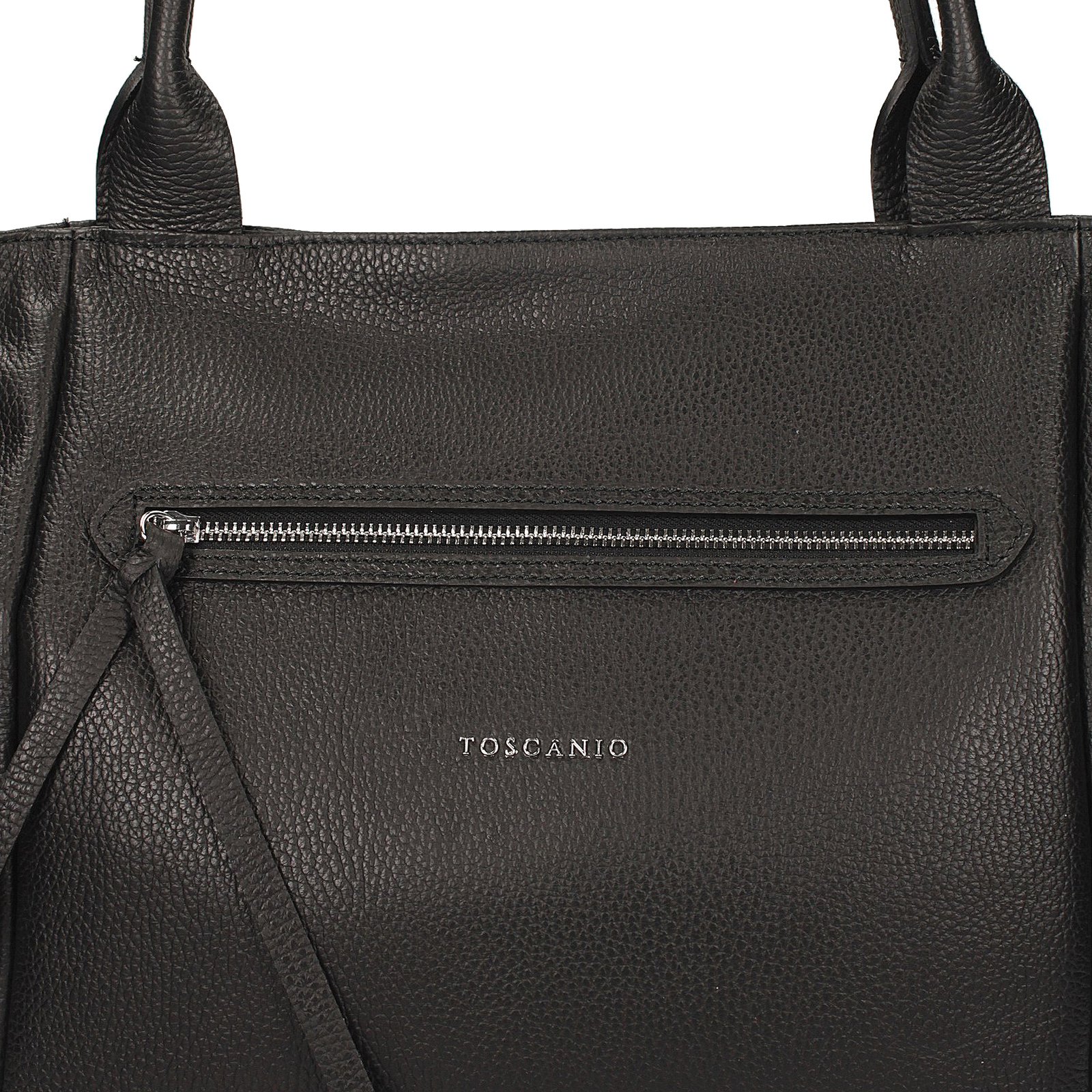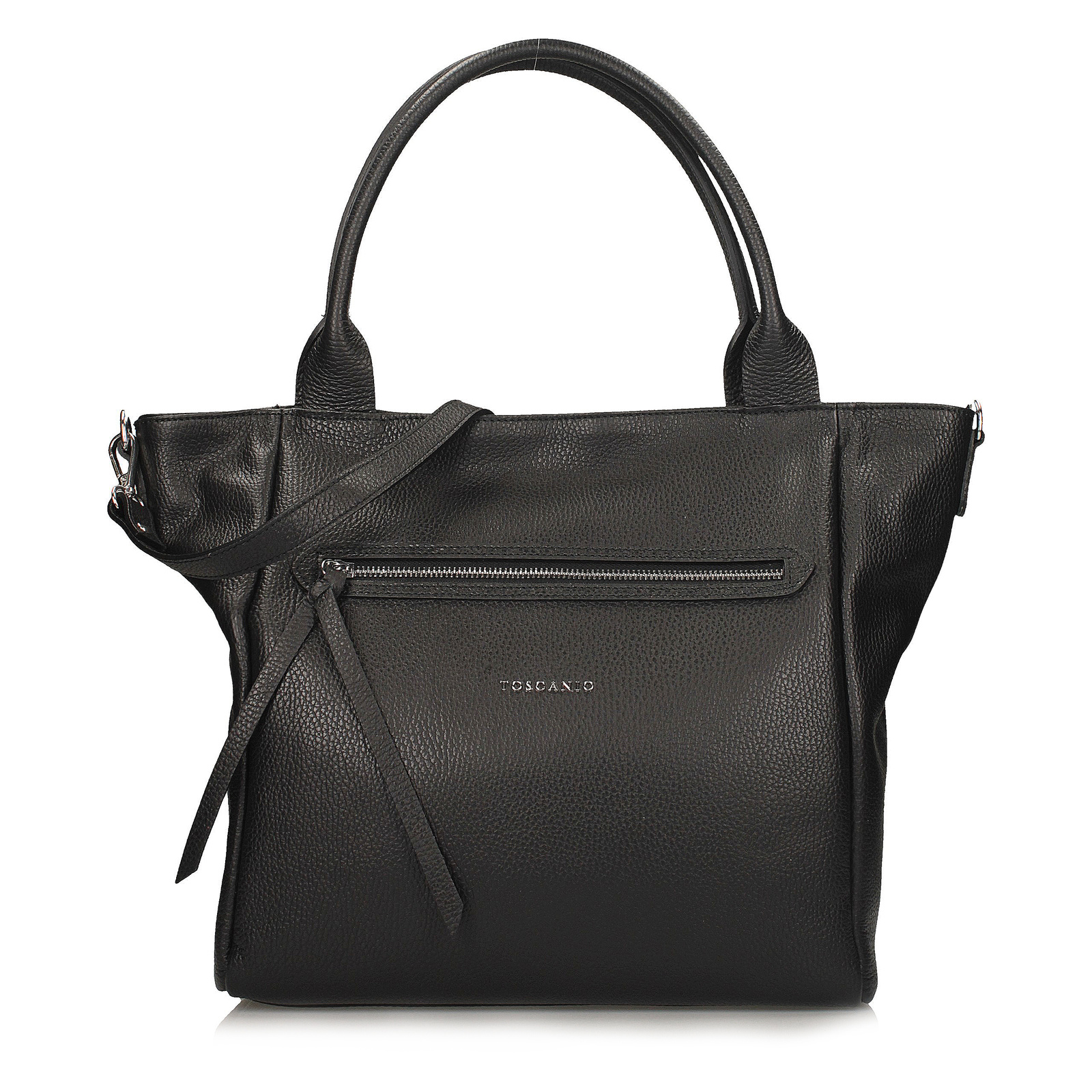 Klasyczna torebka Toscanio w kolorze czarnym to połączenie elegancji i praktyczności. Wykonana z wysokiej jakości skóry naturalnej, zachowuje swoją formę i prezentuje się niezwykle stylowo. Wyposażona w dwa wygodne uchwyty o długości 50 cm, pozwala na komfortowe noszenie w dłoni lub na ramieniu. Torebka ma dwie oddzielne komory zamykane na zamek błyskawiczny w kolorze srebrnym, a wnętrze wyściełane trwałą tkaniną kryje trzy kieszenie. Ciekawym detalem są ukryte po bokach klipsy, dzięki którym można regulować szerokość górnej części torebki – wąska wersja podkreśla elegancję, a szersza zwiększa pojemność. Model bez trudu mieści format A4, co czyni go idealnym do pracy, na uczelnię czy codzienne wyjścia.