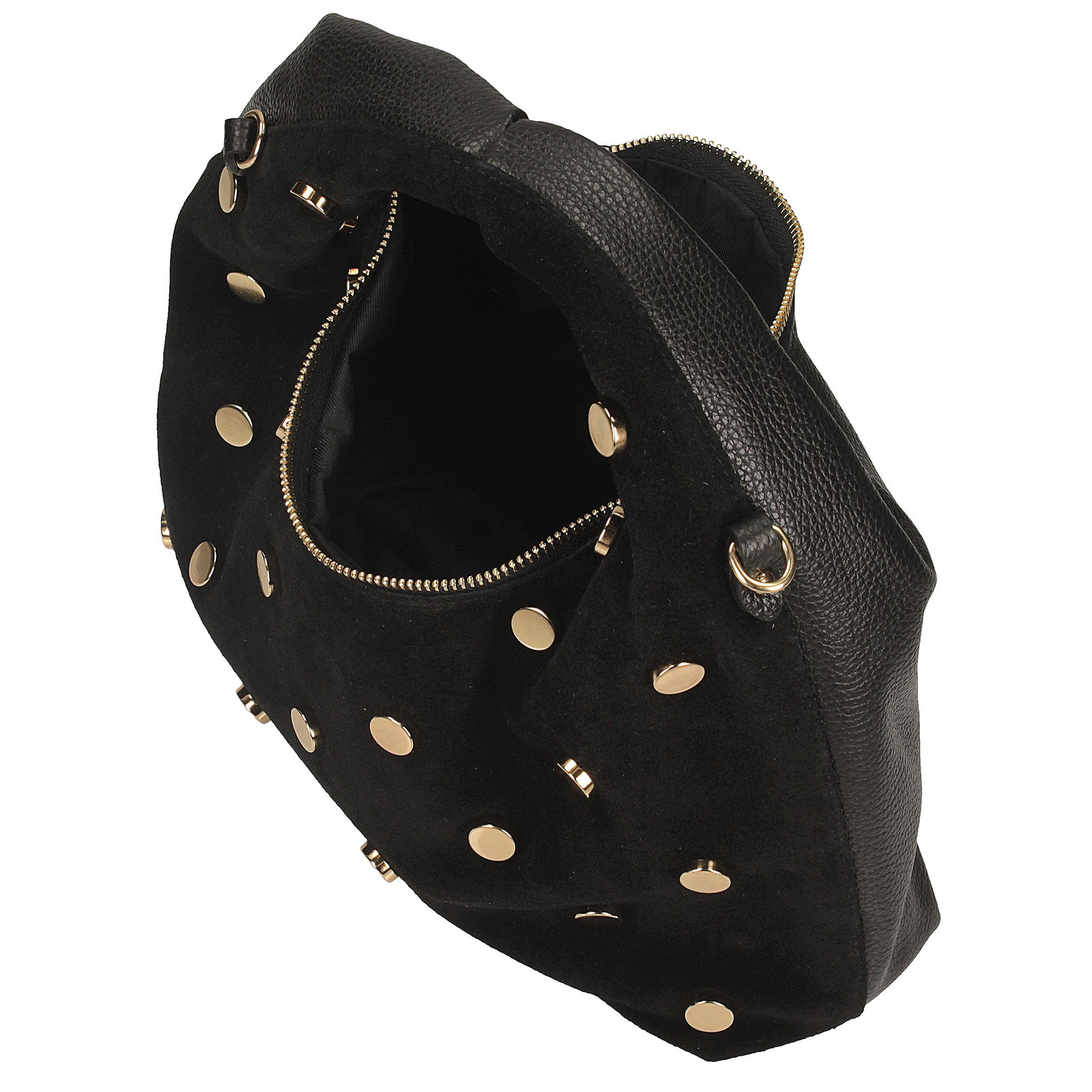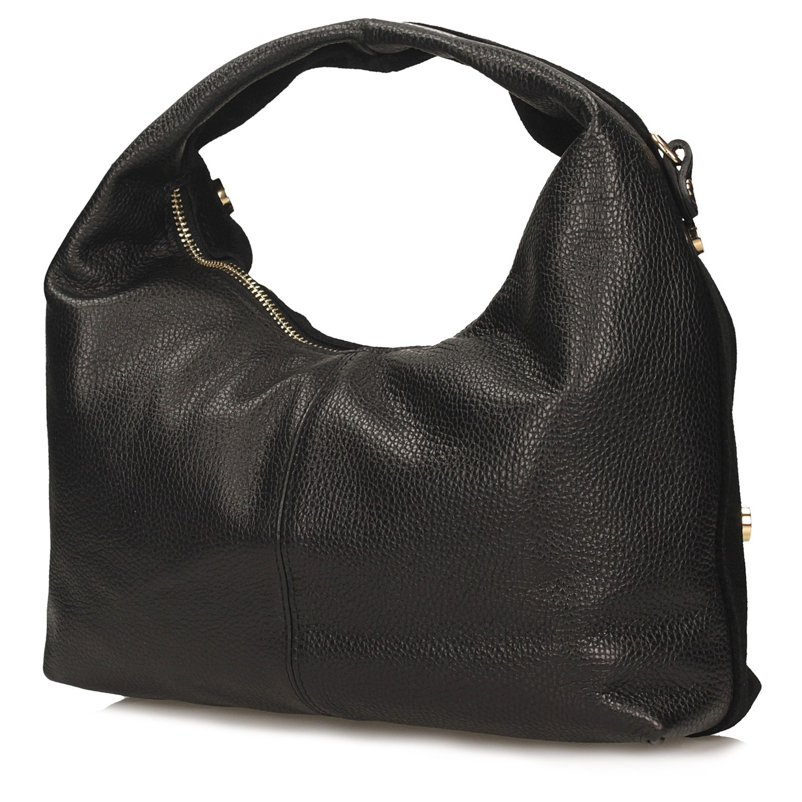 Czarna listonoszka Toscanio to wyjątkowy model, który łączy w sobie elegancję kopertówki i swobodny charakter torebki typu worek. Wykonana ze skóry zamszowej, zachwyca miękką fakturą. Jej prostą formę urozmaicają dekoracyjne złote dżety, które dodają całości wyrazistości i modowego charakteru. Torebkę można nosić na kilka sposobów – w dłoni jak elegancką kopertówkę lub przewieszoną przez ramię dzięki dłuższemu, regulowanemu paskowi ze skóry naturalnej o długości 115 cm. Wnętrze, wykończone podszewką z tkaniny, skrywa jedną komorę oraz dodatkową kieszeń na drobiazgi. Całość zamykana jest na zamek błyskawiczny w złotym kolorze, który harmonijnie komponuje się z detalami. Stylowa, uniwersalna i funkcjonalna – idealna zarówno na co dzień, jak i na wieczorne wyjścia.