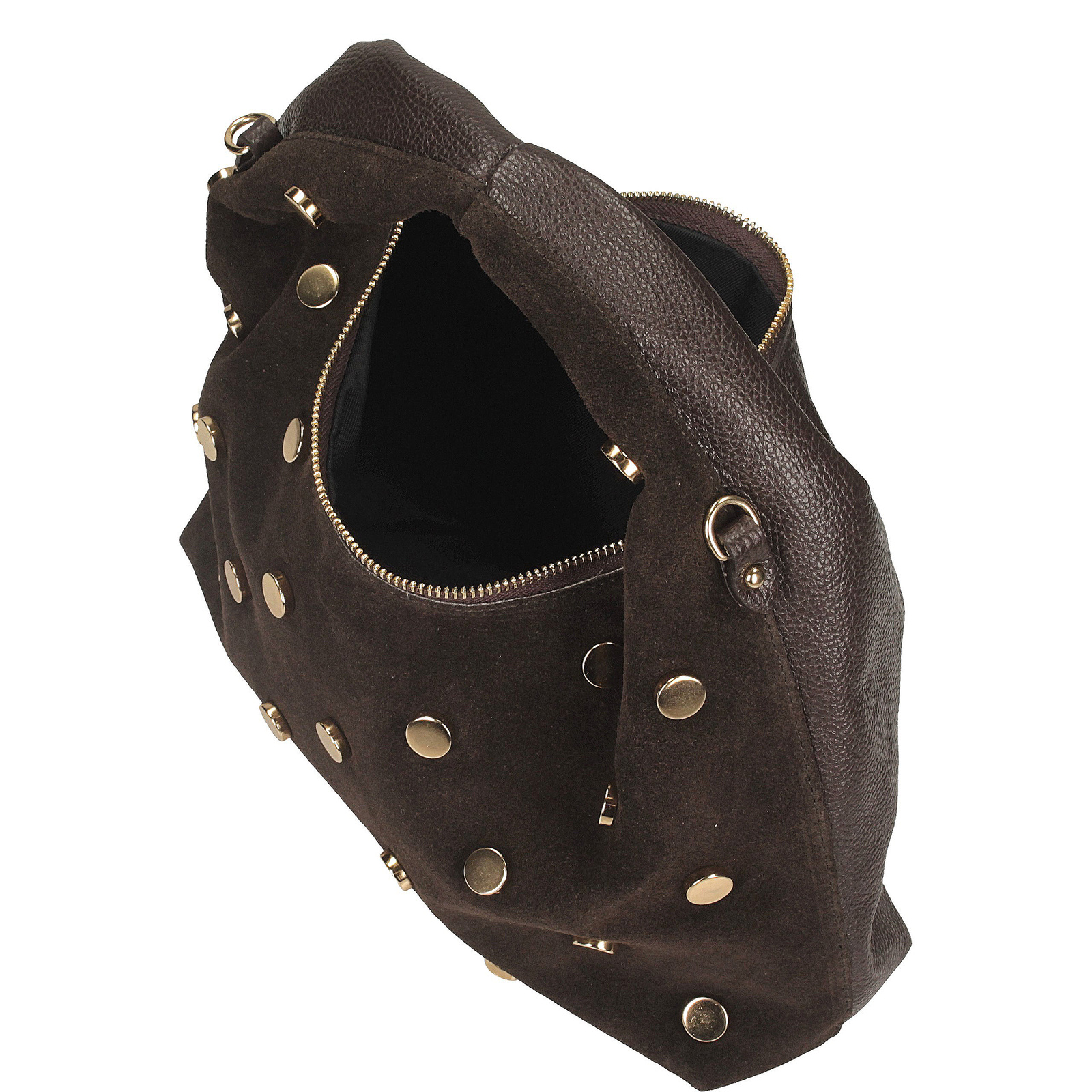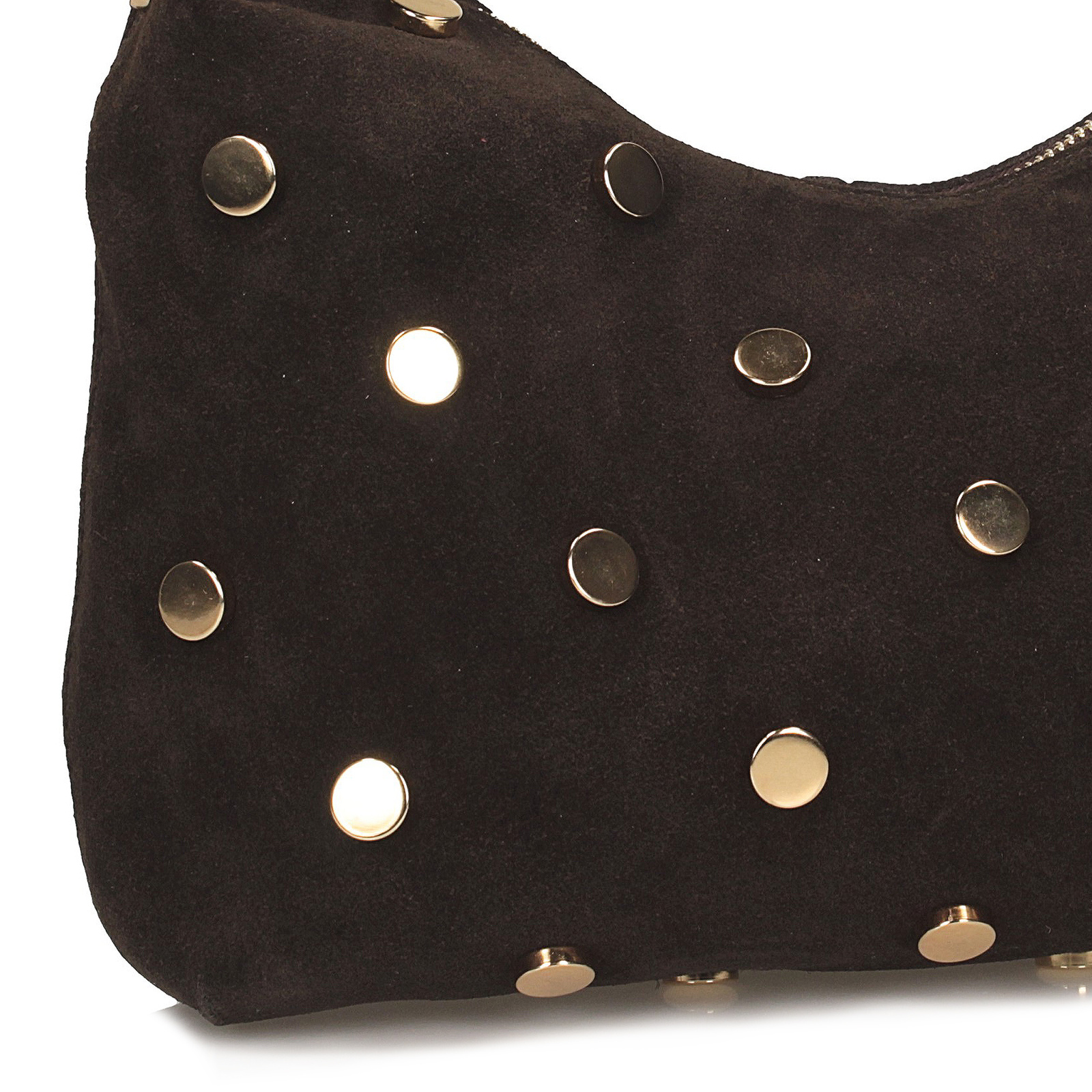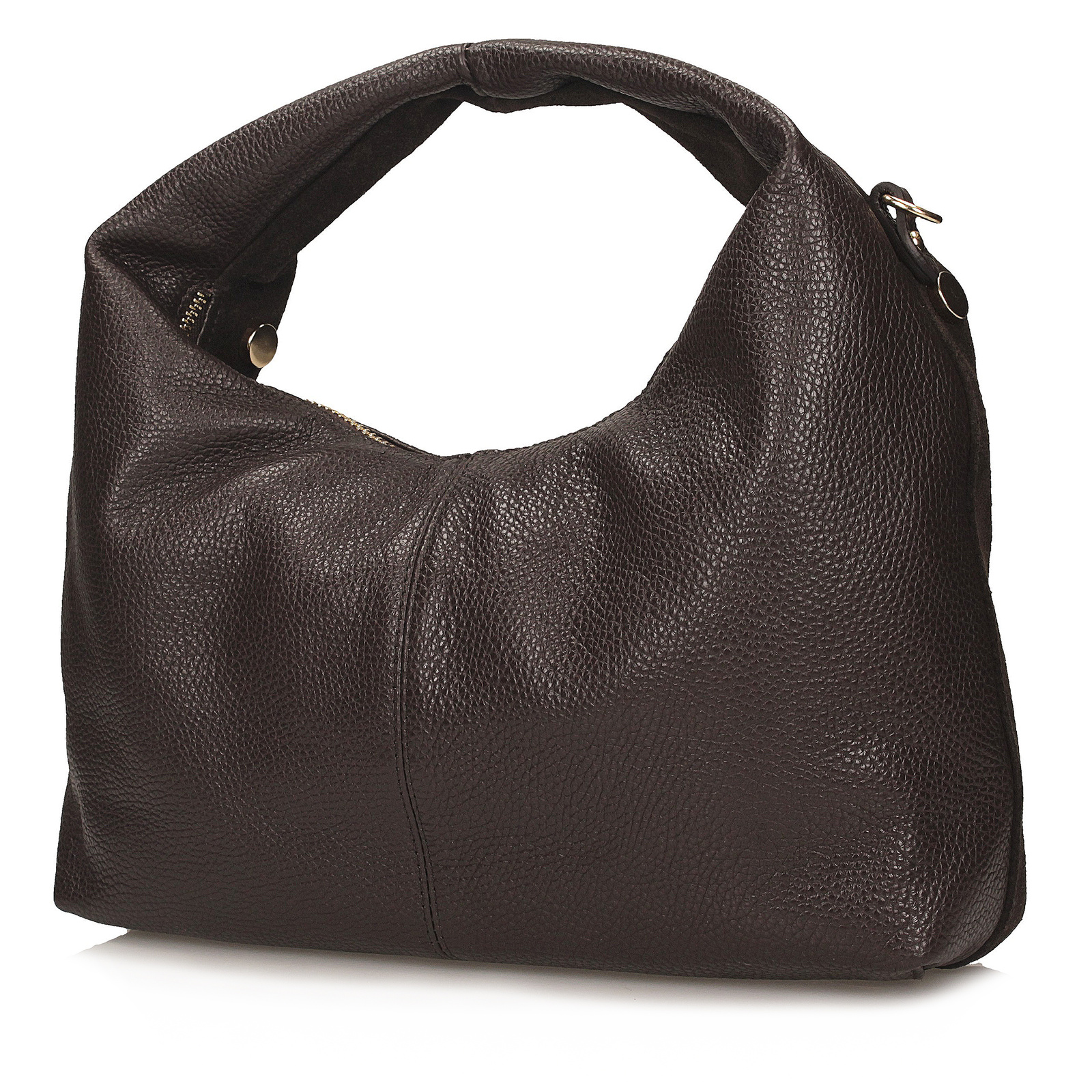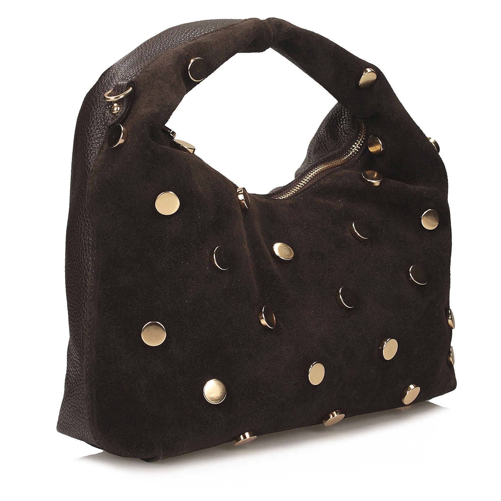 Ciemnobrązowa listonoszka Toscanio to elegancki i zarazem stylowy model, który świetnie łączy formę kopertówki z lekko workowym charakterem. Wykonana z miękkiej skóry zamszowej, prezentuje się niezwykle szlachetnie i ponadczasowo. Jej minimalistyczny fason został urozmaicony złotymi dżetami, które dodają całości wyrazistości i modnego akcentu. Torebkę można nosić na dwa sposoby – w dłoni jako elegancką kopertówkę lub przewieszoną przez ramię dzięki dłuższemu, regulowanemu paskowi ze skóry naturalnej o długości 115 cm. Wnętrze wyściełane tkaniną kryje jedną praktyczną komorę oraz kieszeń wewnętrzną na drobiazgi. Całość zamykana jest na zamek w złotym kolorze, doskonale komponujący się z dekoracyjnymi detalami. To model, który dopełni zarówno codzienne, jak i wieczorowe stylizacje.