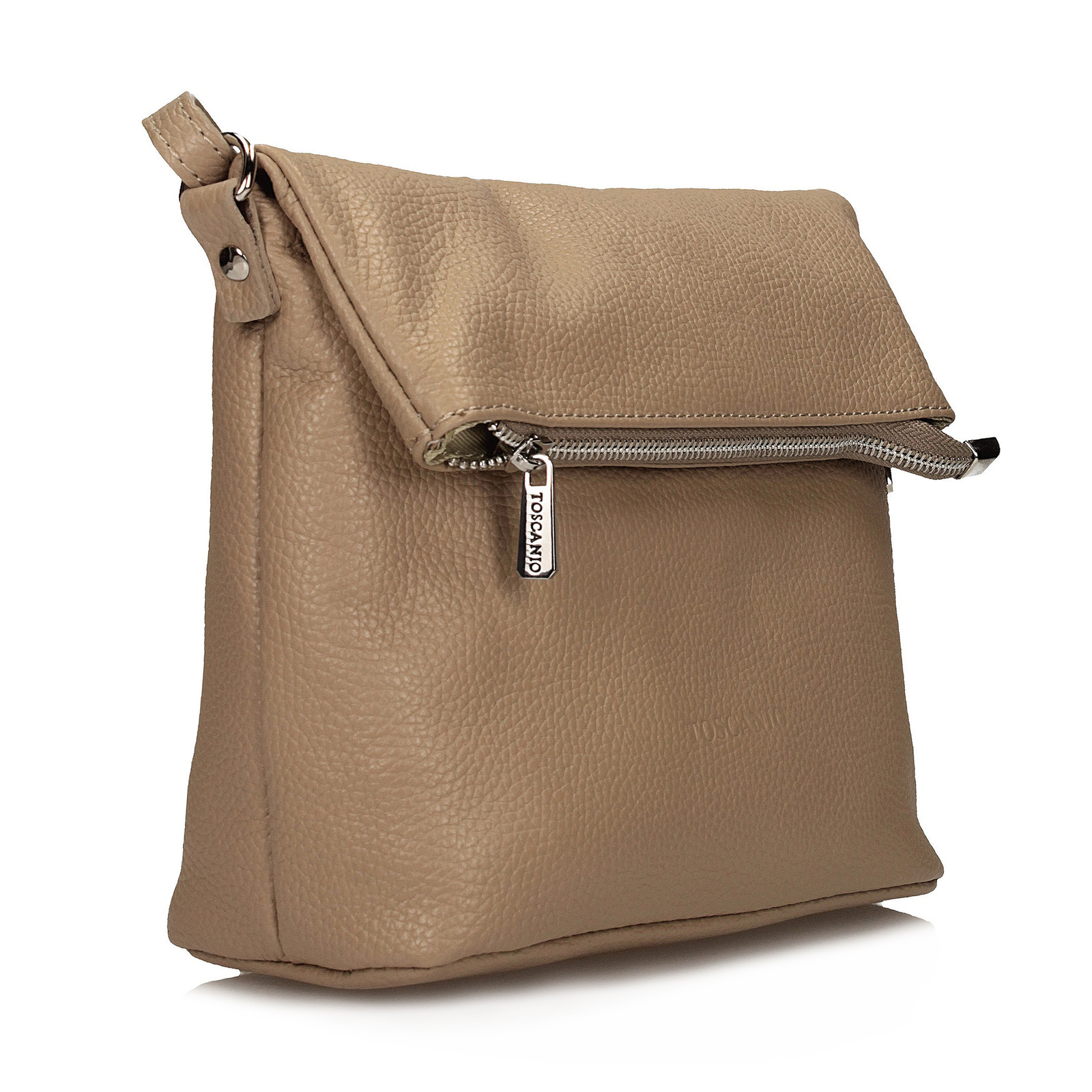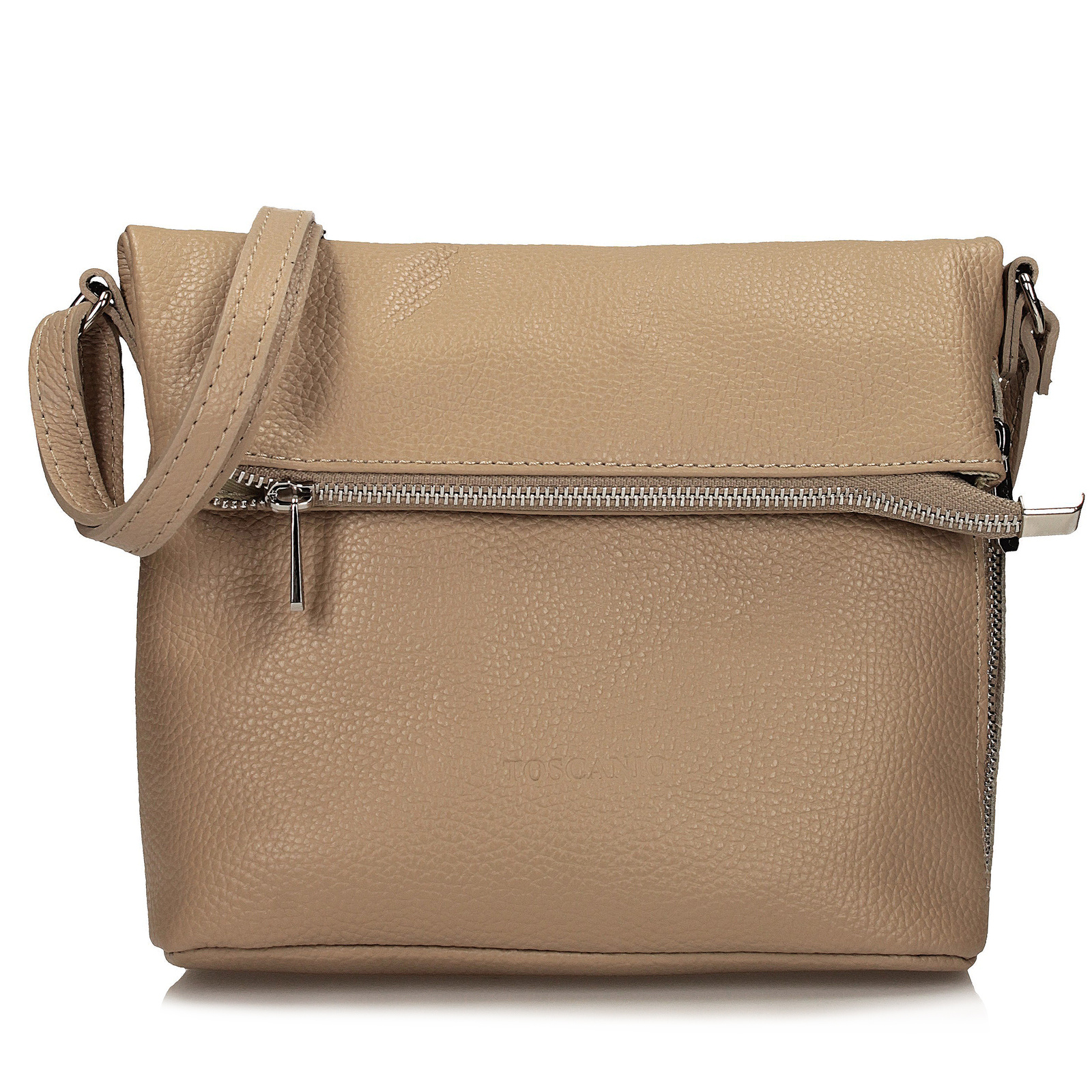 Beżowa listonoszka Toscanio to klasyczny, ponadczasowy model, który łączy prostotę formy z elegancją naturalnych materiałów. Wykonana w całości ze skóry naturalnej, zachwyca gładką fakturą i uniwersalnym odcieniem beżu. Charakterystycznym elementem jest miękka klapka, która delikatnie się zawija, nadając torebce subtelny, swobodny wygląd. Klapka zapinana jest na dyskretny magnes, dodatkowo posiada zamek błyskawiczny w srebrnym kolorze, chroniący zawartość. Wnętrze wykończone tkaniną mieści jedną przestronną komorę, w której można wygodnie schować niezbędne drobiazgi. Długi, regulowany pasek ze skóry naturalnej (110 cm) pozwala nosić torebkę zarówno na ramieniu, jak i crossbody. Model idealny na co dzień, do pracy i na spacer.