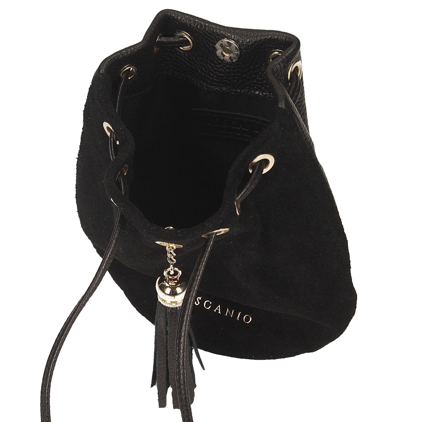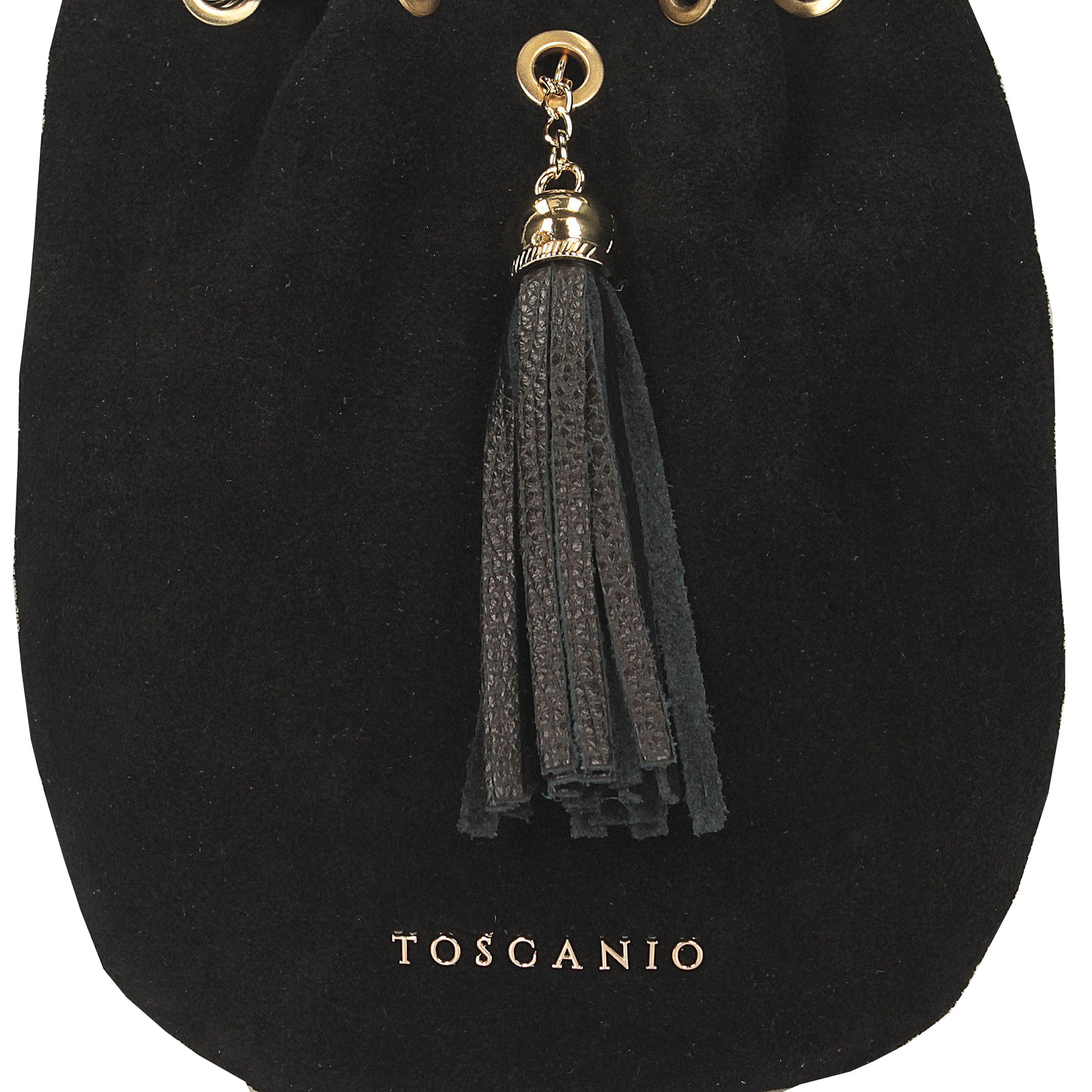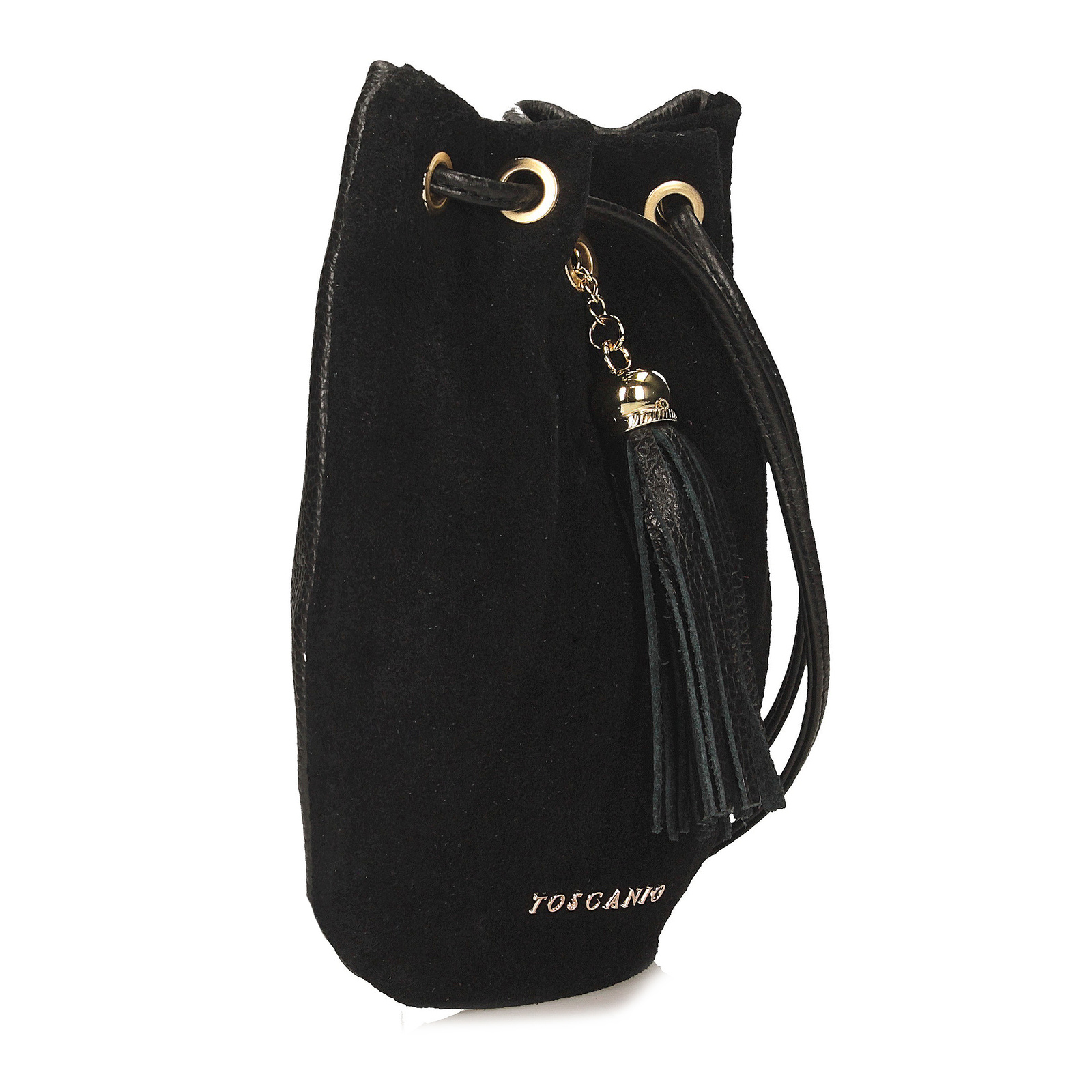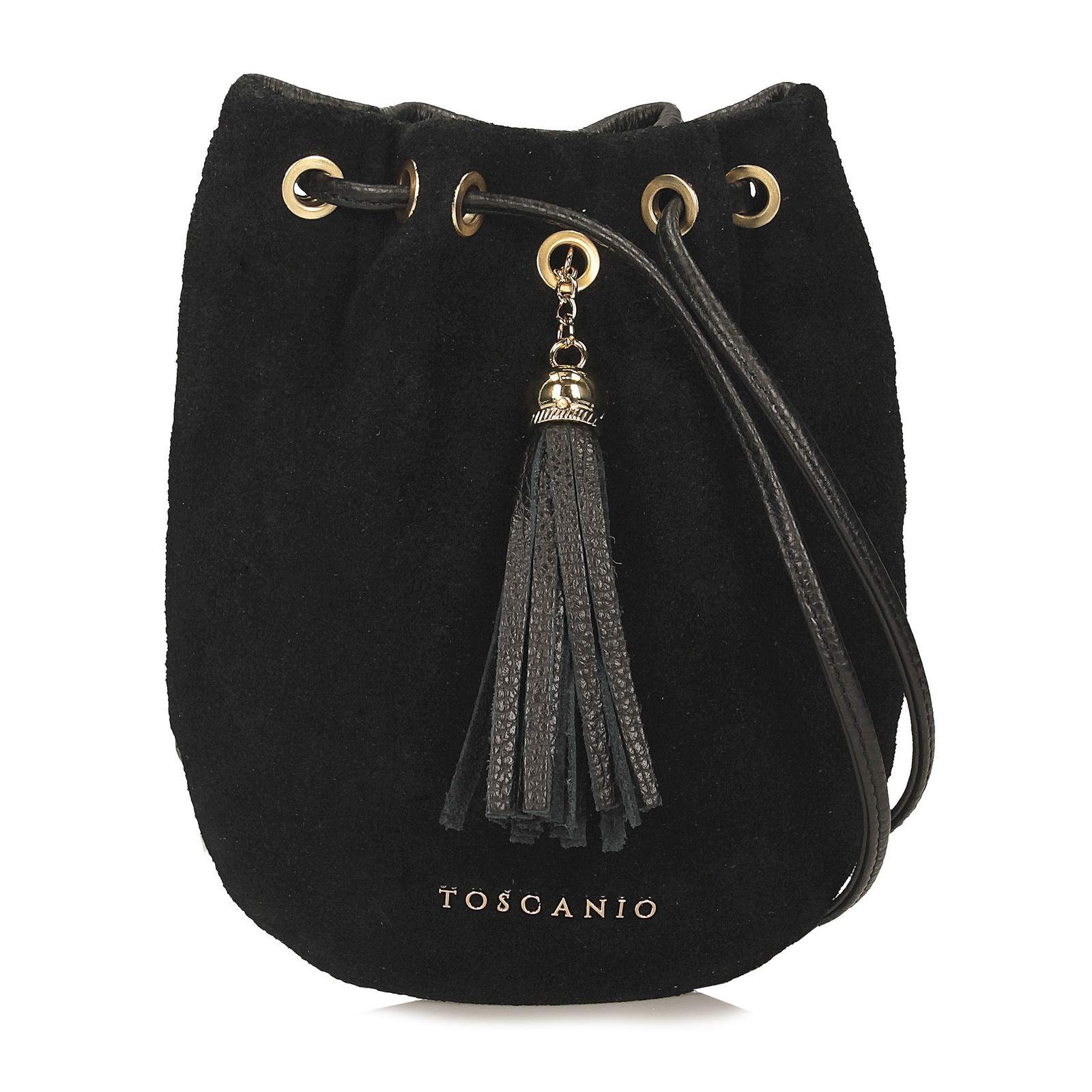 Czarna listonoszka Toscanio to subtelny i wyjątkowo stylowy model w formie małego woreczka, który doskonale sprawdzi się jako elegancka kopertówka na pasku. Front torebki został wykonany z miękkiej skóry zamszowej, nadającej jej szlachetnego charakteru, natomiast pozostałe elementy ze skóry naturalnej groszkowej. Górna część torebki jest ściągana, co dodaje jej lekkości i niebanalnego wyglądu. Model zamykany jest na magnes, a ozdobny brelok umieszczony z przodu stanowi stylowe dopełnienie całości. Wnętrze, wykończone trwałą podszewką, mieści jedną komorę, idealną na najpotrzebniejsze drobiazgi. Torebka posiada długi pasek ze skóry naturalnej o długości 125 cm, umożliwiający wygodne noszenie na ramieniu lub na skos. Złote detale dodają elegancji i sprawiają, że model ten świetnie uzupełni zarówno codzienne, jak i wieczorowe stylizacje.