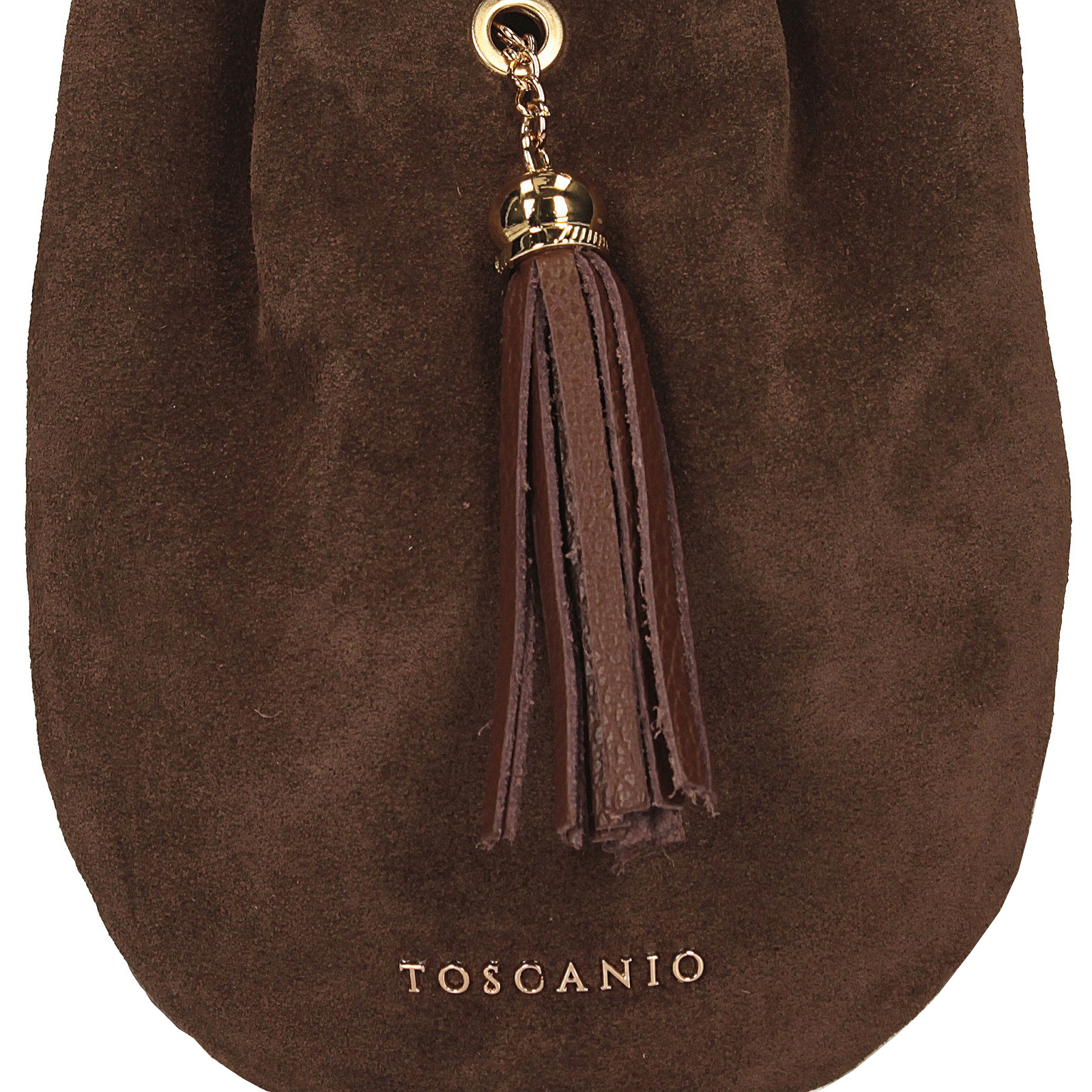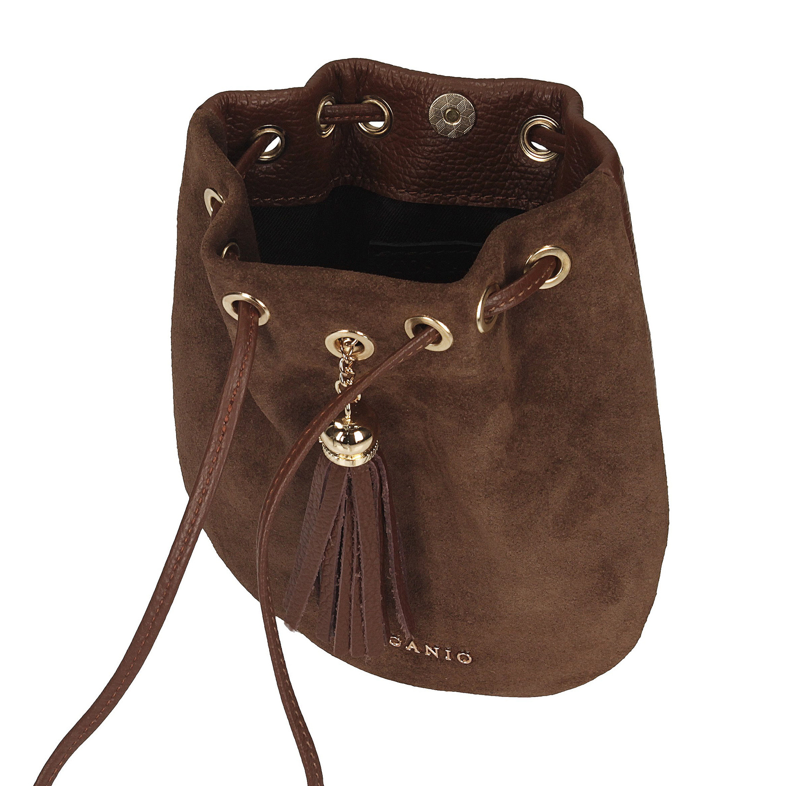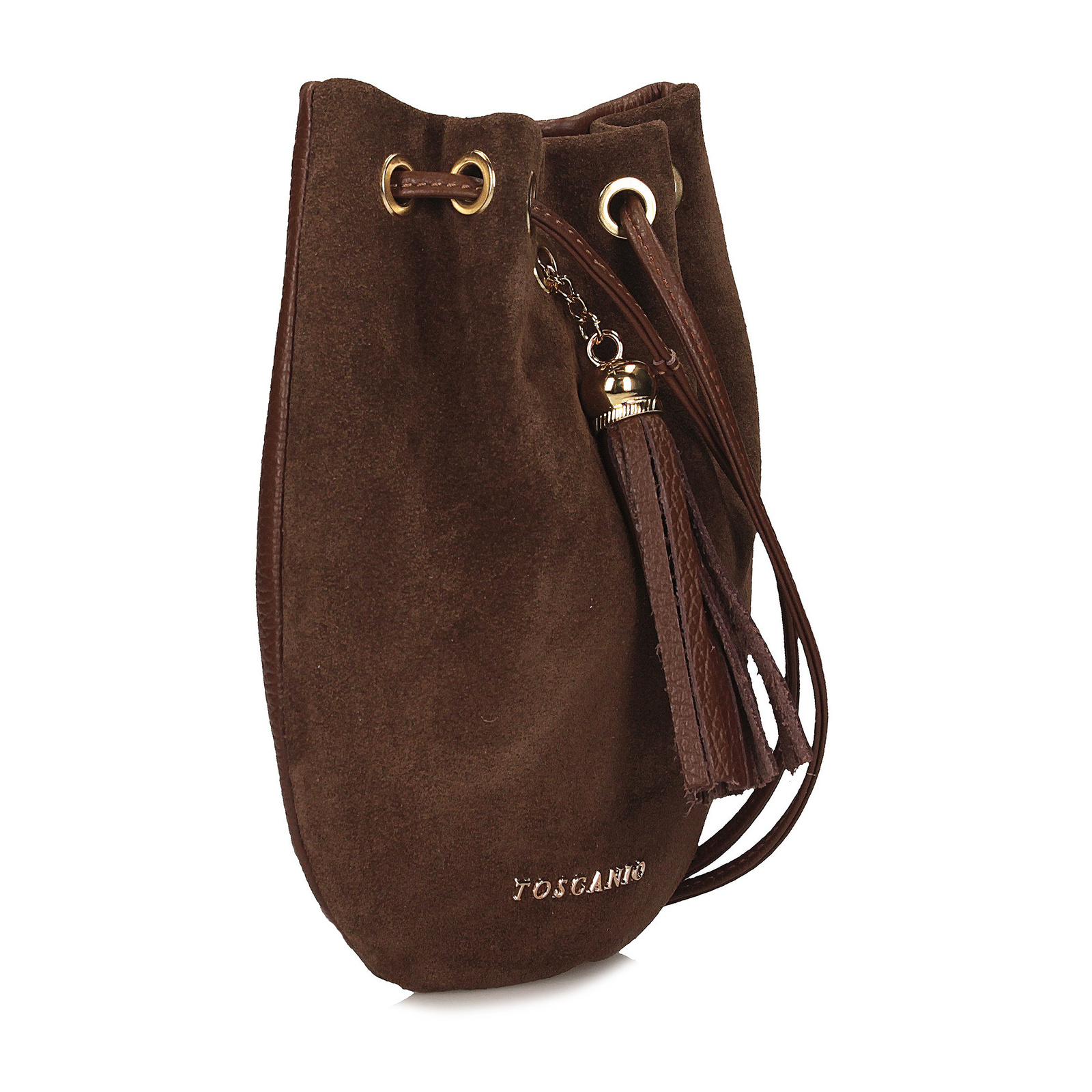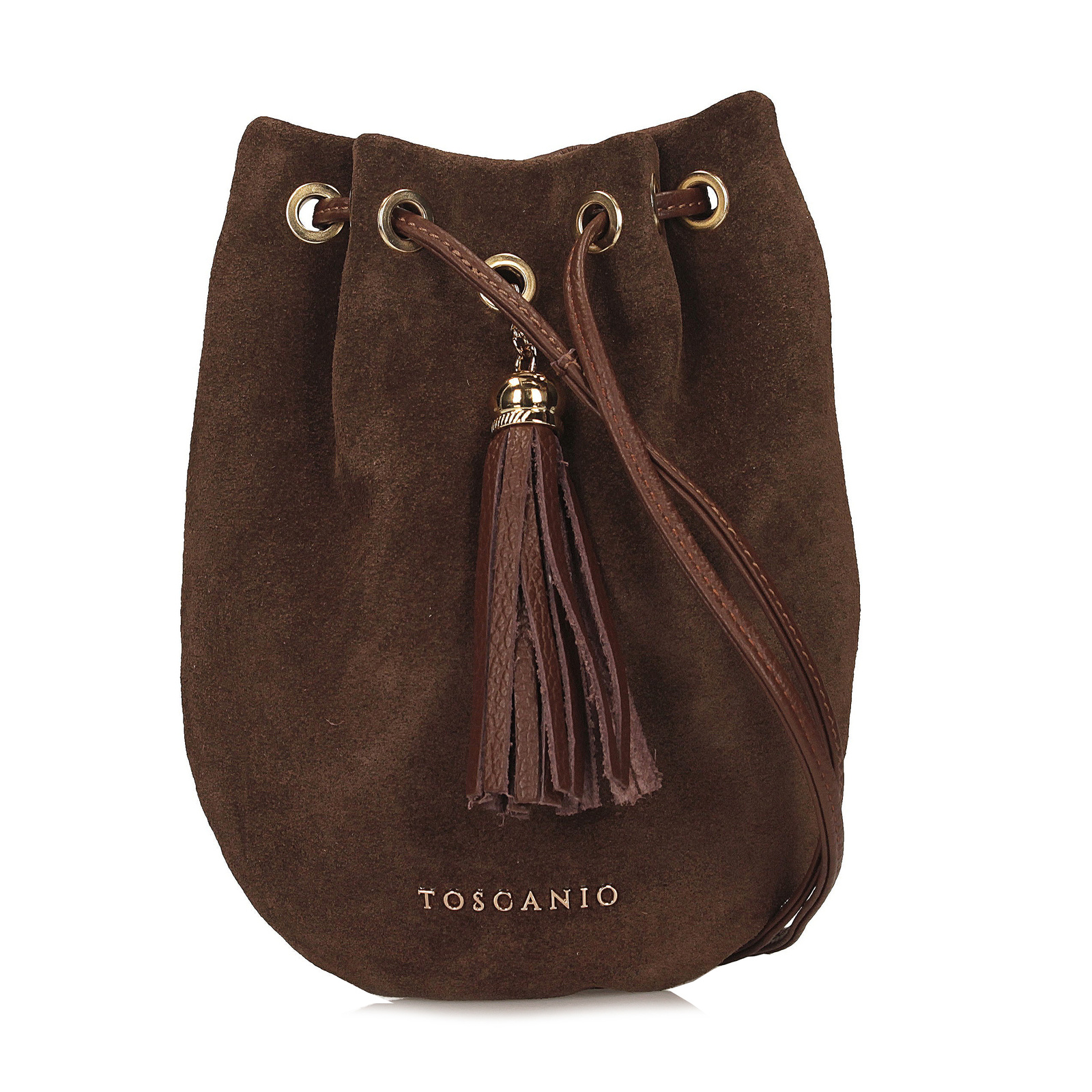 Brązowa listonoszka Toscanio to uroczy model w formie małego woreczka, który zachwyca prostotą i elegancją. Przód torebki zdobi miękka skóra zamszowa, harmonijnie zestawiona z resztą korpusu wykonaną z wysokiej jakości skóry naturalnej, co nadaje całości wyjątkowego charakteru. Górna część torebki jest ściągana, dzięki czemu model prezentuje się lekko i nowocześnie. Torebka zamykana jest na magnes, a ozdobny brelok z przodu podkreśla jej stylowy wygląd. Wnętrze wykończone tkaniną kryje jedną komorę, idealną na drobiazgi potrzebne w ciągu dnia lub na wieczorne wyjście. Długi pasek ze skóry naturalnej o długości 125 cm pozwala na wygodne noszenie na ramieniu lub crossbody. Złote detale pięknie dopełniają ciepły odcień brązu, sprawiając, że torebka doskonale pasuje do wielu stylizacji.