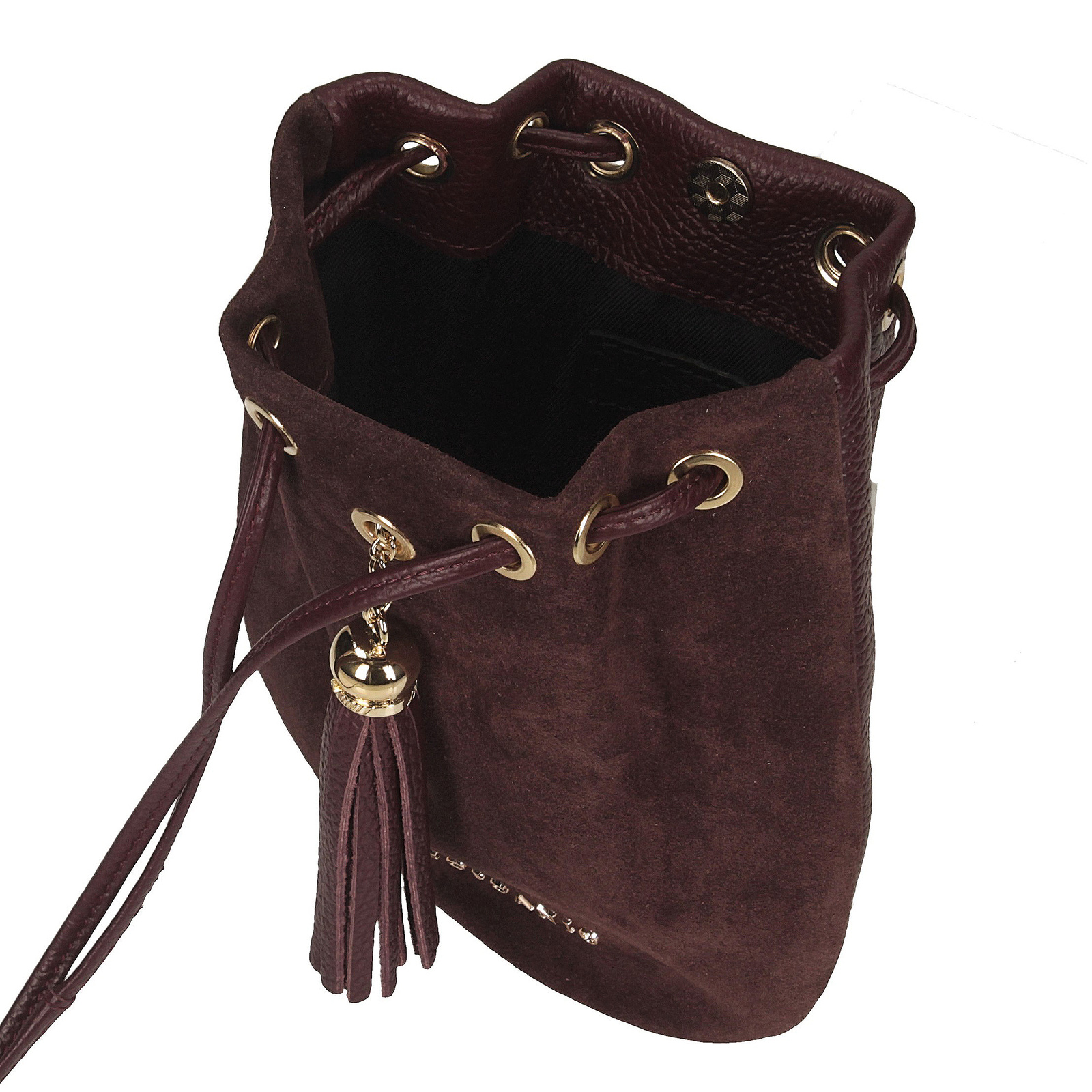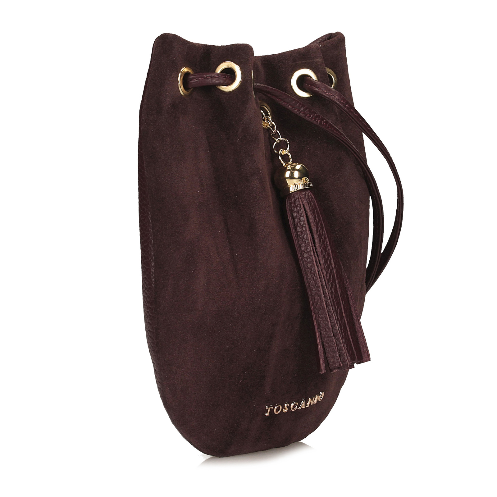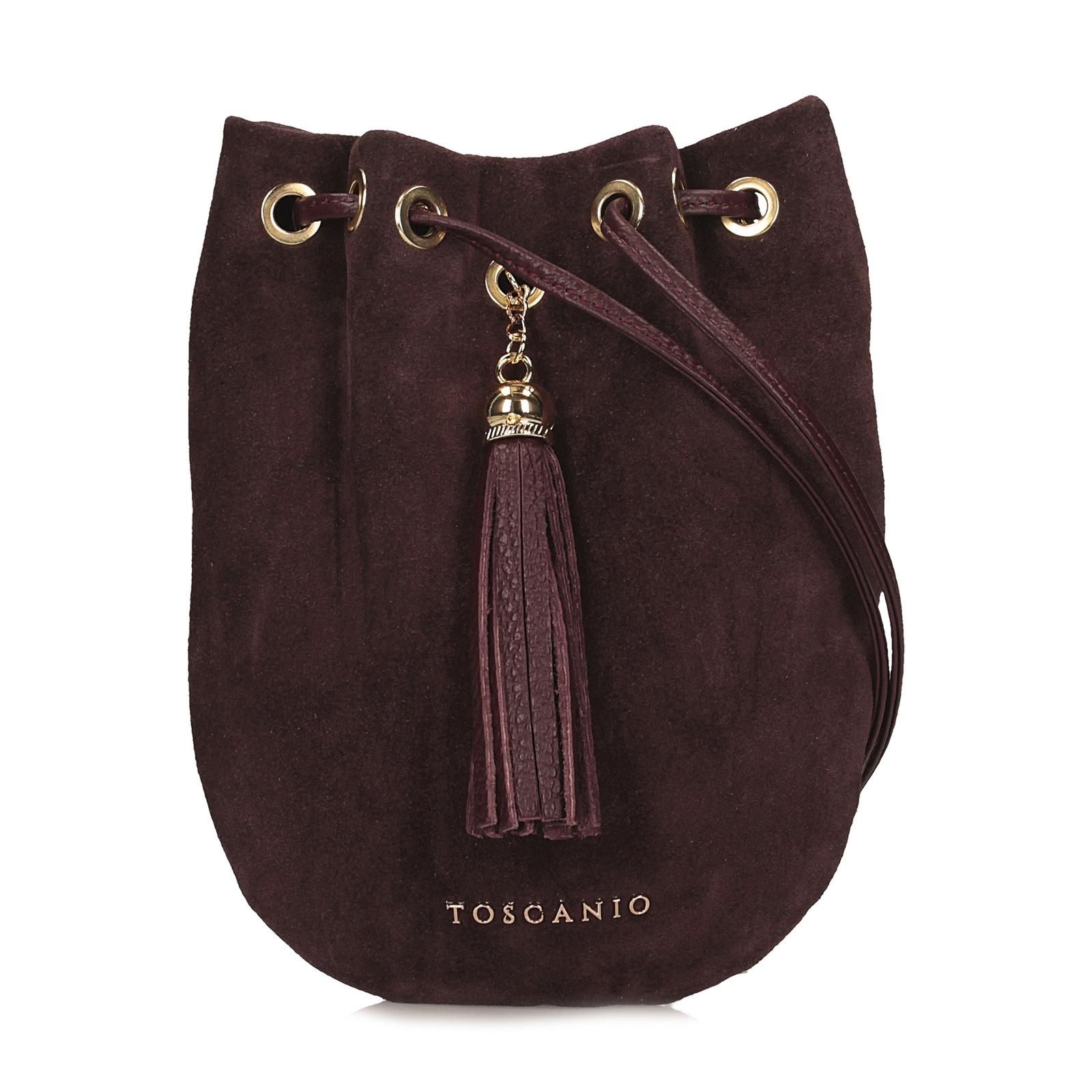 Bordowa listonoszka Toscanio to wyjątkowy model o formie małego woreczka, który łączy w sobie subtelność i elegancję. Przód torebki wykonano z miękkiej skóry zamszowej, która pięknie kontrastuje z resztą korpusu ze skóry naturalnej, tworząc szlachetny i ponadczasowy efekt. Górna część torebki jest ściągana, co nadaje jej lekkości i oryginalnego charakteru. Model zamykany jest na magnes, a ozdobny brelok umieszczony z przodu stanowi stylowy akcent, podkreślający unikatowy design. Wnętrze wykończone podszewką kryje jedną komorę, odpowiednią na drobne przedmioty niezbędne w ciągu dnia czy wieczoru. Długi pasek ze skóry naturalnej o długości 125 cm umożliwia wygodne noszenie zarówno na ramieniu, jak i crossbody. Złote detale pięknie komponują się z odcieniem bordo, czyniąc tę torebkę eleganckim dodatkiem na różne okazje.