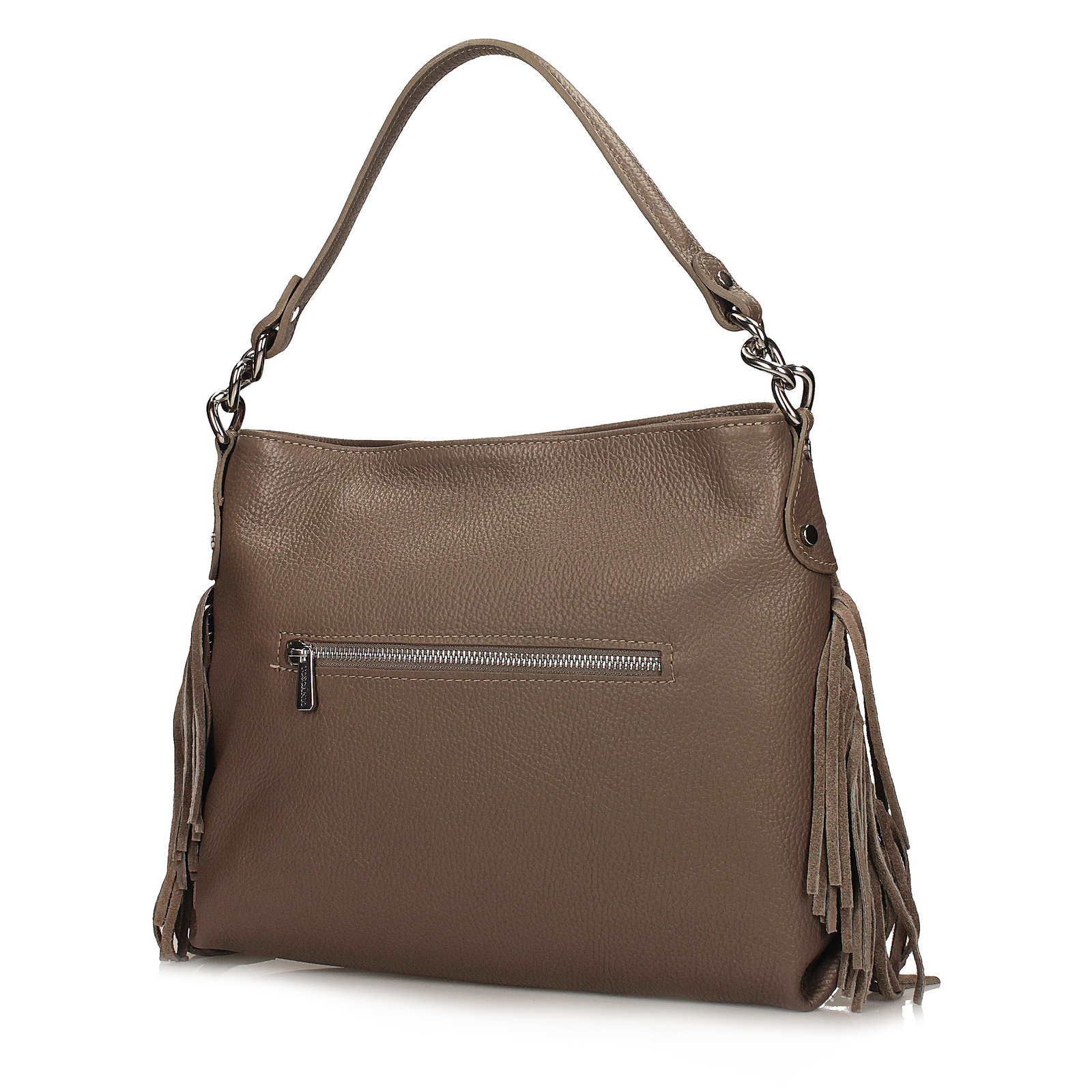 Beżowa torebka typu worek marki Toscanio to doskonałe połączenie wygody i stylu boho. Wykonana z wysokiej jakości skóry naturalnej, zachwyca przodem wykończonym miękką skórą zamszową oraz dekoracyjnymi frędzlami po bokach, które nadają jej swobodnego, lekko etnicznego charakteru. Wnętrze skrywa jedną komorę i dwie kieszenie, a dodatkowa kieszeń zewnętrzna zapewnia szybki dostęp do najpotrzebniejszych drobiazgów. Całość zamykana jest na metalowy zamek w kolorze srebrnym. Dzięki wygodnym uchwytom o długości 45 cm, torebkę można nosić zarówno na ramieniu, jak i w dłoni. Niewielki rozmiar sprawia, że model ten nie mieści formatu A4, ale idealnie sprawdzi się na co dzień, uzupełniając lekkie, kobiece stylizacje.