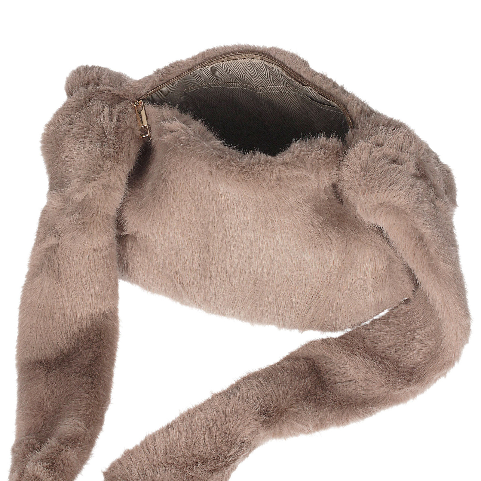 Wnętrze wyłożone tkaniną kryje jedną praktyczną komorę, idealną na najważniejsze drobiazgi. Torebka zapinana jest na zamek w złotym kolorze, który dodaje elegancji i delikatnego blasku. Dołączony pasek – również pokryty sztucznym futrem – pozwala wygodnie nosić ją na ramieniu.