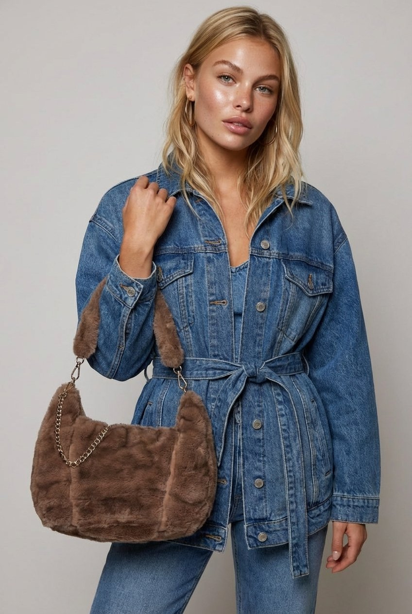 Wnętrze wyłożone tkaniną kryje jedną praktyczną komorę, idealną na najważniejsze drobiazgi. Torebka zapinana jest na zamek w złotym kolorze, który dodaje elegancji i delikatnego blasku. Dołączony pasek – również pokryty sztucznym futrem – pozwala wygodnie nosić ją na ramieniu.