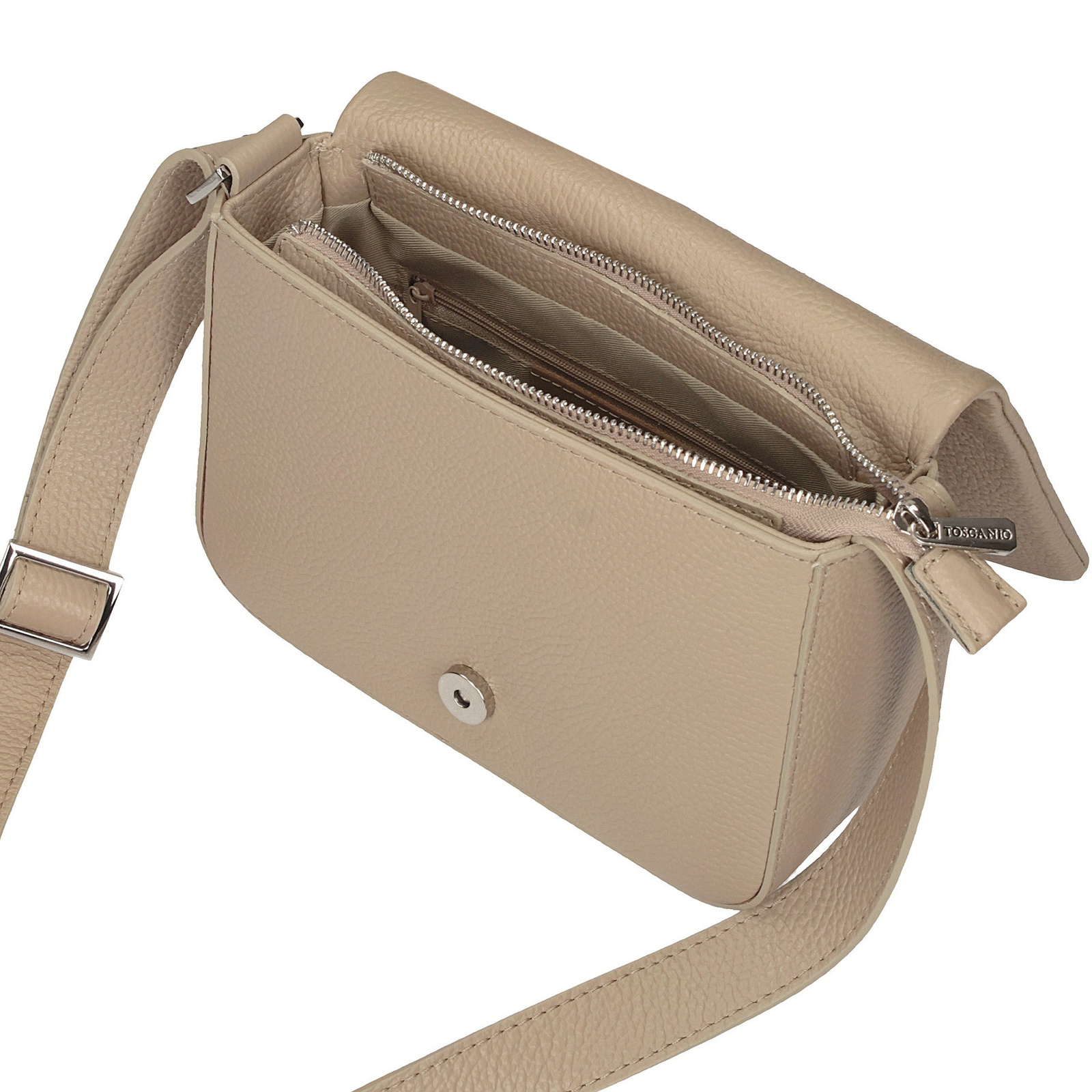 Torebka listonoszka Toscanio to połączenie elegancji, funkcjonalności i najwyższej jakości materiałów. Wykonana z naturalnej skóry licowej groszek w subtelnym beżowym odcieniu (kod koloru D05), doskonale komponuje się z wieloma stylizacjami. Jest to idealny wybór dla kobiet ceniących klasyczny design w połączeniu z nowoczesnymi detalami.