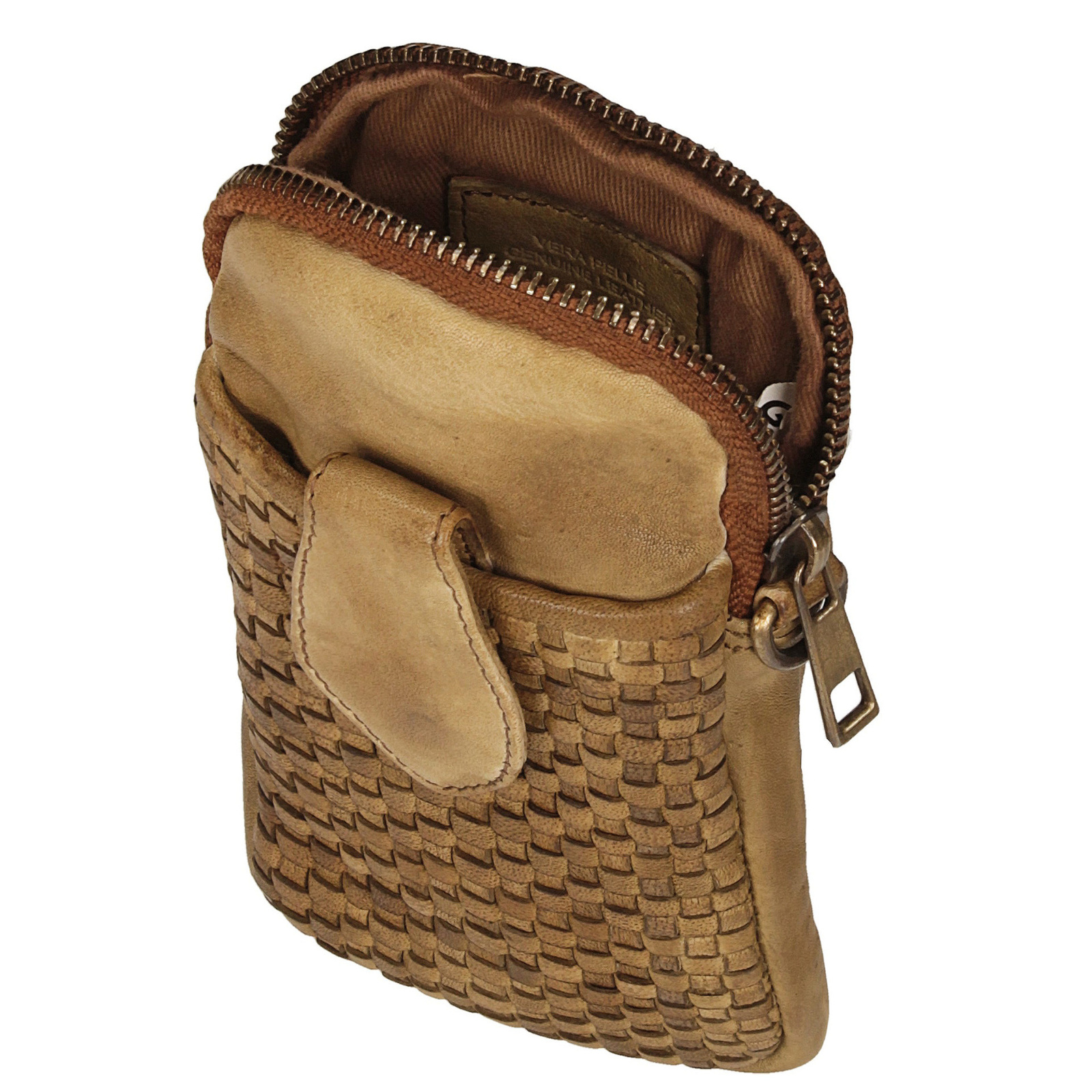 Saszetka wykonana z naturalnej, włoskiej skóry, wyposażona w jedną główną kieszonkę na zamek