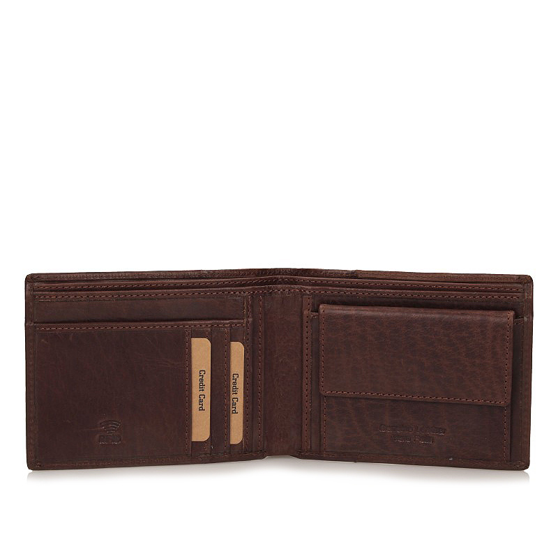 Portfel wykonany z naturalnej, włoskiej skóry, wyposażony w kilka kieszonek na karty, dwie kieszonki