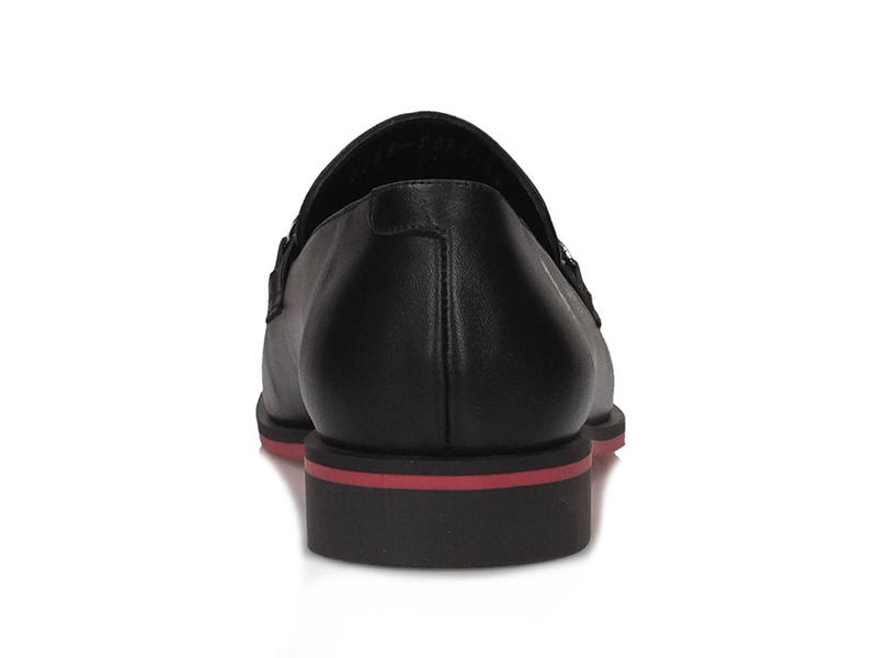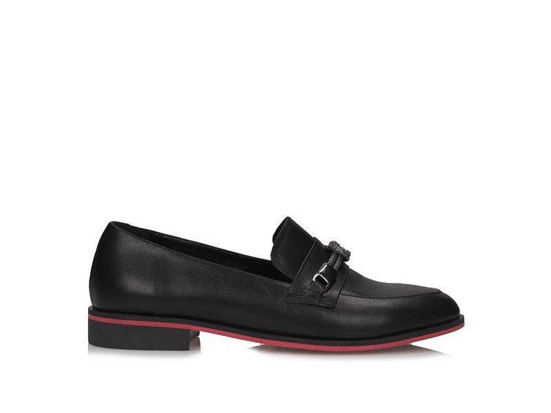 Naprzeciw nudzie- mokasyny czarne, ale z ciekawym bordowym otokiem na podeszwie oraz metalicznym supłem na podbiciu, niby klasycznie, a jednak....
