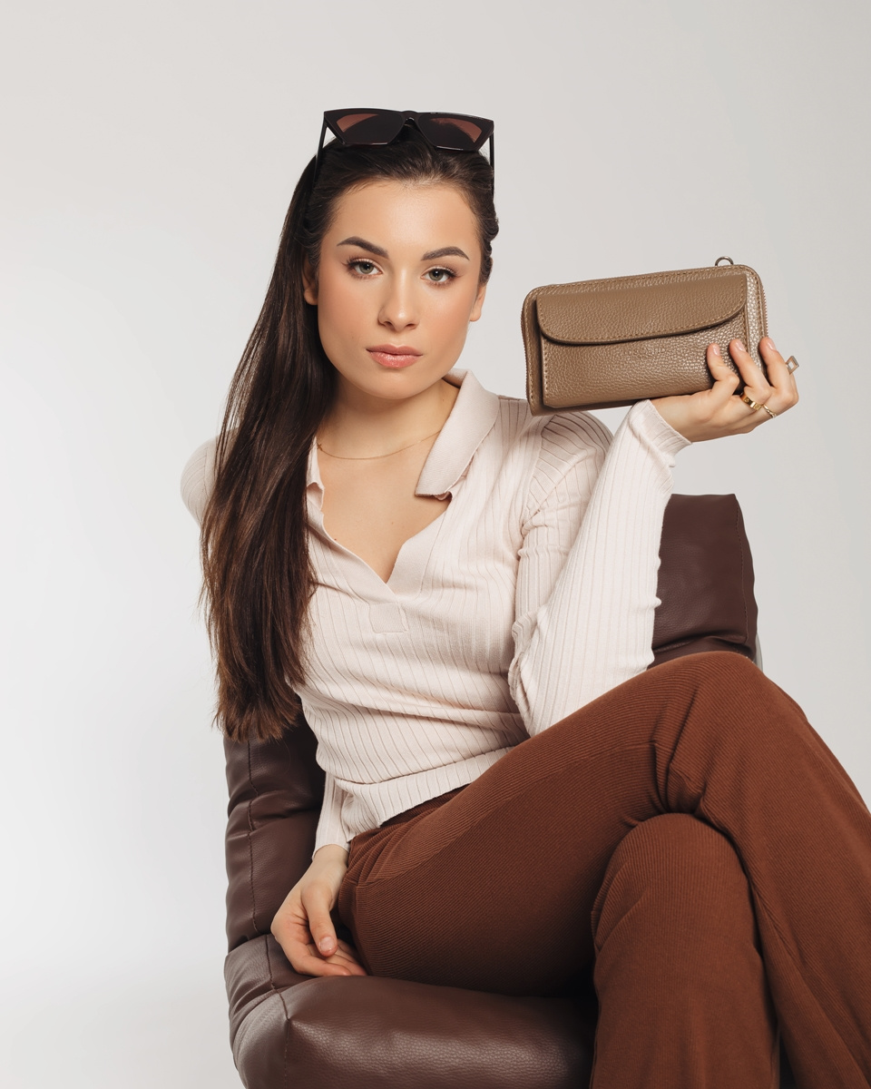 Torebka wykonana z naturalnej, groszkowej skóry, wyposażona w dwie komory, jedna z nich