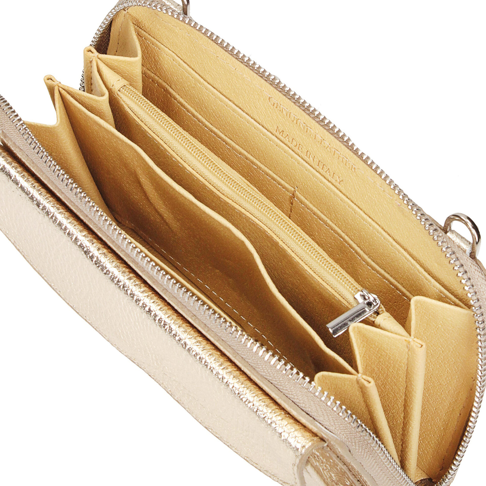 zamek, wyposażona w kieszonki na karty, banknoty oraz jedną zapinaną na suwak, z przeznaczeniem