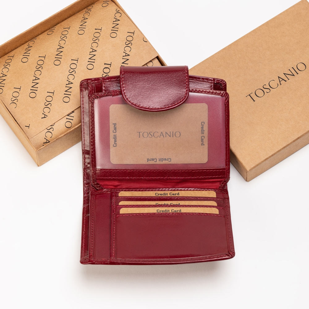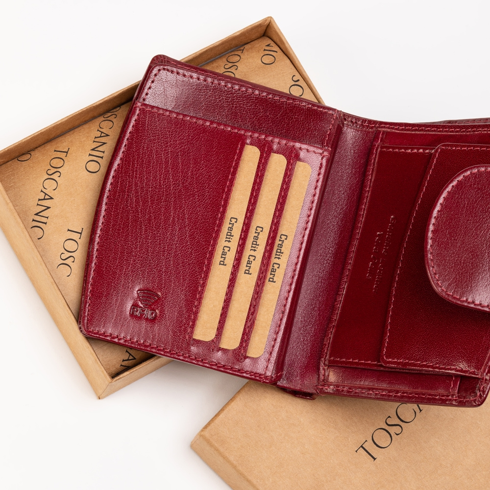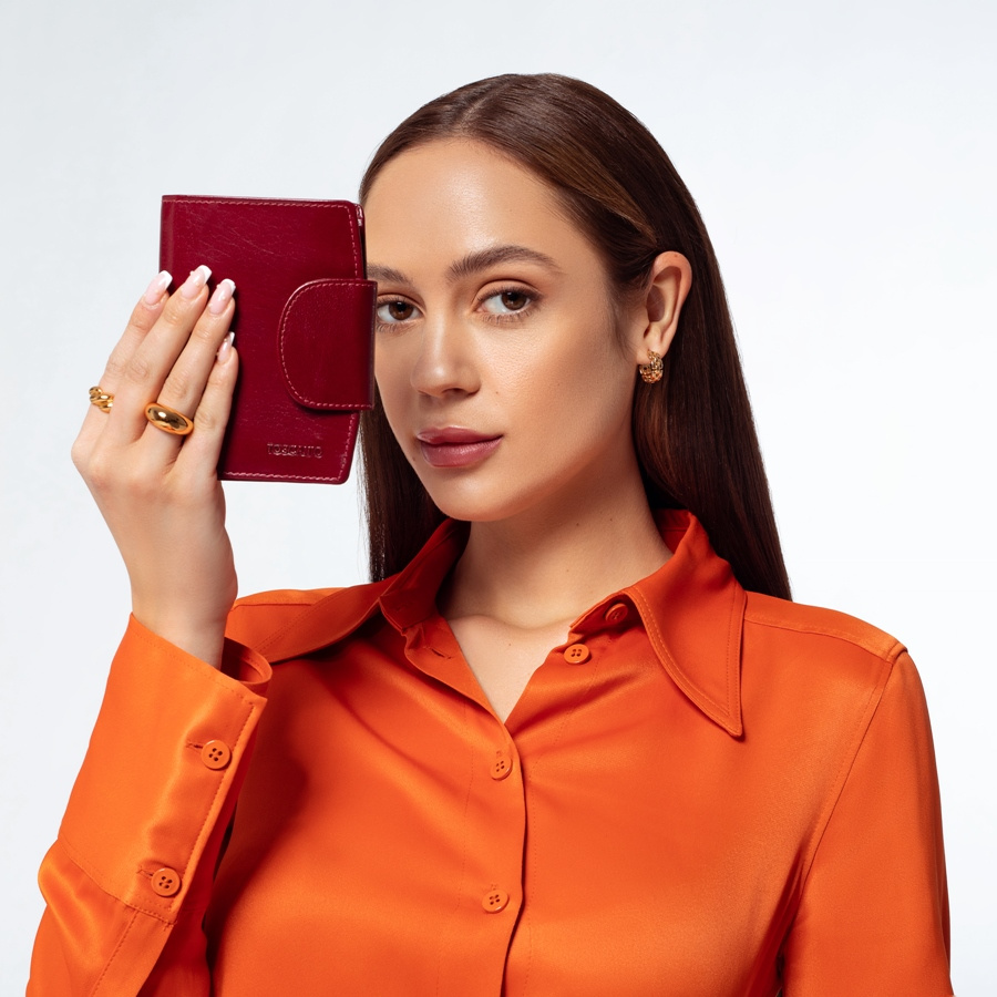 Portfel wykonany z naturalnej, włoskiej skóry, zamykany za pomocą paska z klipsem, w środku