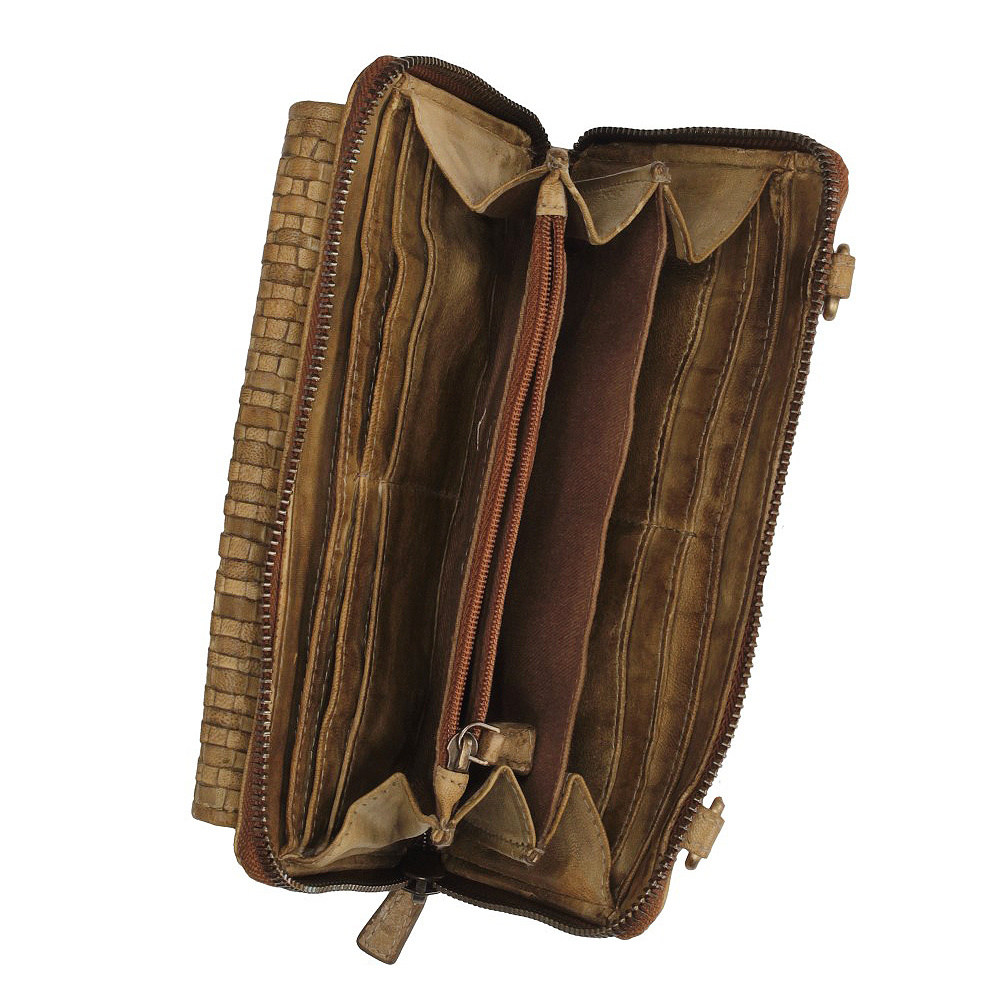 pomocą zamka, wewnątrz zawierającą mnóstwo kieszonek: na karty, na banknoty, na monety. Na