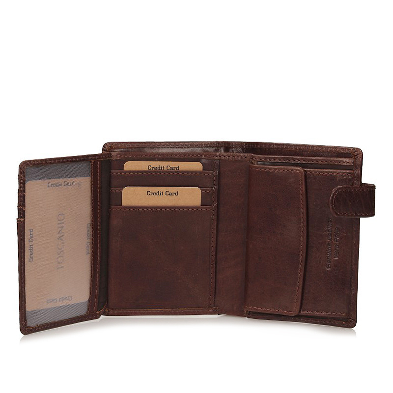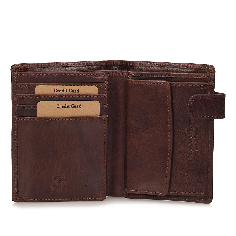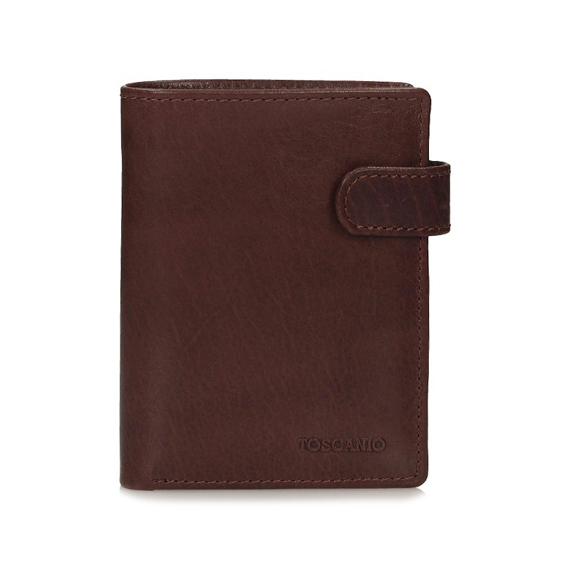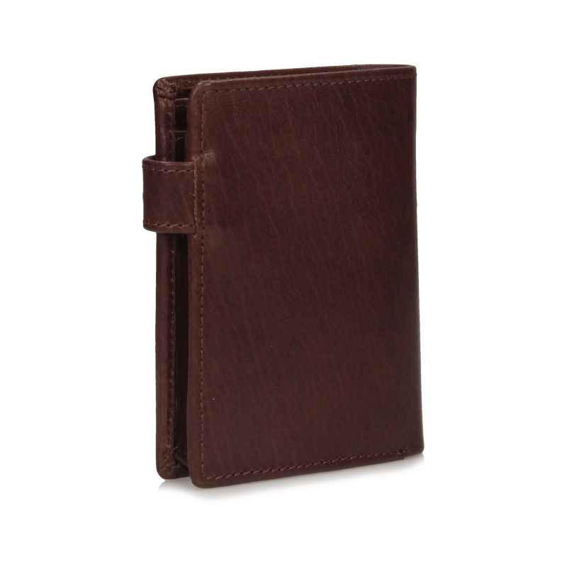 Portfel wykonany z naturalnej, włoskiej skóry, zamykany za pomocą paska z klipsem, w środku