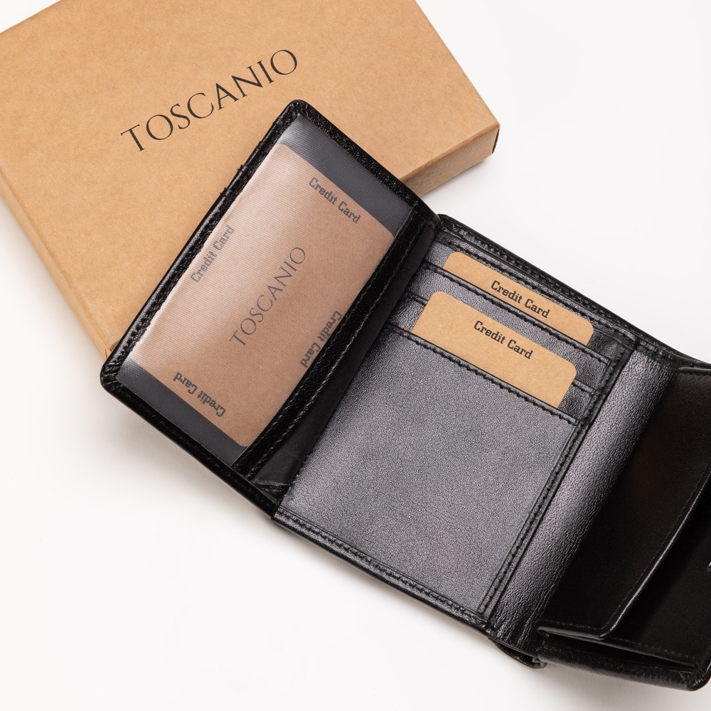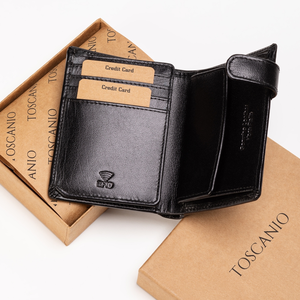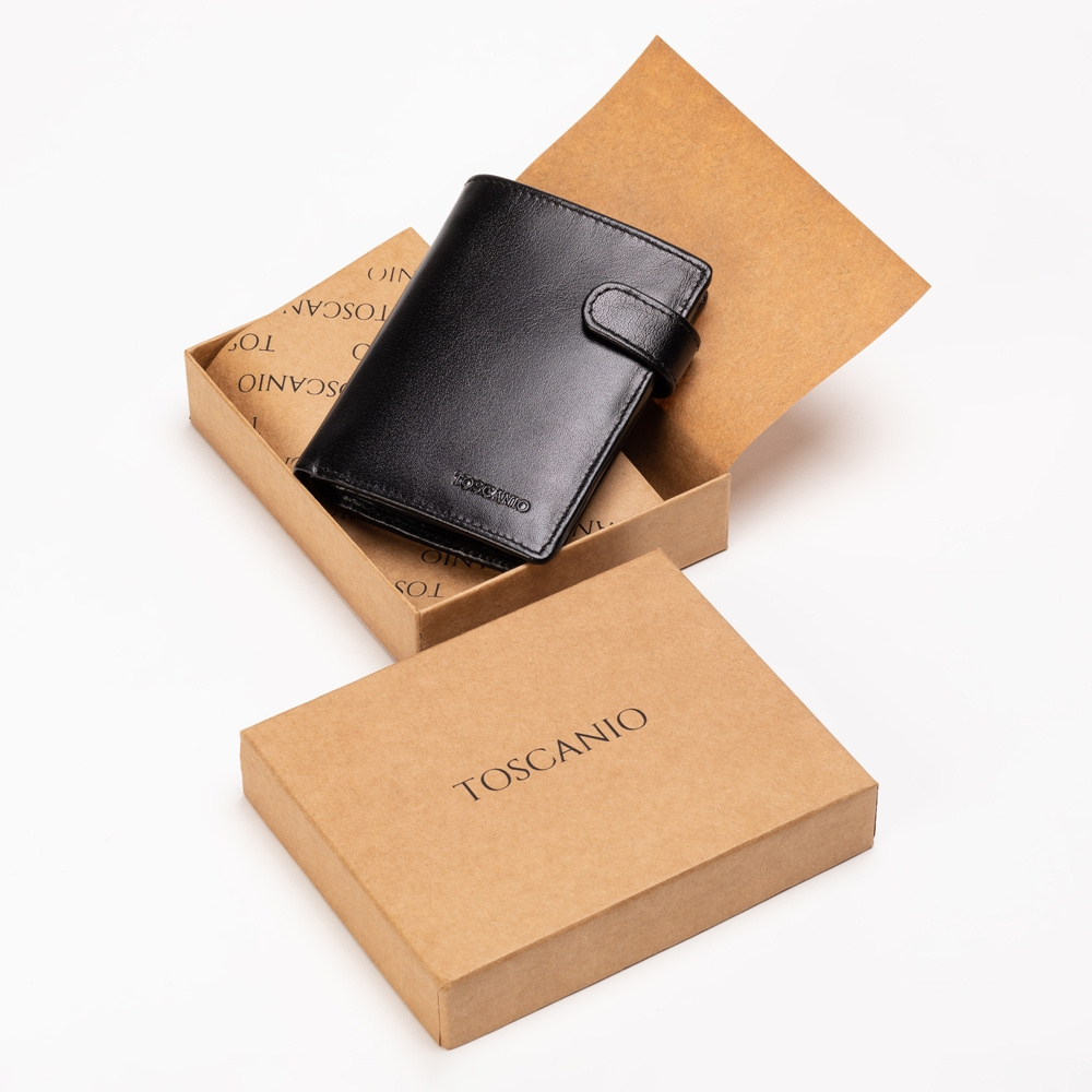 Portfel wykonany z naturalnej, włoskiej skóry, zamykany za pomocą paska z klipsem, w środku