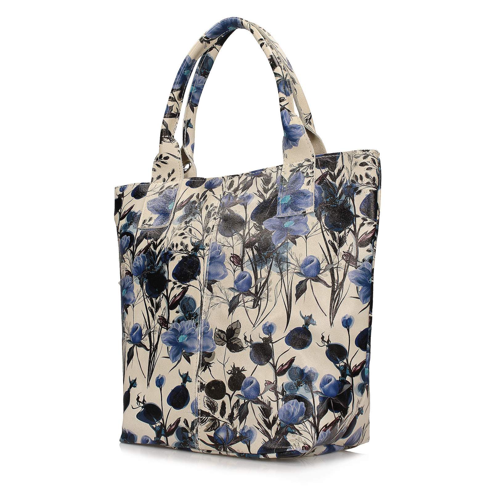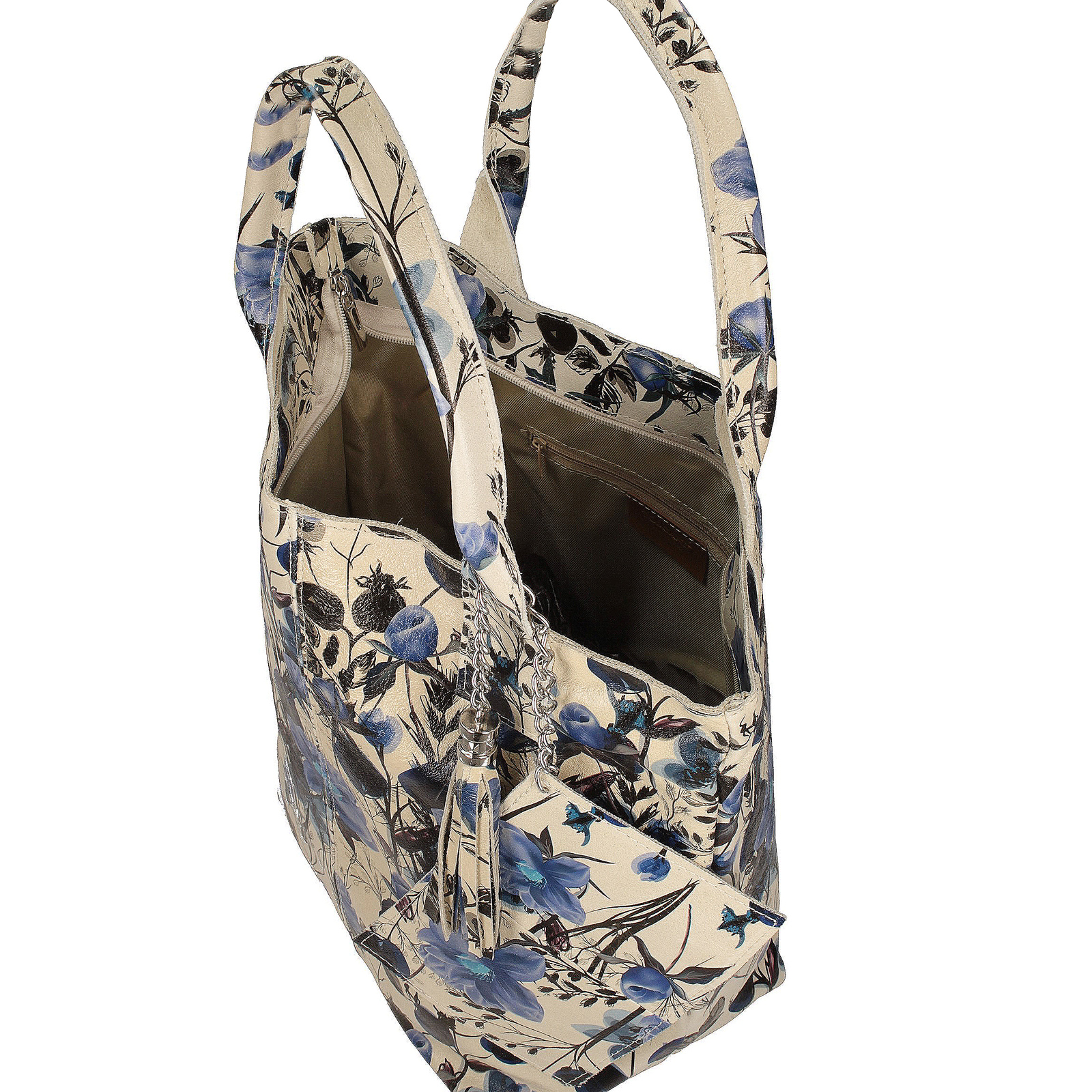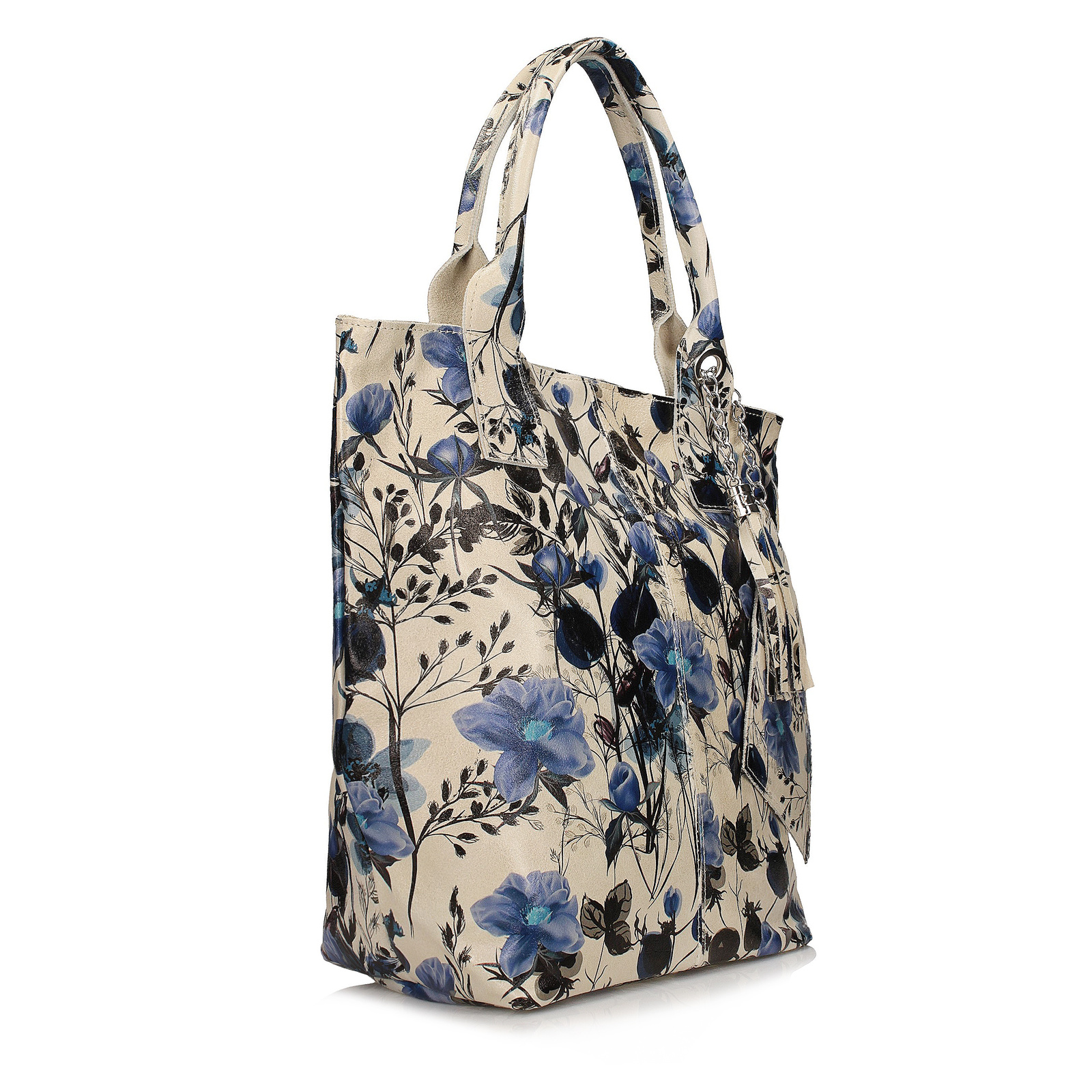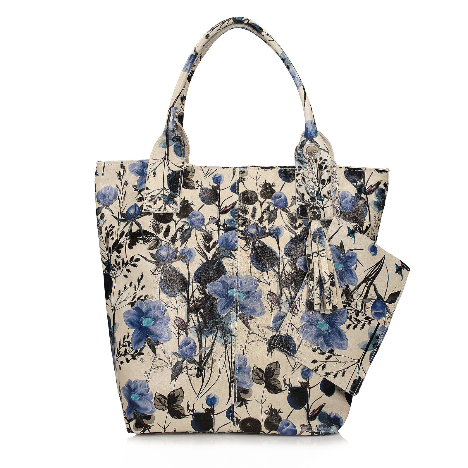 Torebka wykonana z naturalnej, włoskiej, foliowanej skóry. Jest to torebka typu szoperka, posiada jedną komorę, zapinaną na zamek, która w środku posiada mniejszą kieszeń, również na zamek. Cechą, wyróżniającą torebkę jest dołączona mała przegródka na złotym łańcuszku, zakończonym frędzelkiem. Przedmiot wyposażony jest w uszy, pozwalające nosić przedmiot na ramieniu.Torebka posiada podszewk z nadrukiem toscanio.