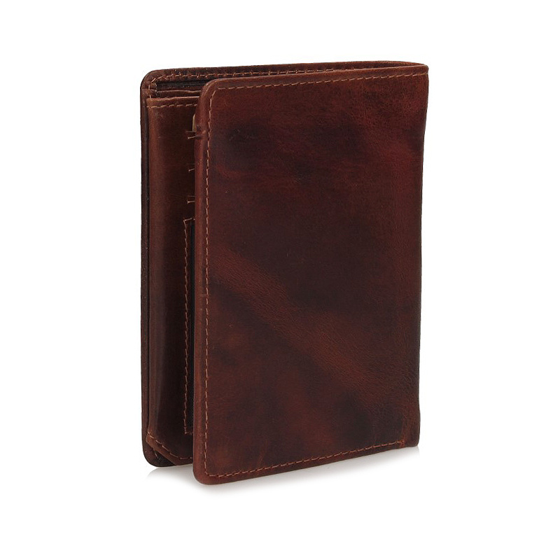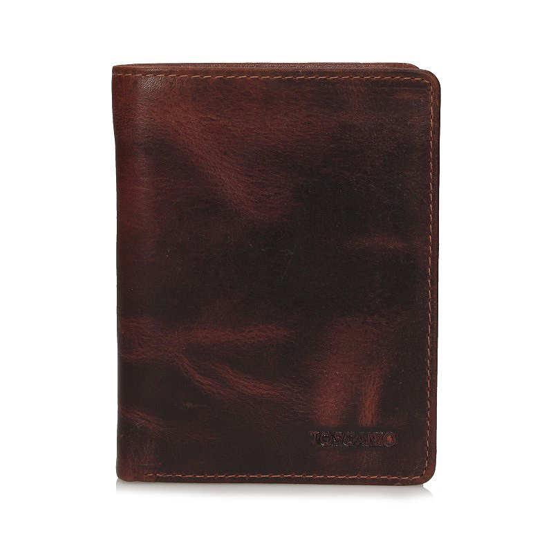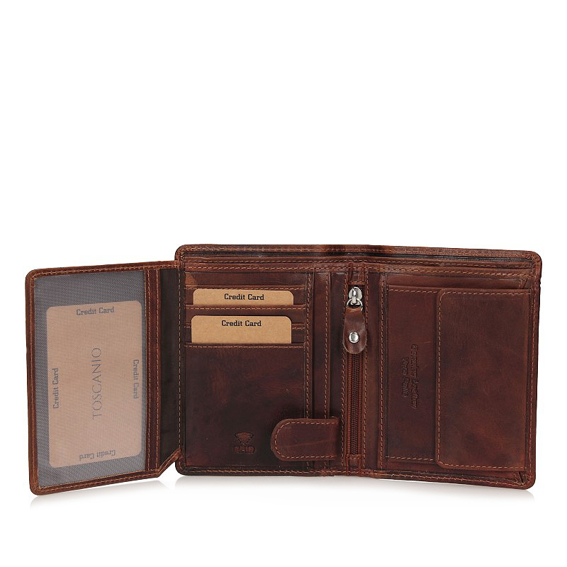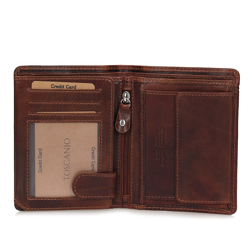 Portfel wykonany z naturalnej, włoskiej skóry, wyposażony w jedną przegródkę zamykaną za pomocą