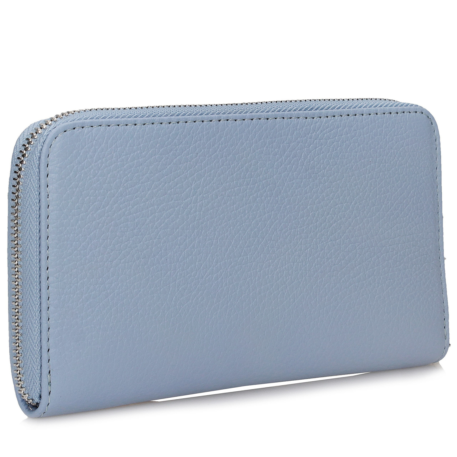 Portfel wykonany z naturalnej, groszkowej skóry, wyposażony w jedną komorę, zamykaną za pomocą