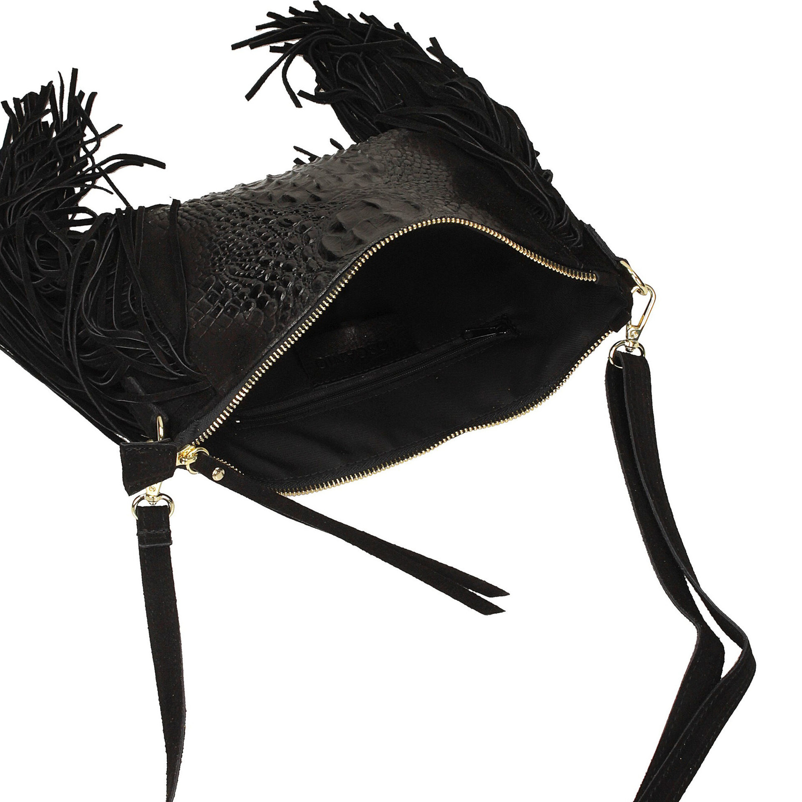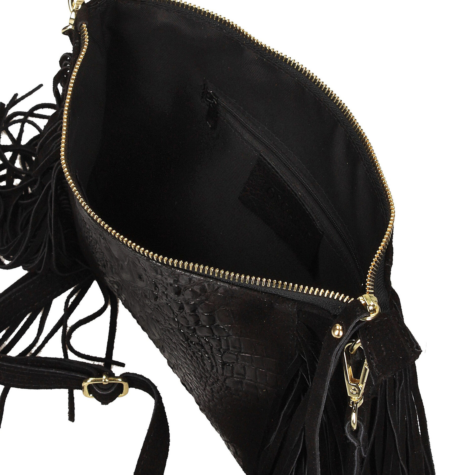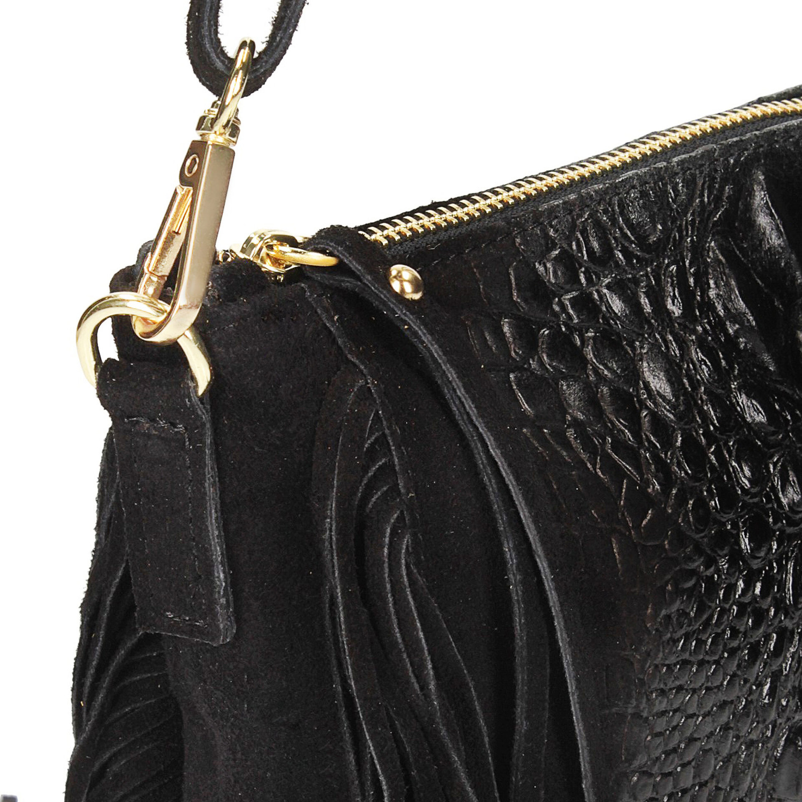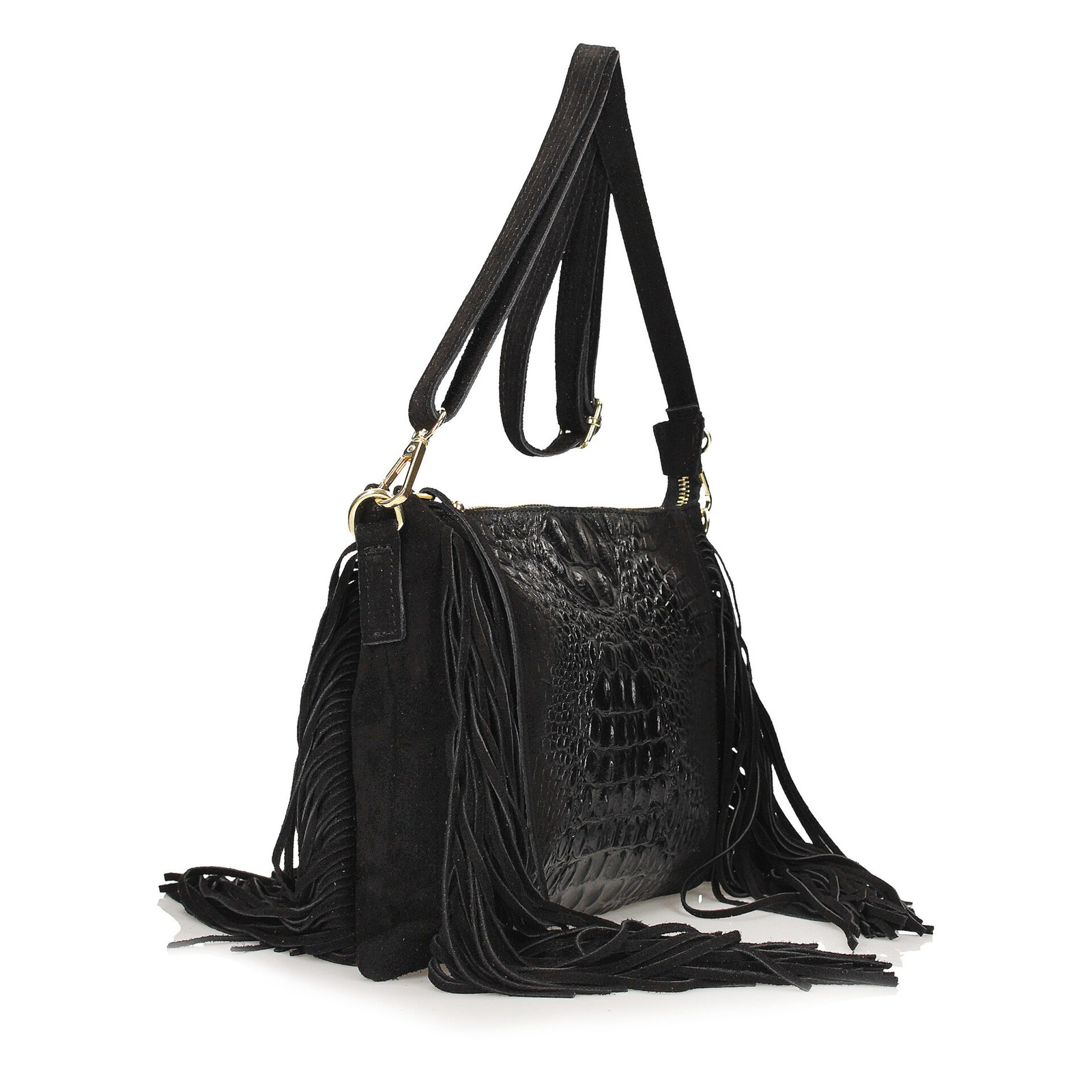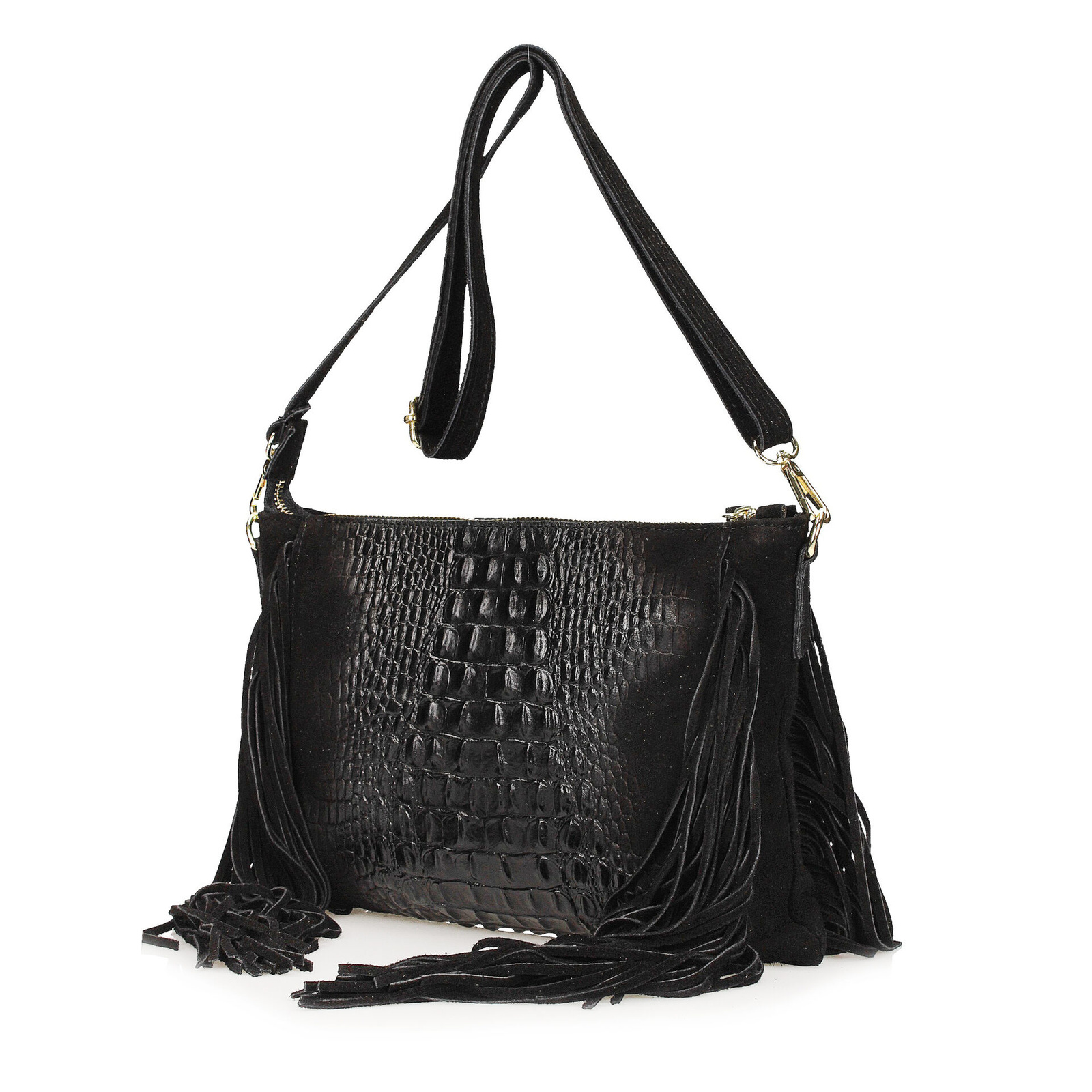 Czarna listonoszka Toscanio to połączenie klasycznej elegancji z odrobiną nonszalancji. Wykonana z miękkiego weluru o tłoczeniu przypominającym skórę krokodyla, przyciąga uwagę subtelną fakturą i wykończeniem. Charakterystyczne frędzle po bokach dodają jej lekkości i wyjątkowego charakteru. Złote zapięcie efektownie kontrastuje z głęboką czernią materiału, podkreślając wyrafinowany styl torebki. Dzięki długiemu paskowi ze skóry naturalnej model można wygodnie nosić na ramieniu lub na ukos. Funkcjonalne wnętrze z dwiema kieszeniami sprawdzi się w codziennym użytkowaniu. Idealna zarówno do miejskich, jak i bardziej kobiecych stylizacji.
